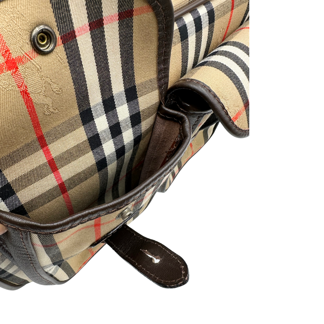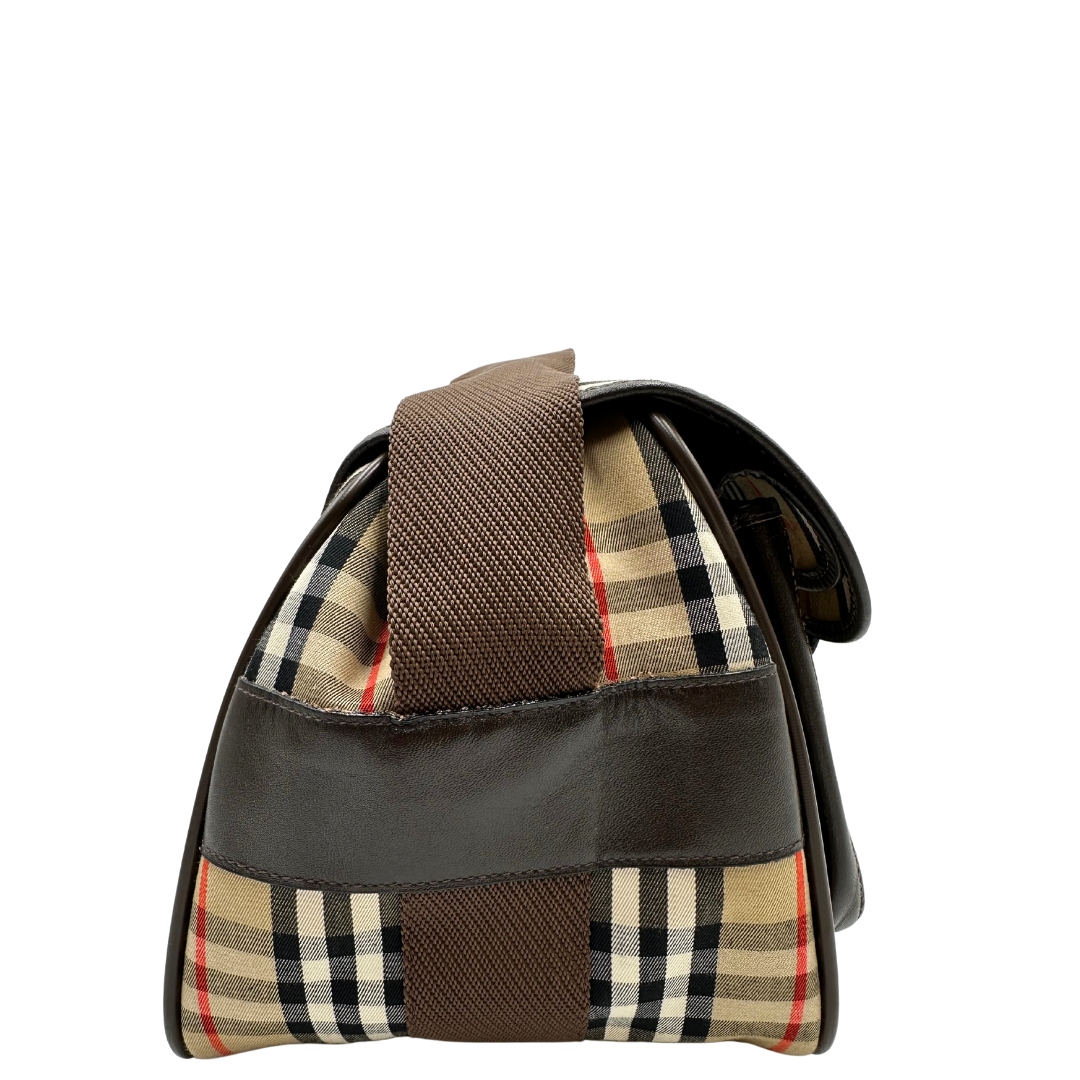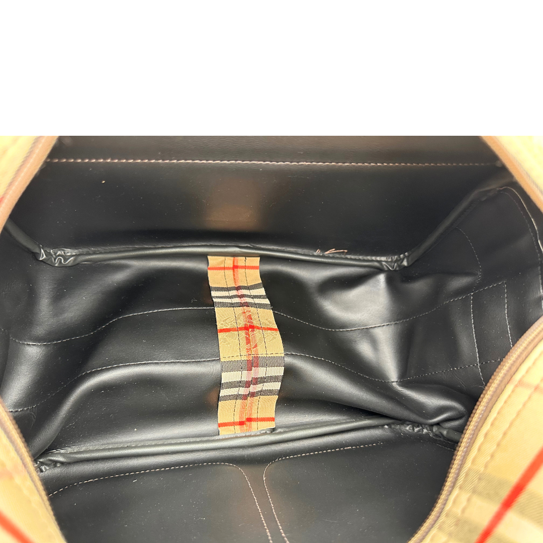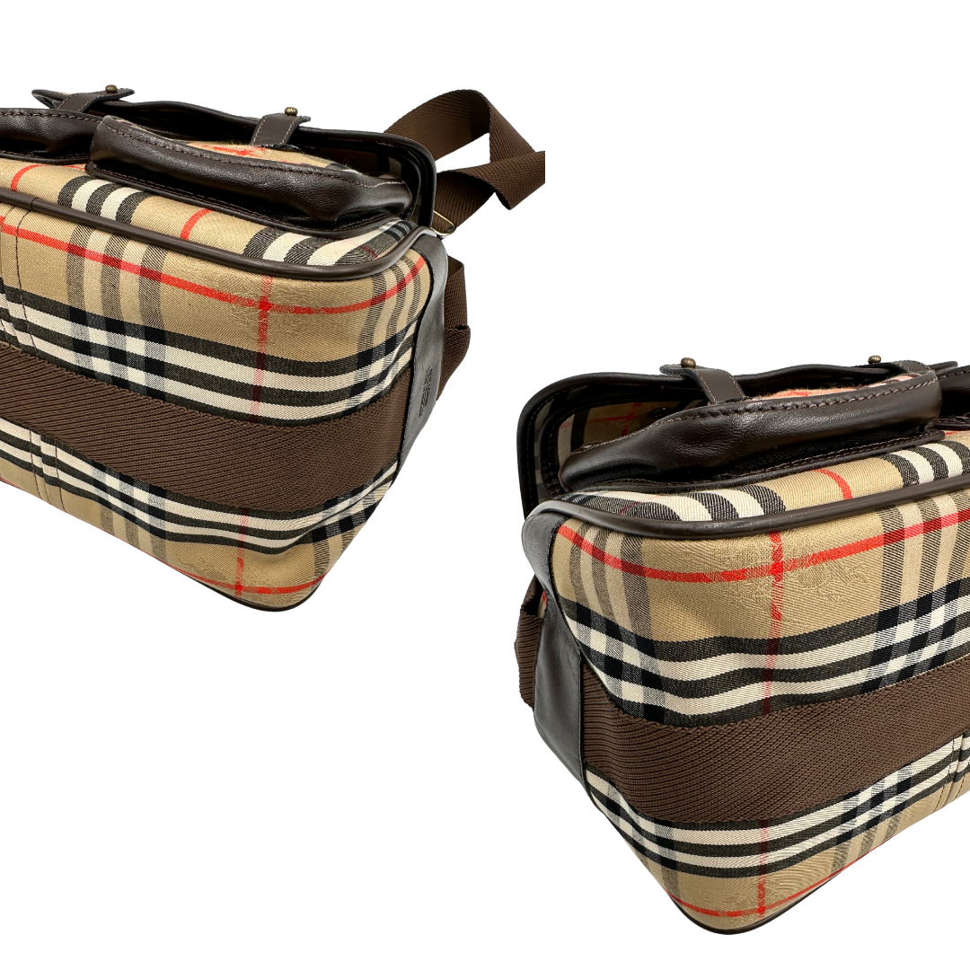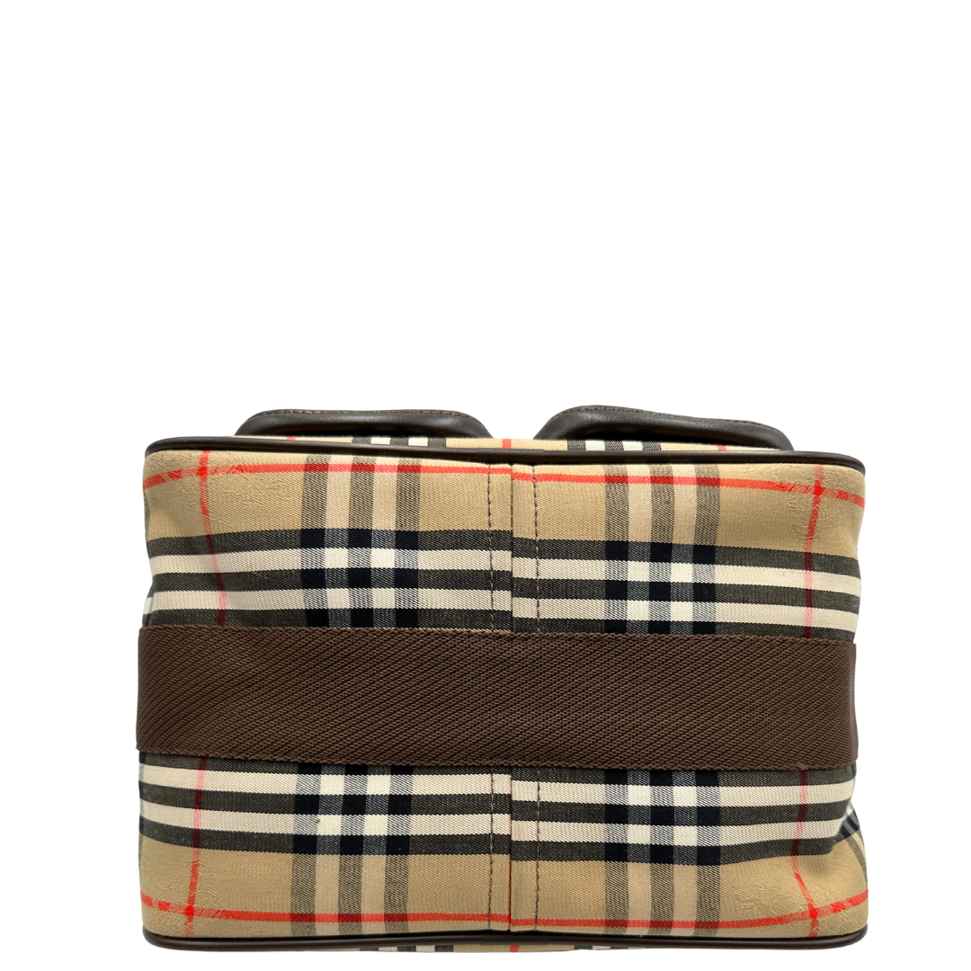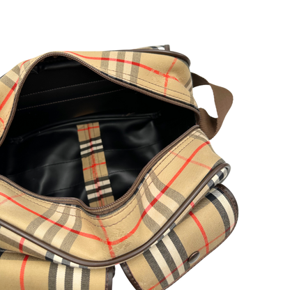 Descrizione: Cartella Burberry in tessuto beige tartan con finiture in pelle testa di moro, tracolla in tessuto regolabile e parti metalliche dorate. Completa di dustbag