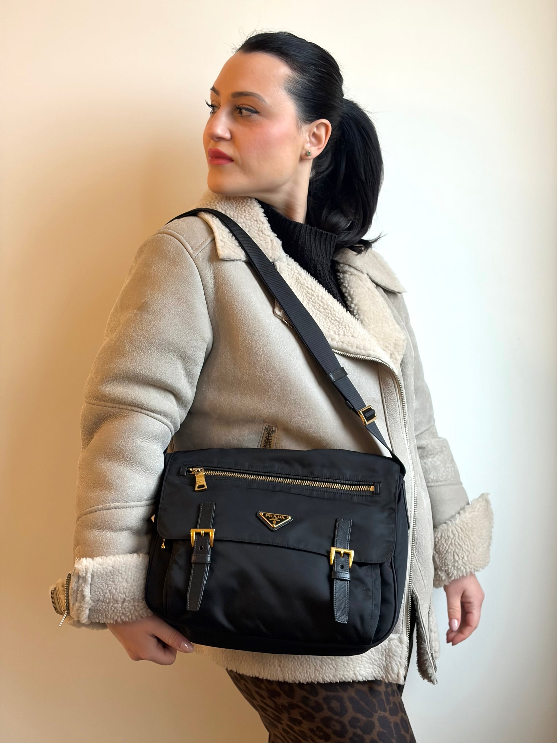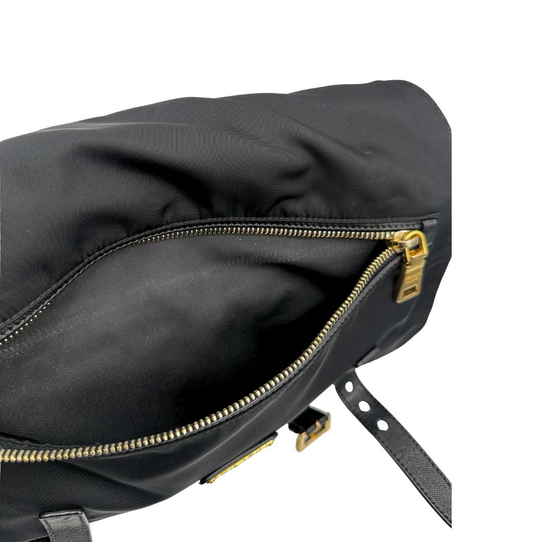Descrizione: Borsa Prada in nylon nero con finiture in pelle tono su tono e parti metalliche dorate; munita di una tracolla regolabile in tessuto. Completa di dustbag