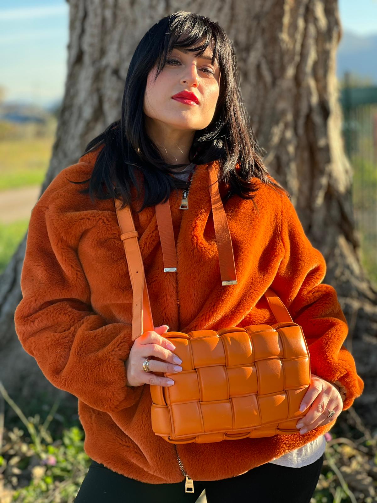 Descrizione: Borsa Bottega Veneta in pelle arancione matelassé motivo intreccio con parti metalliche dorate. Completa di dustbag.