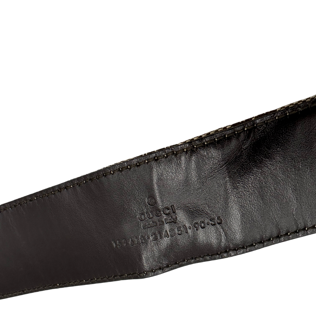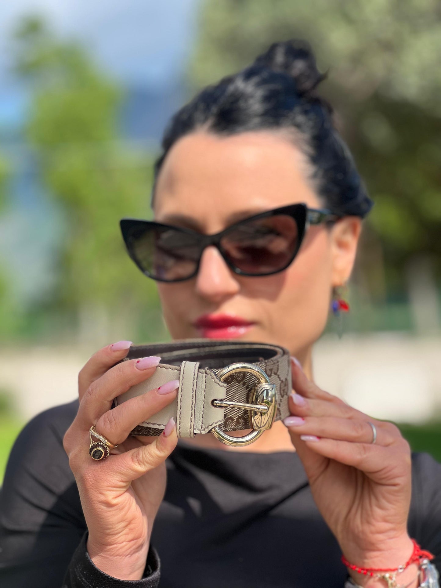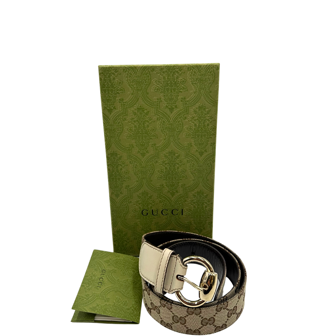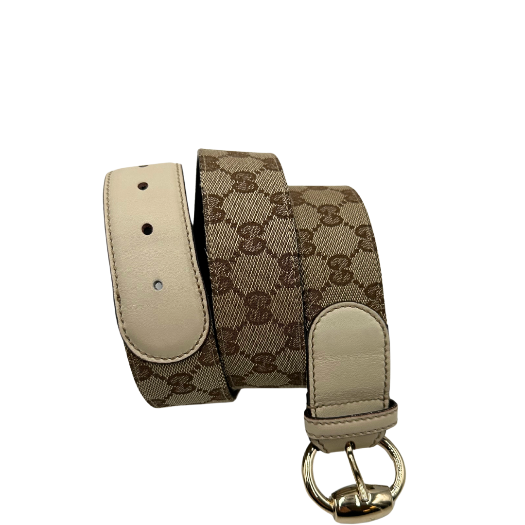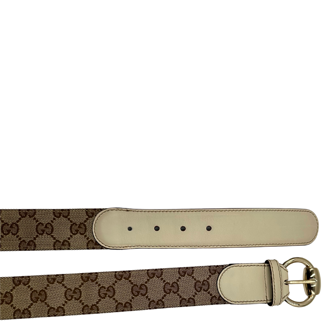 Descrizione: Cintura Gucci in tessuto beige GG con dettagli in pelle avorio e fibbia in metallo dorato. Completa di corredo