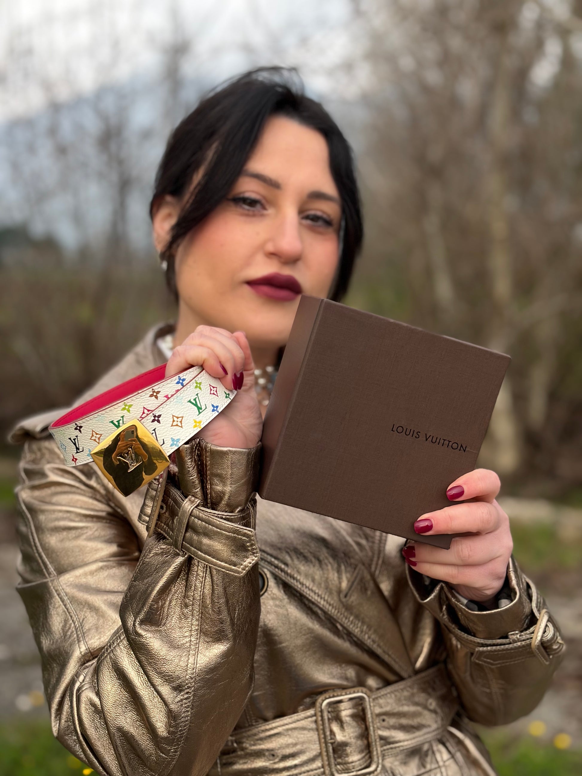 Descrizione: Cintura Louis Vuitton in canvas bianco con trama monogram multicolore e fibbia in metallo dorato. Completa di corredo
