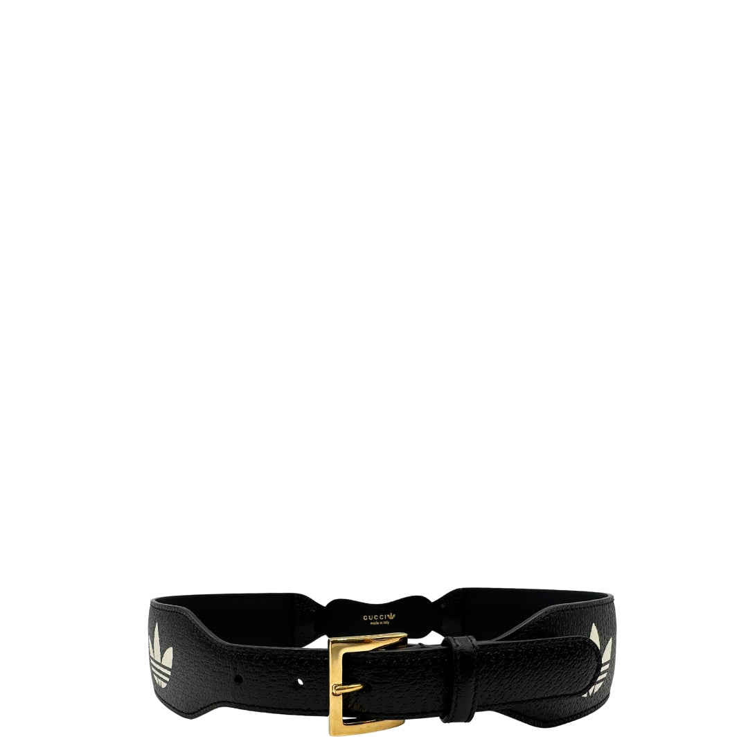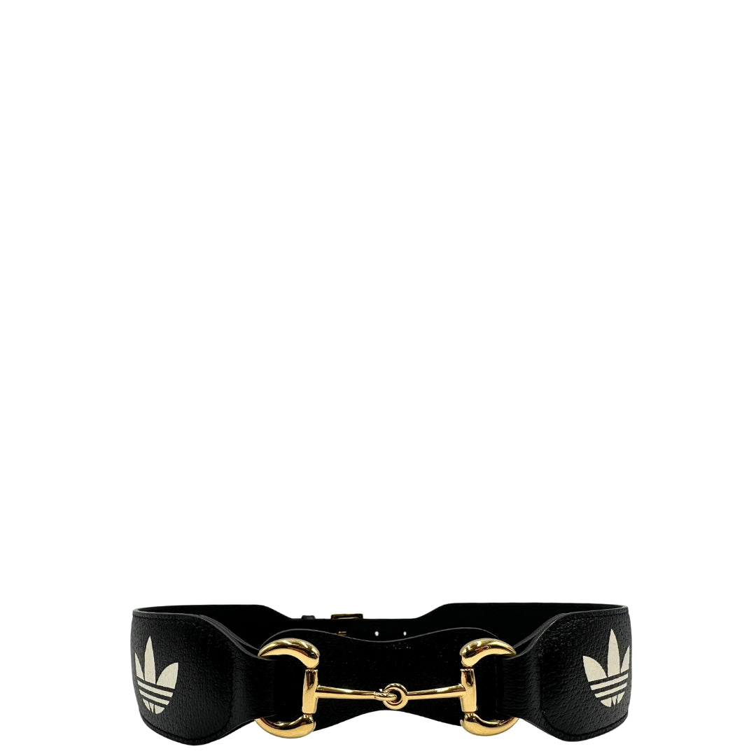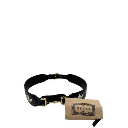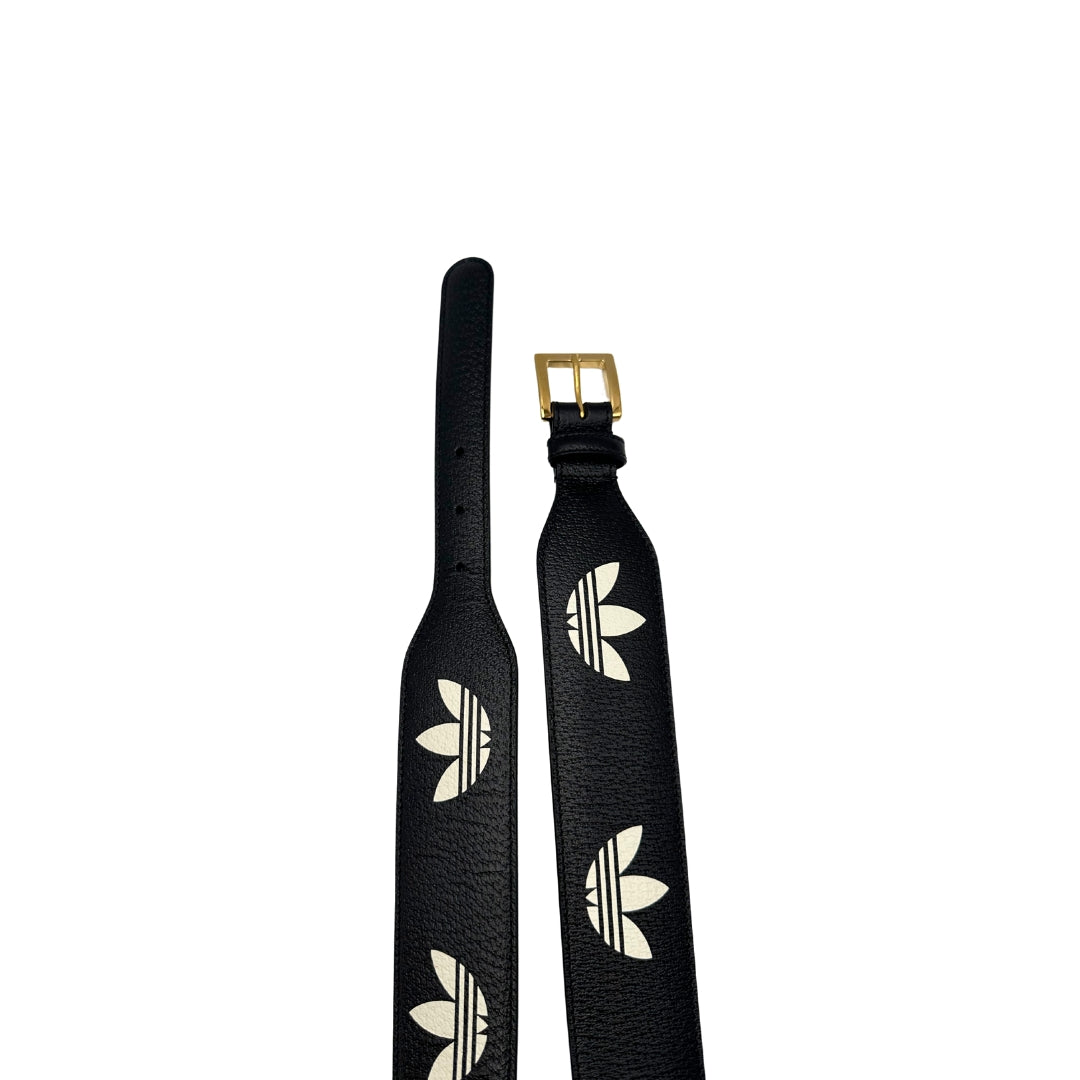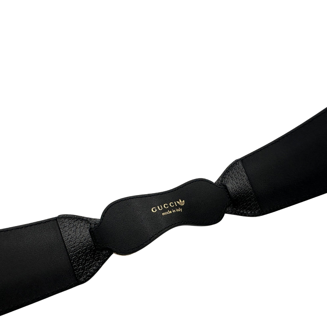Descrizione: Cintura Gucci x Adidas realizzata in pelle nera, impreziosita da stampa del logo Adidas in bianco e dettaglio Horsebit in metallo dorato. Completa di dustbag