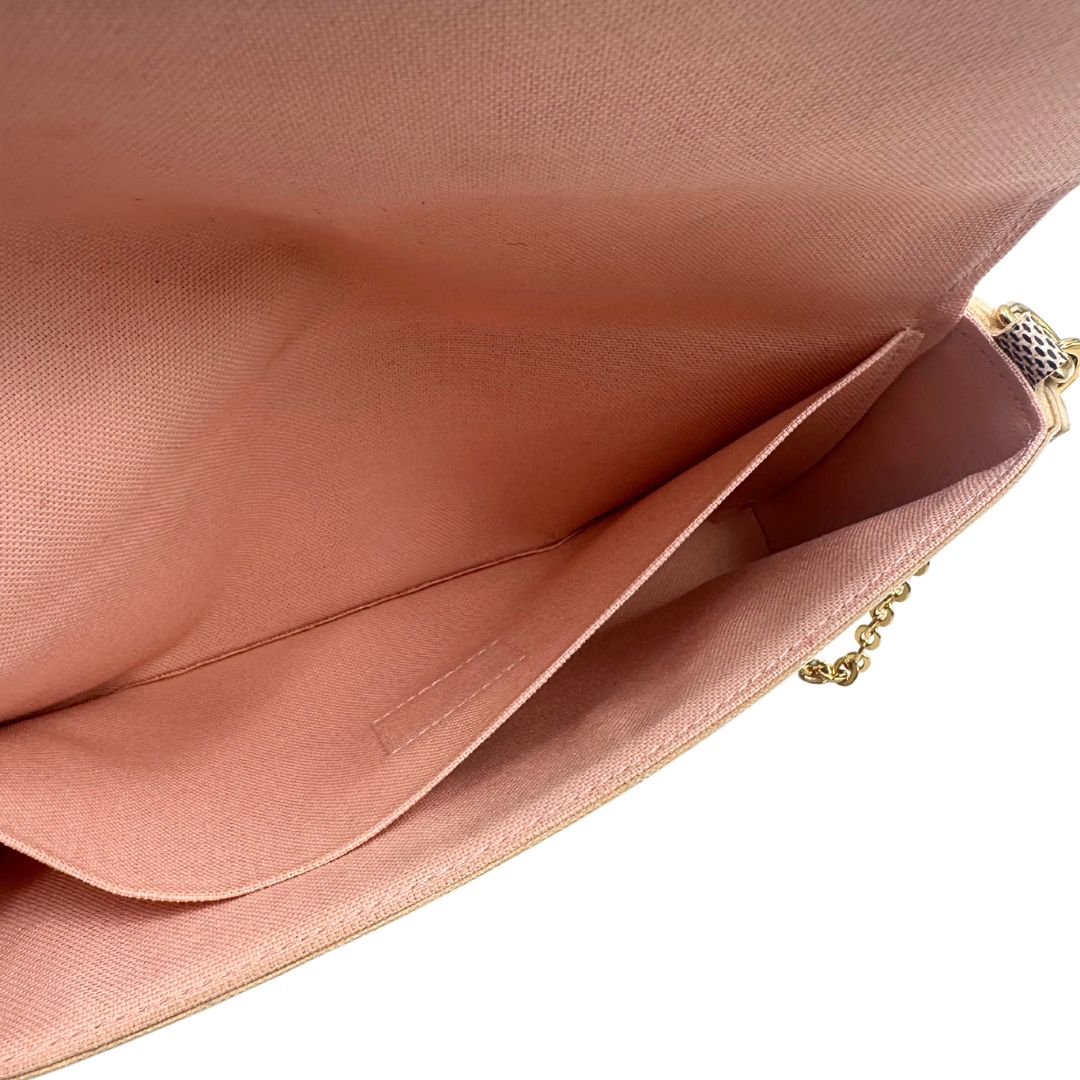 Descrizione: Borsa Louis Vuitton Félicie in canvas Damier Azur con parti metalliche dorate e interno in pelle rosa. Munita di una tracolla in catena amovibile e accessori portacarte, e portamonete estraibili. Completa di dustbag.