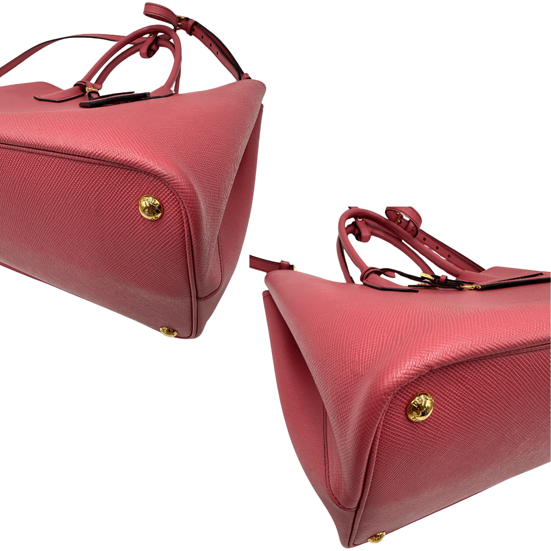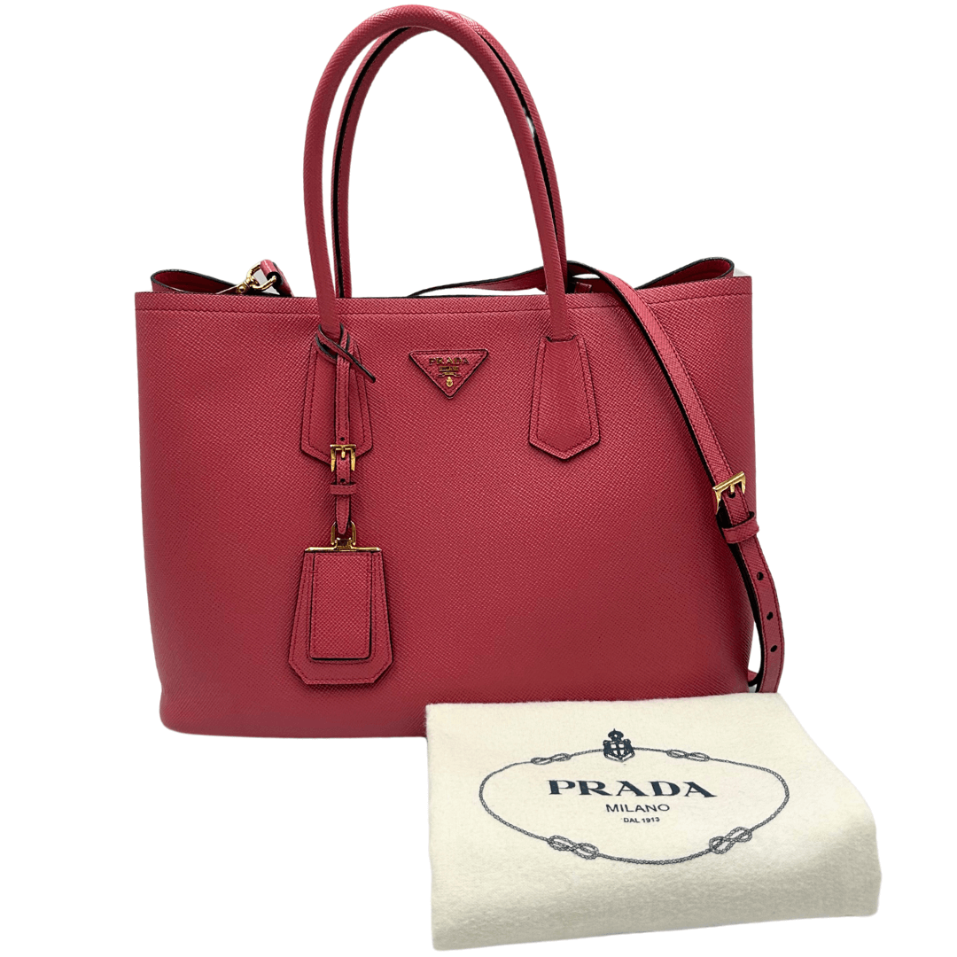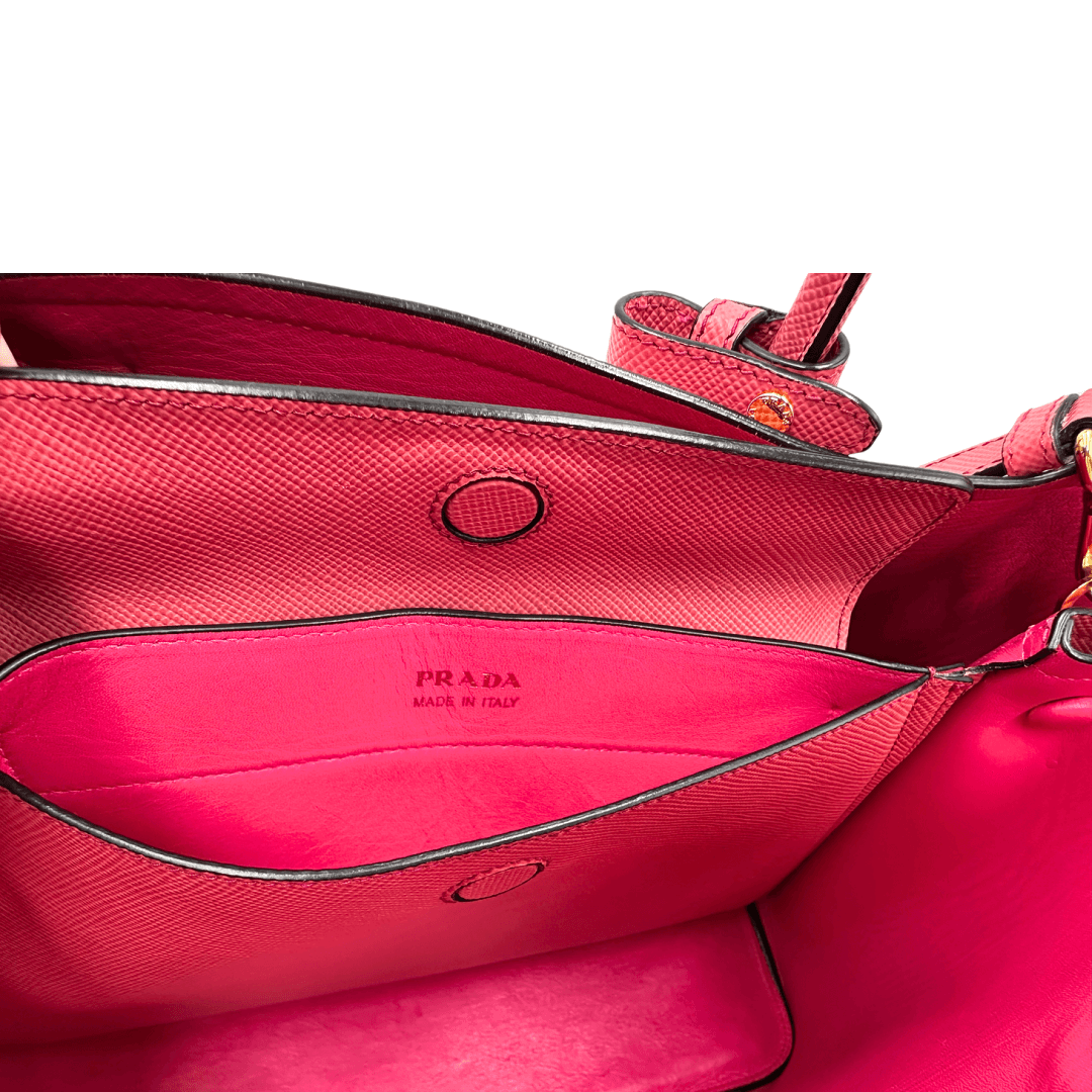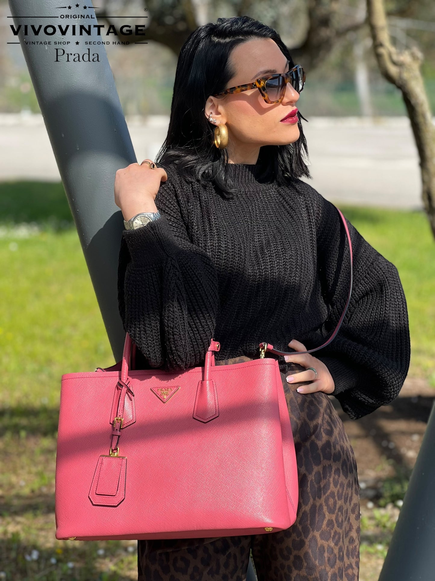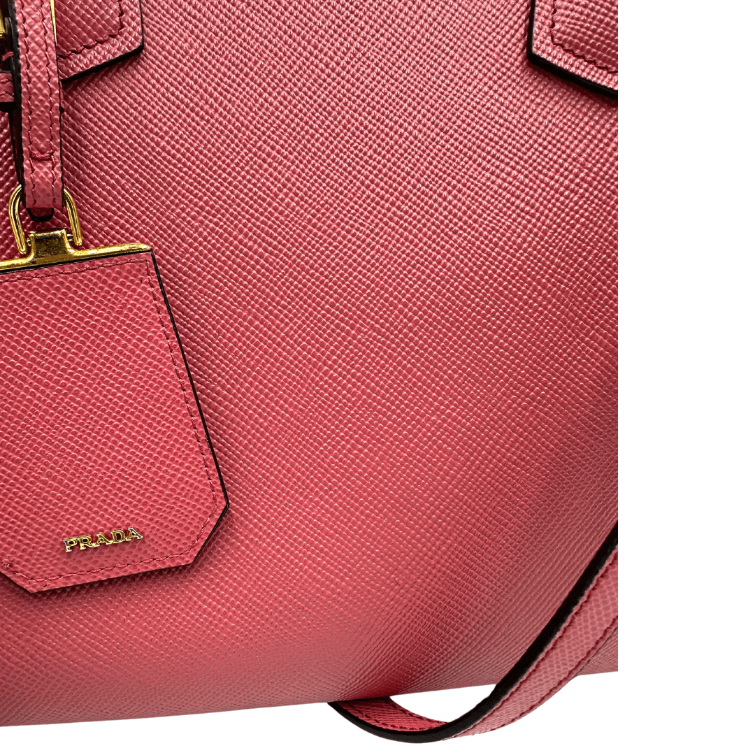 Descrizione: Borsa Prada in pelle Saffiano rosa fragola con parti metalliche dorate. Completa di dustbag