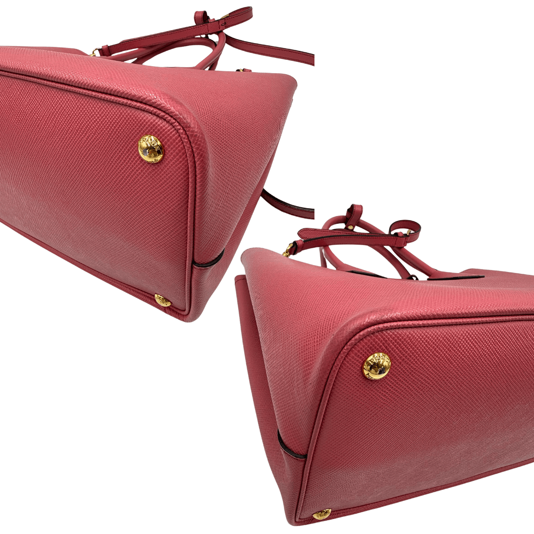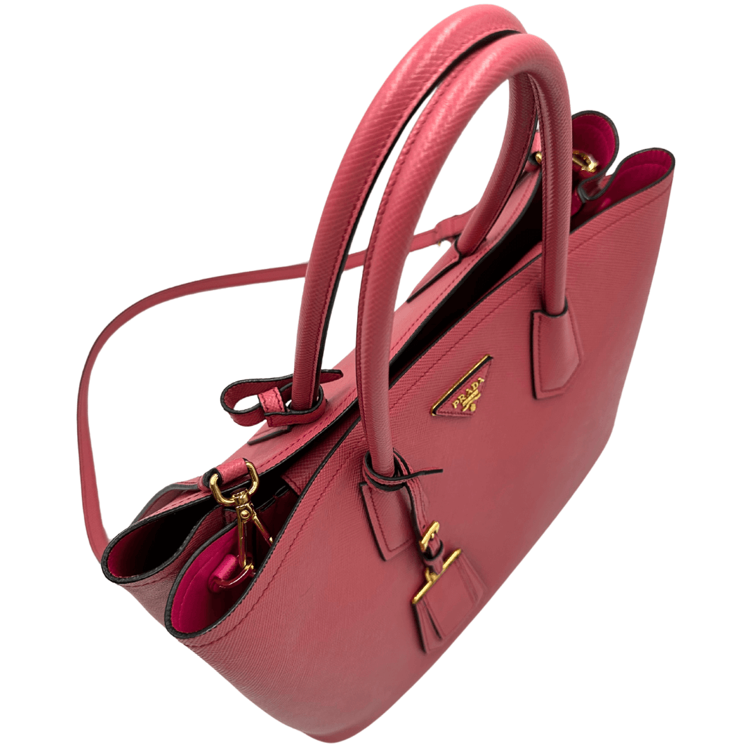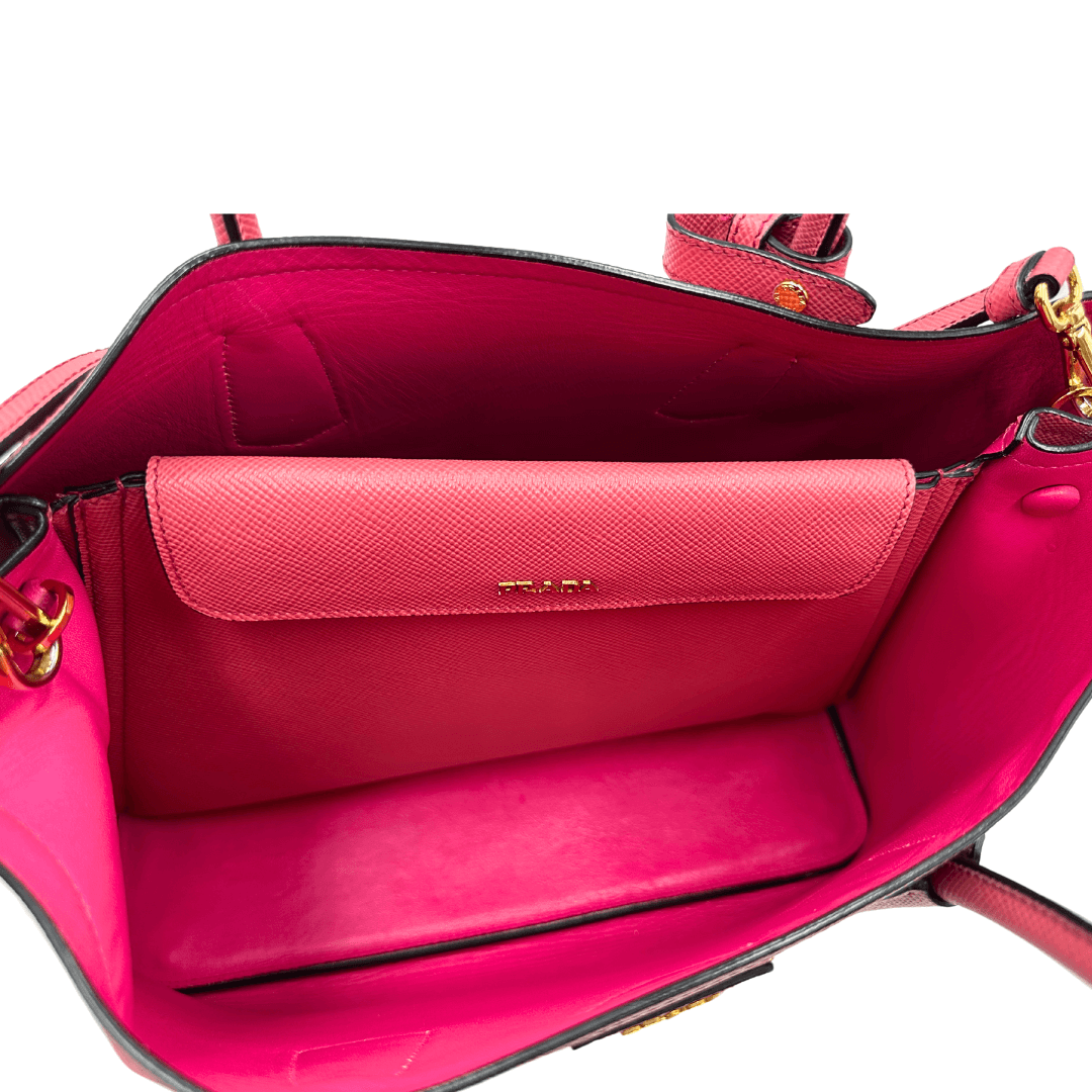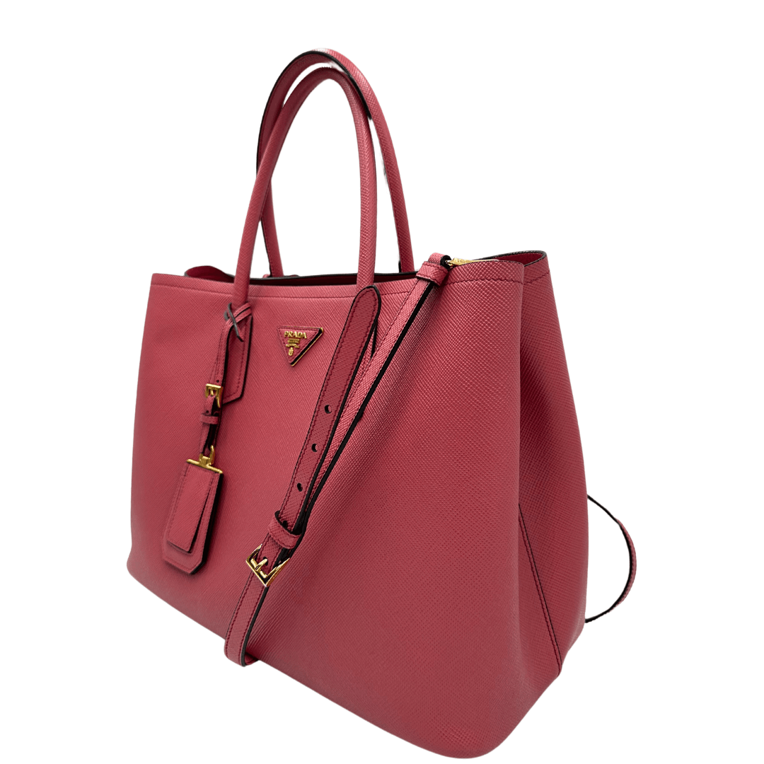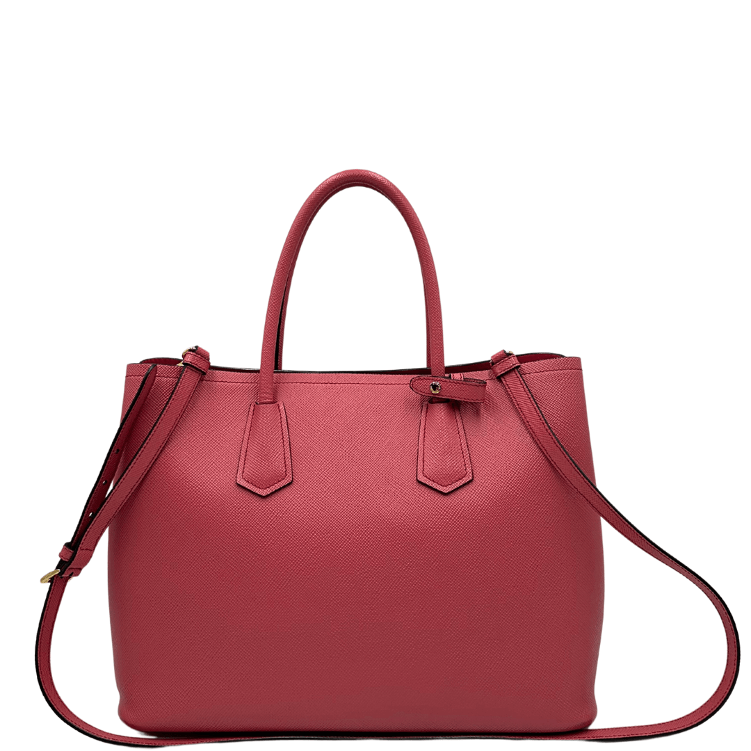 Descrizione: Borsa Prada in pelle Saffiano rosa fragola con parti metalliche dorate. Completa di dustbag