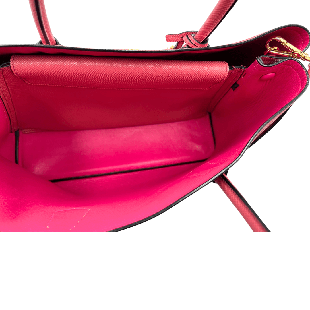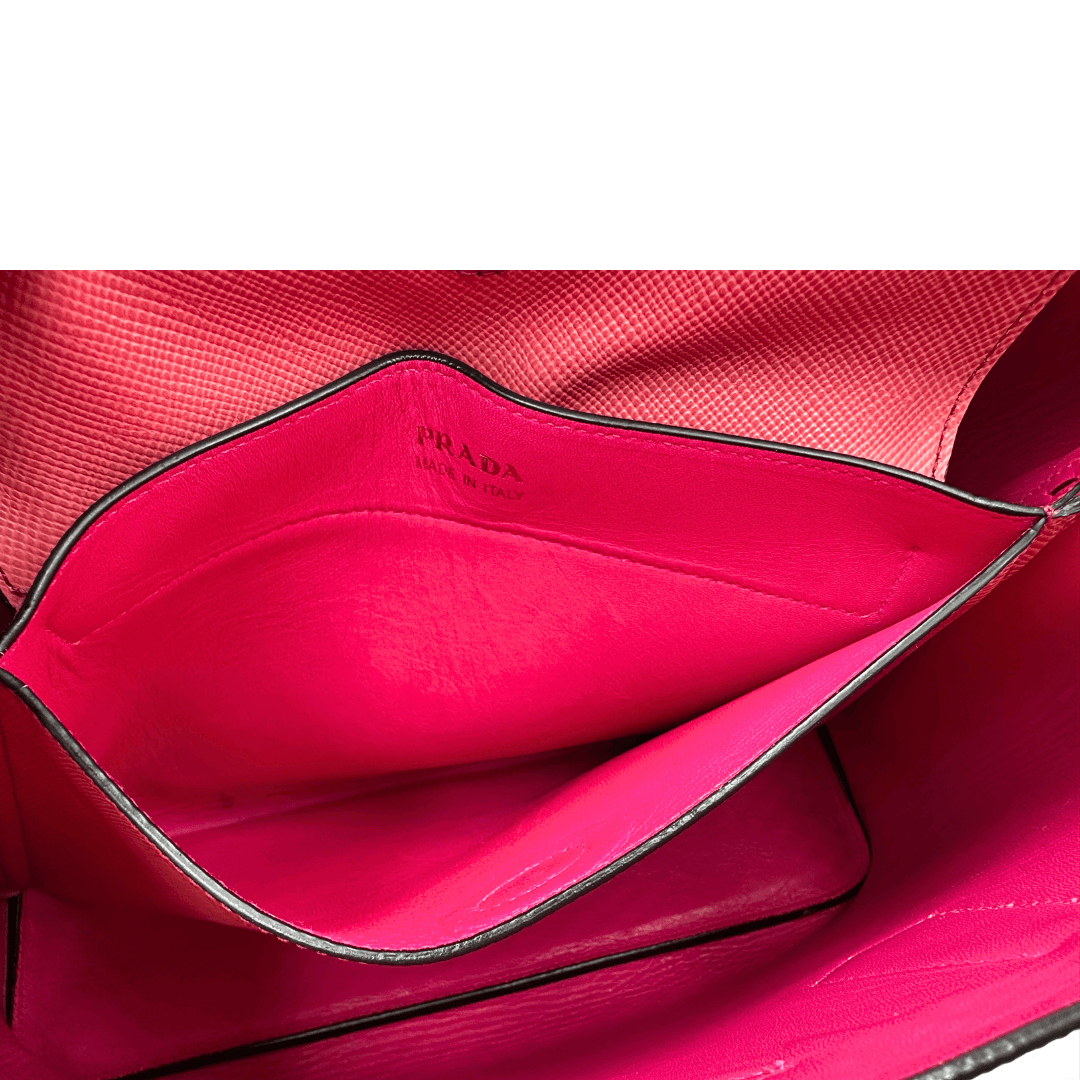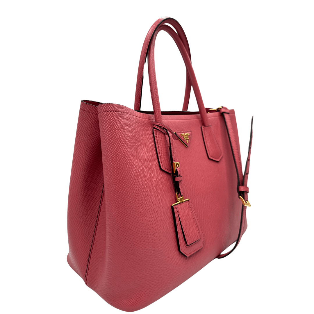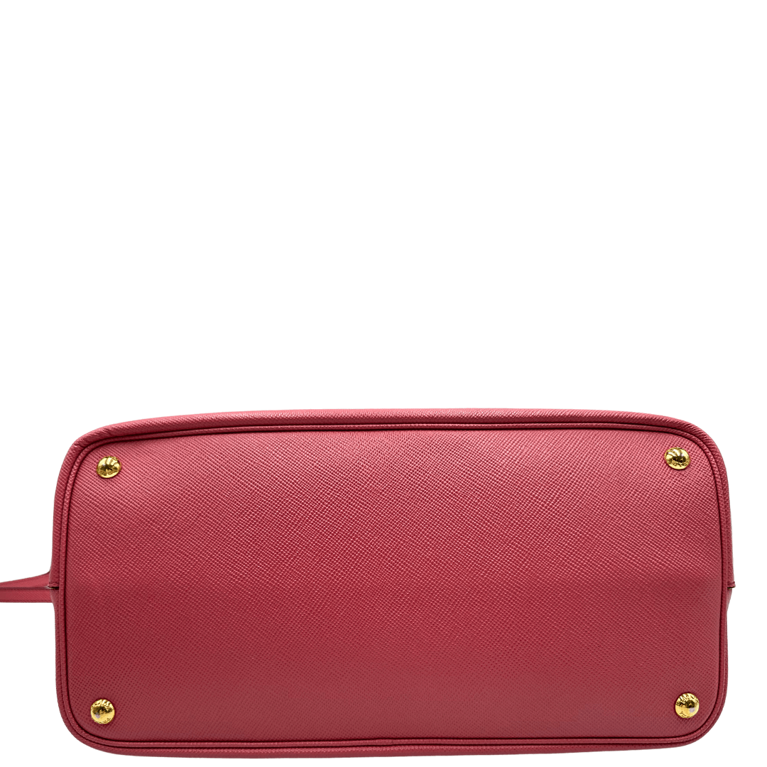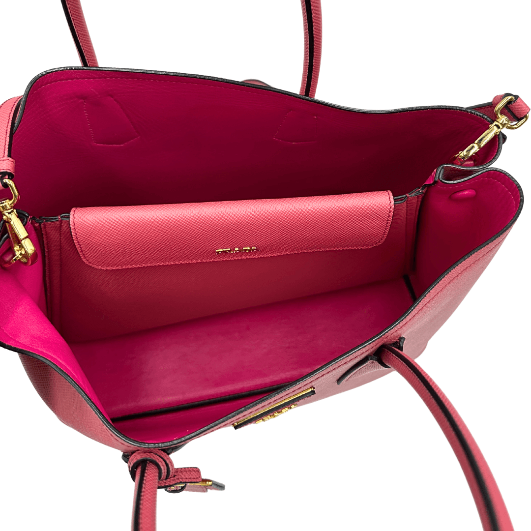 Descrizione: Borsa Prada in pelle Saffiano rosa fragola con parti metalliche dorate. Completa di dustbag