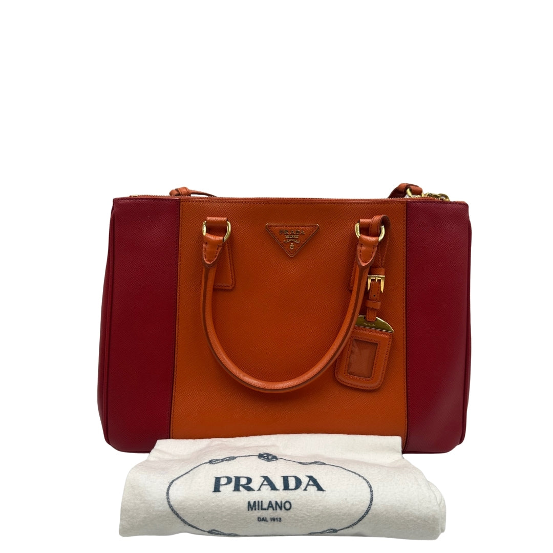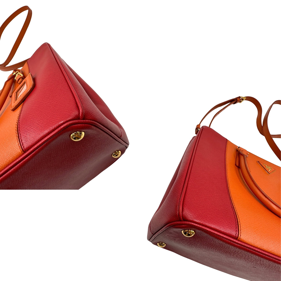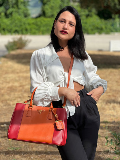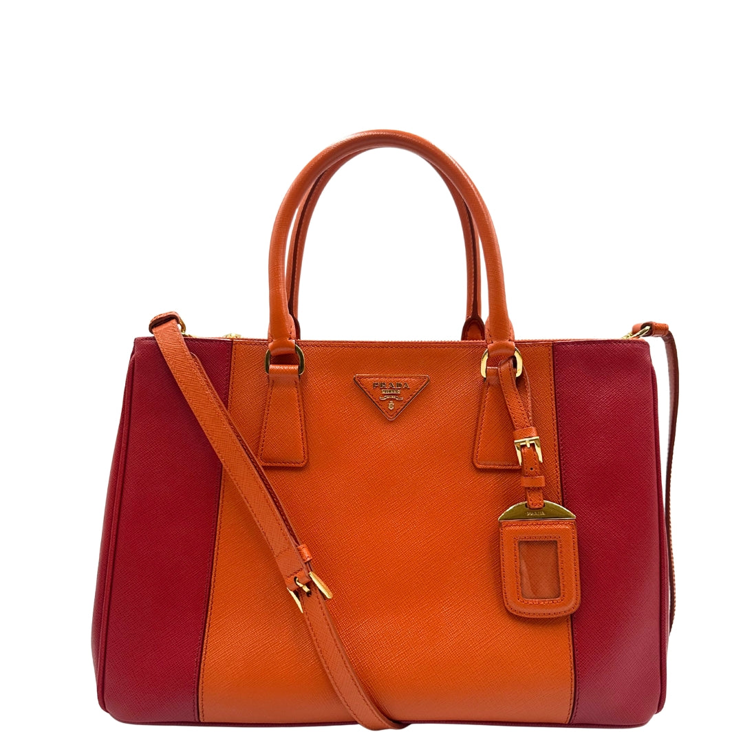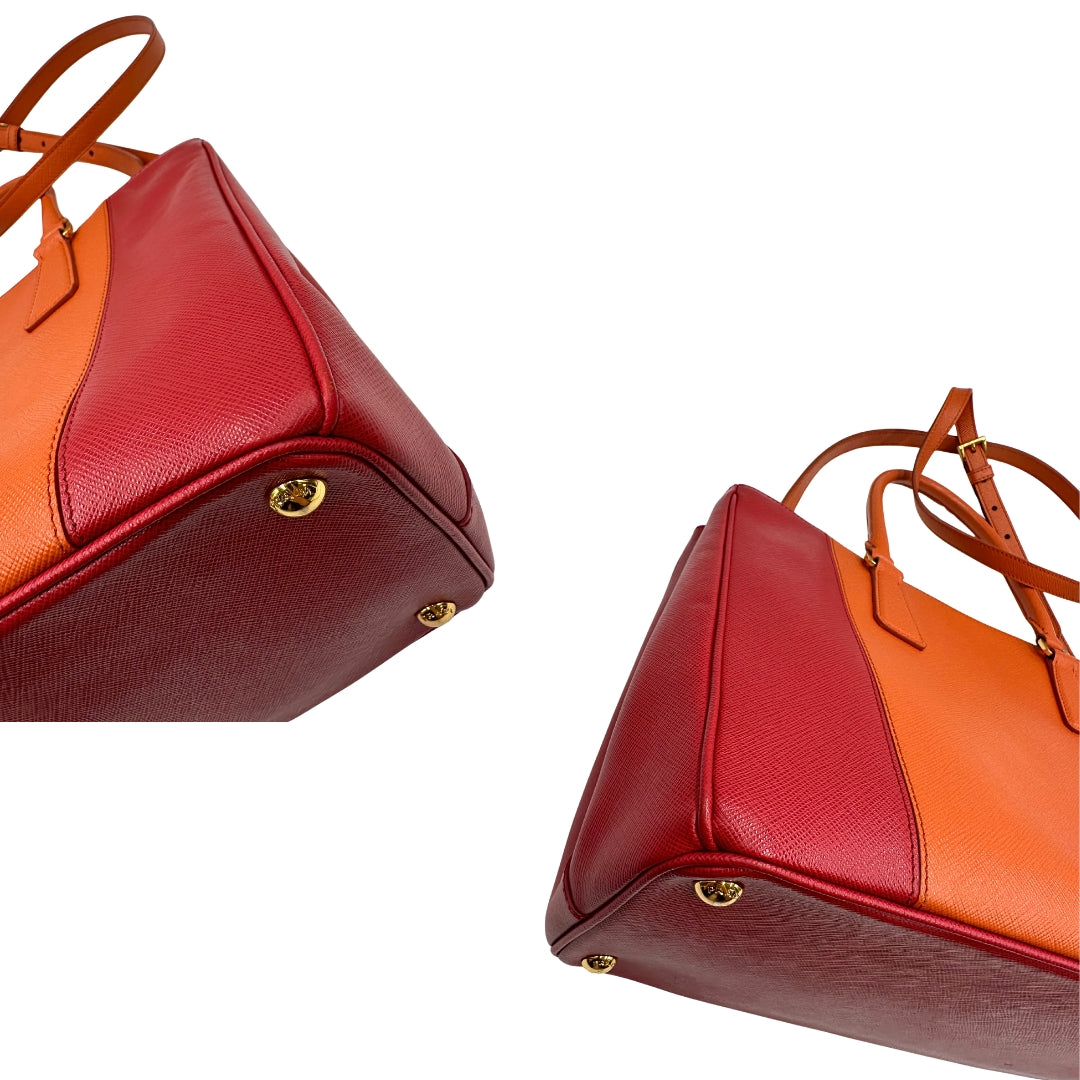 Descrizione: Borsa Prada Galleria in pelle Saffiano arancione e finiture in rosso, con parti metalliche dorate. Doppi manici arrotondati e tracolla regolabile e amovibile. Completa di dustbag