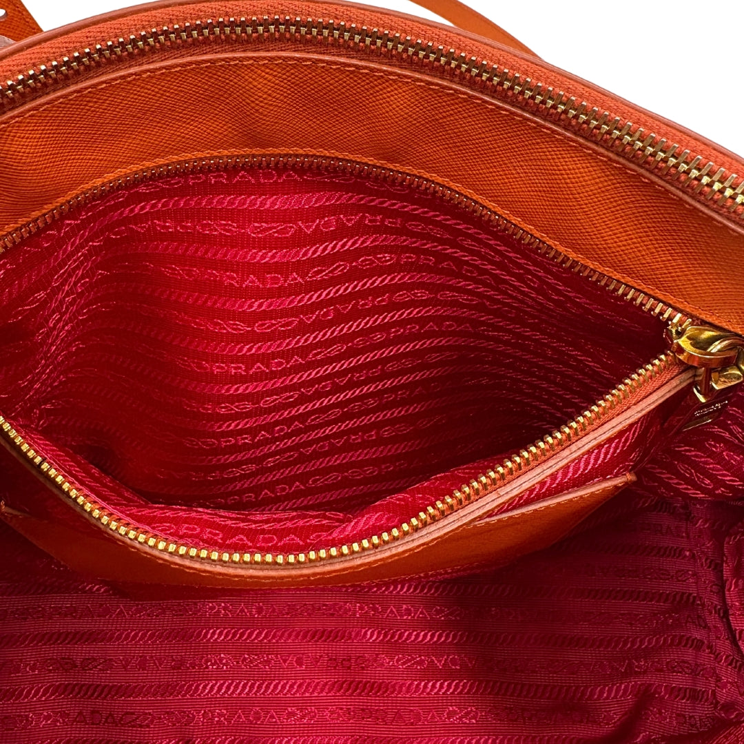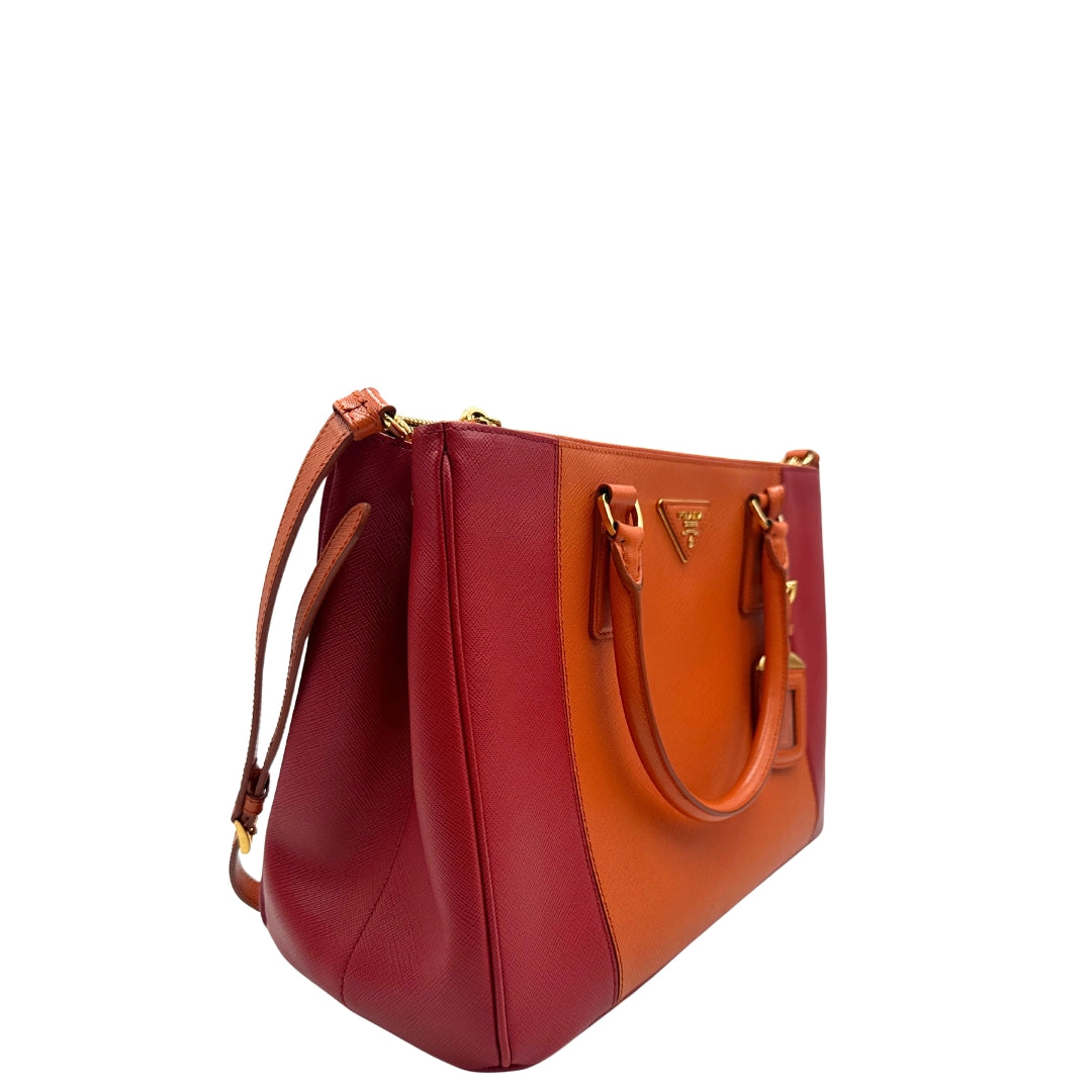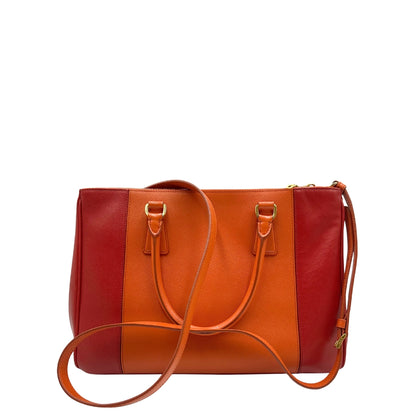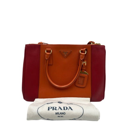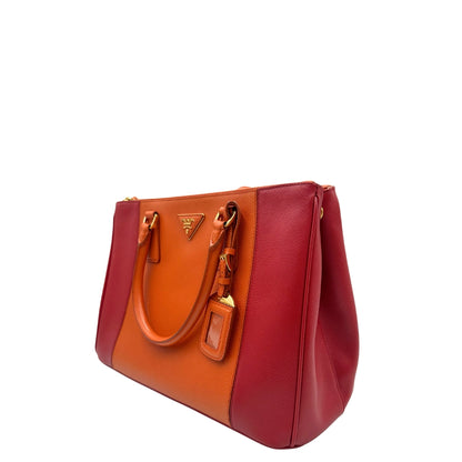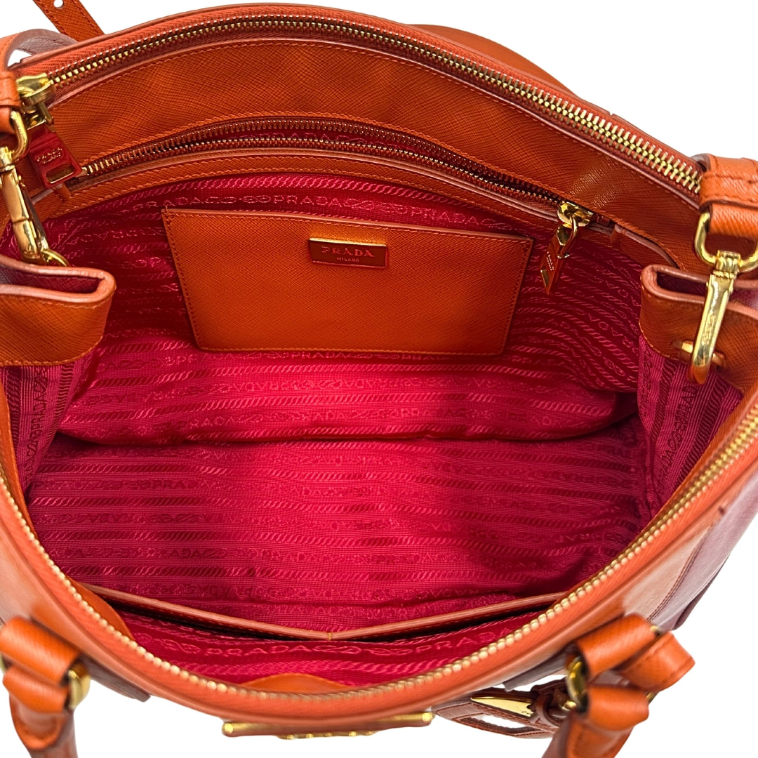 Descrizione: Borsa Prada Galleria in pelle Saffiano arancione e finiture in rosso, con parti metalliche dorate. Doppi manici arrotondati e tracolla regolabile e amovibile. Completa di dustbag