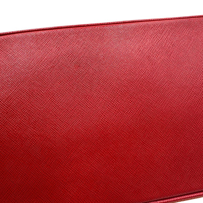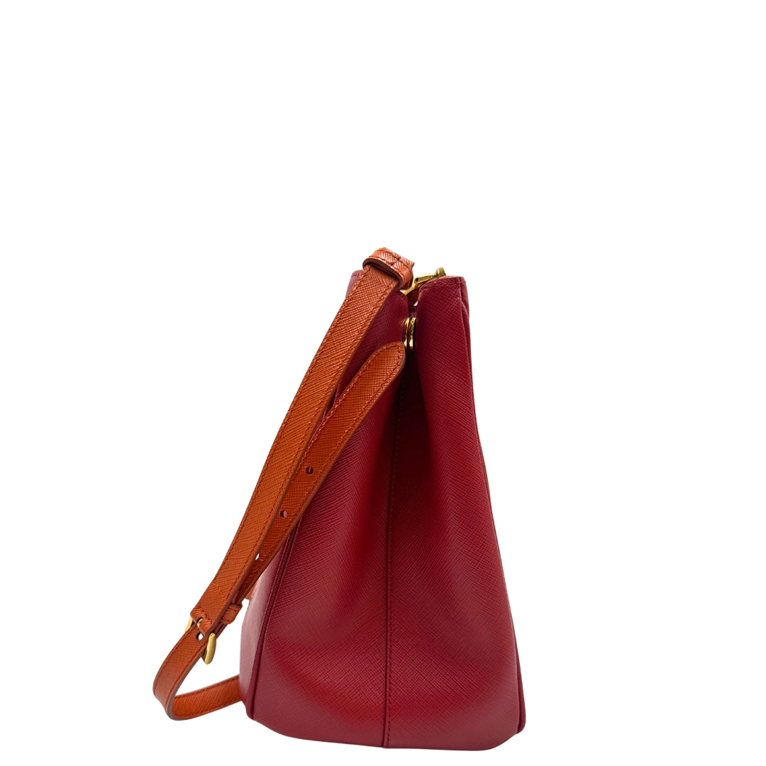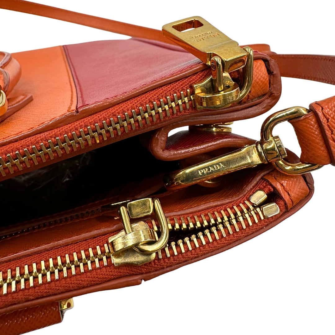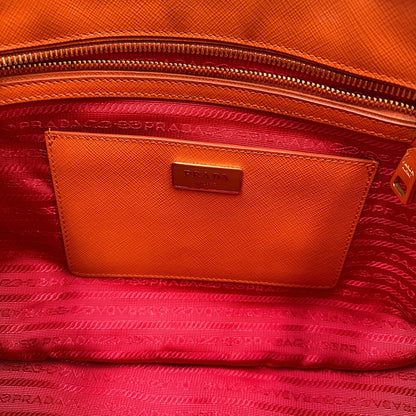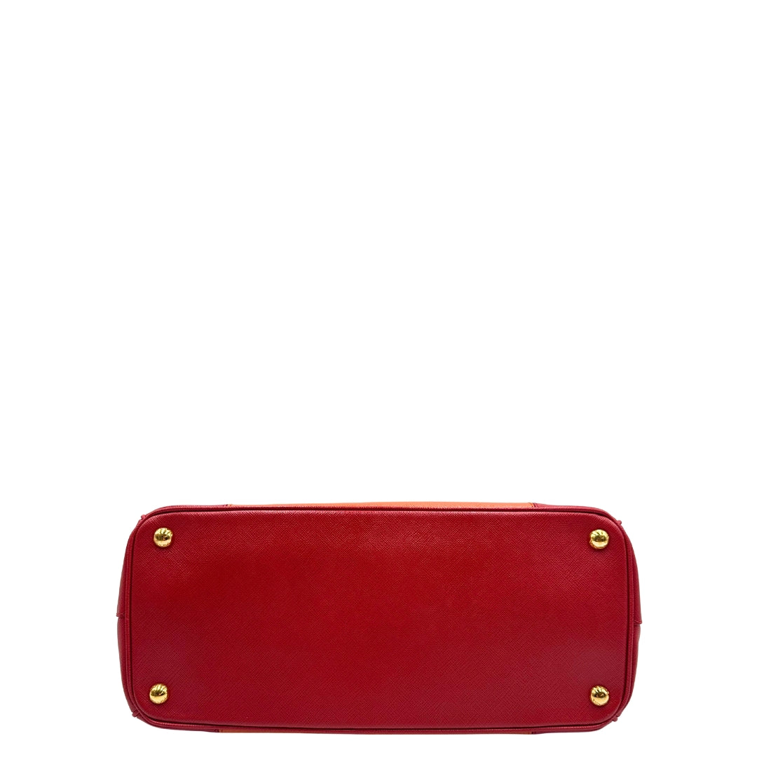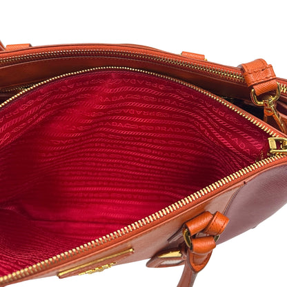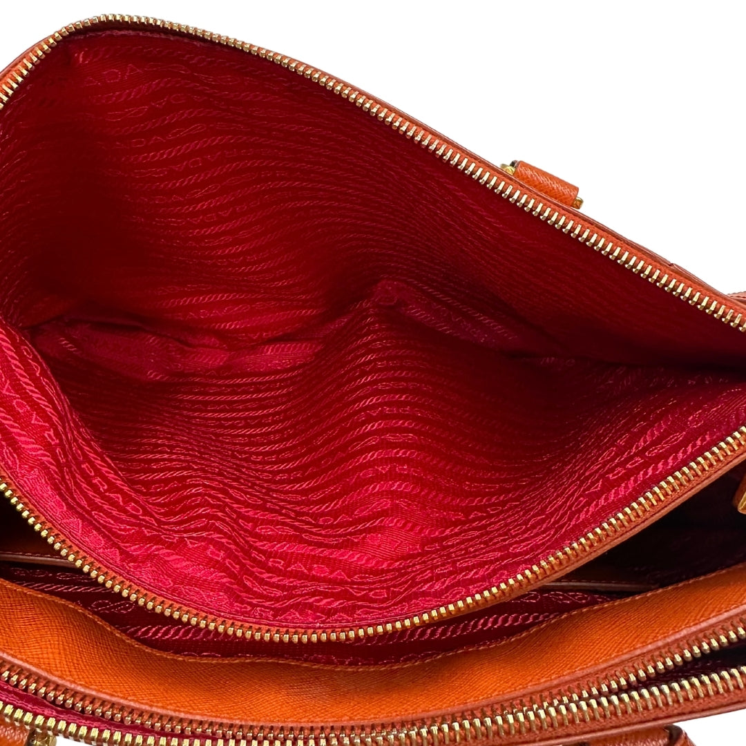 Descrizione: Borsa Prada Galleria in pelle Saffiano arancione e finiture in rosso, con parti metalliche dorate. Doppi manici arrotondati e tracolla regolabile e amovibile. Completa di dustbag
