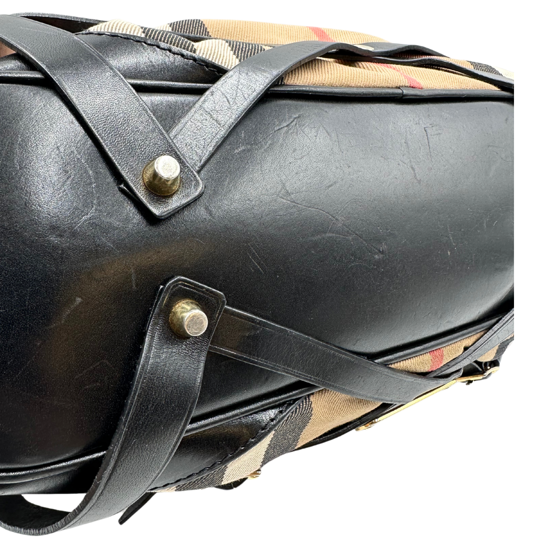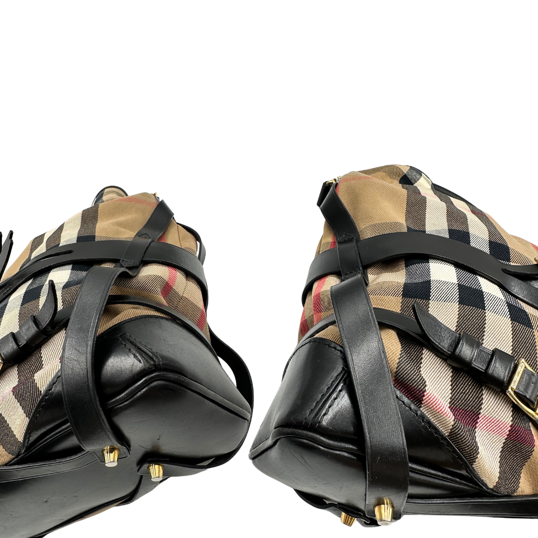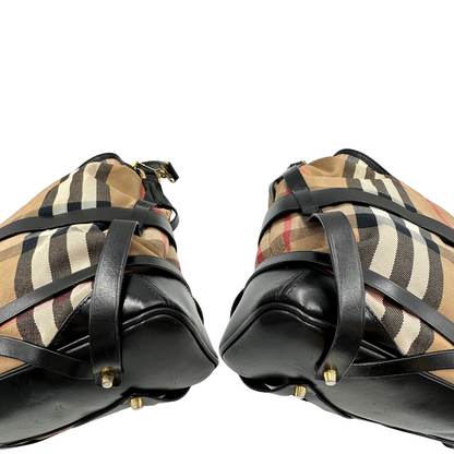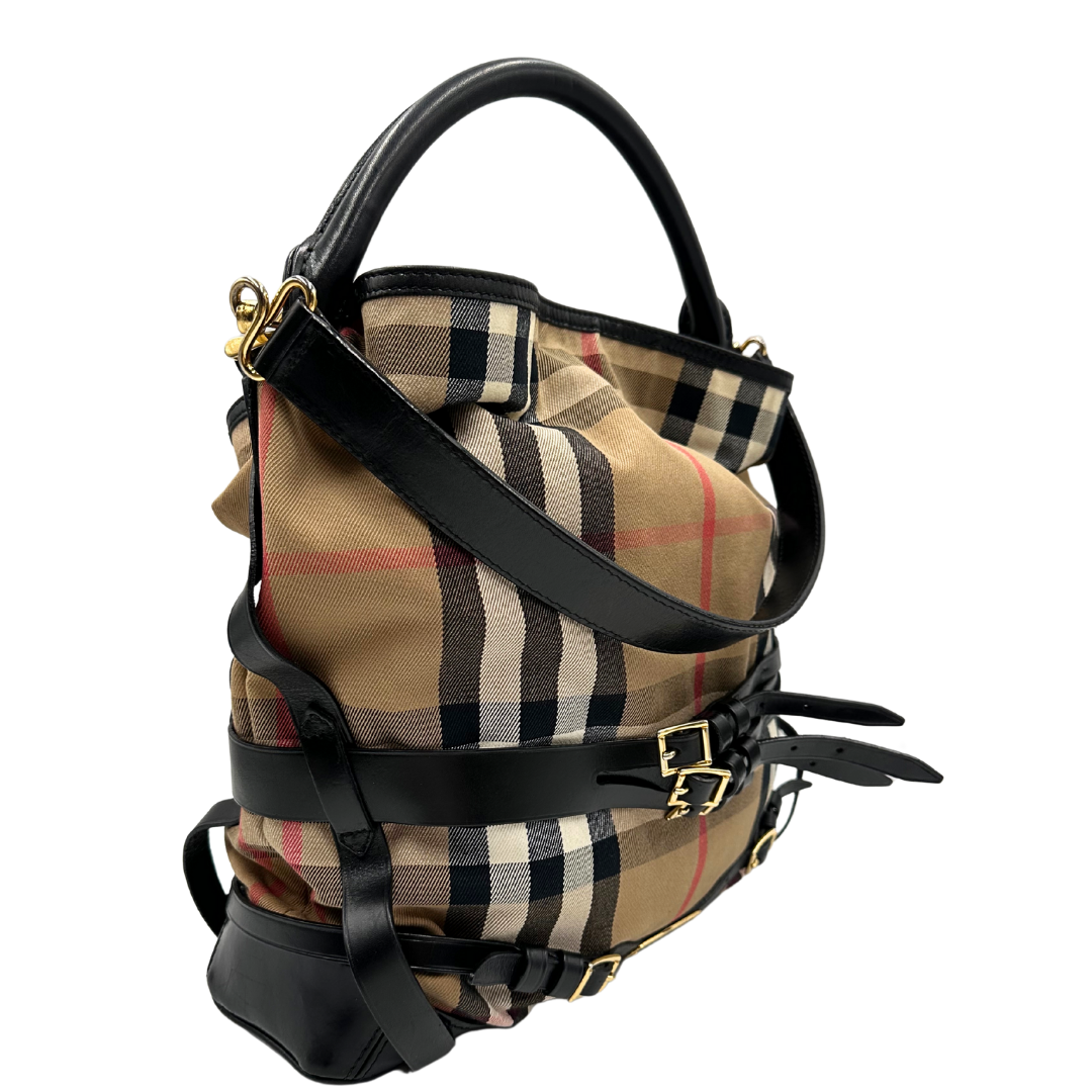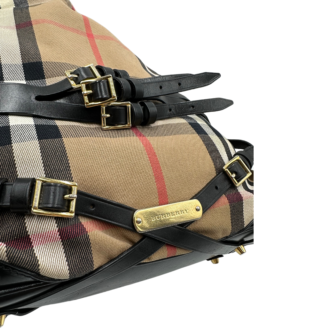 Descrizione: Borsa Burberry in tessuto beige con trama tartan, finiture in pelle nera, fibbie decorative sul front, rifinita con parti metalliche dorate.