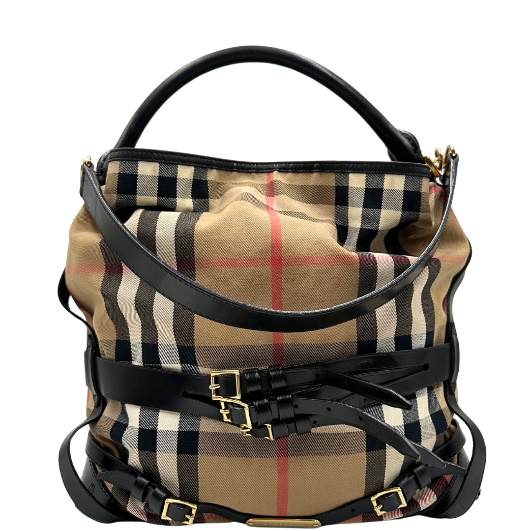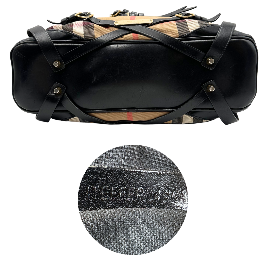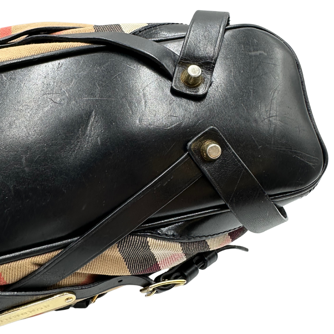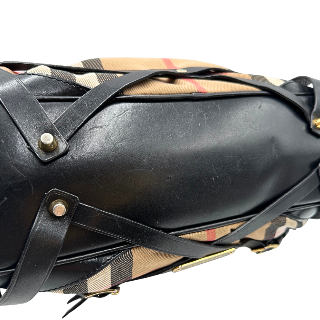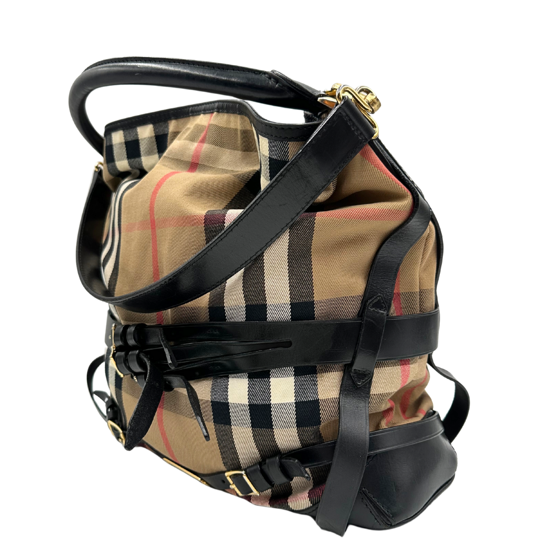Descrizione: Borsa Burberry in tessuto beige con trama tartan, finiture in pelle nera, fibbie decorative sul front, rifinita con parti metalliche dorate.