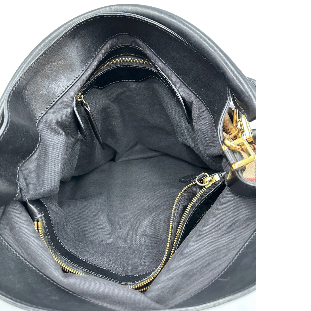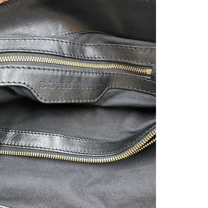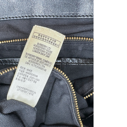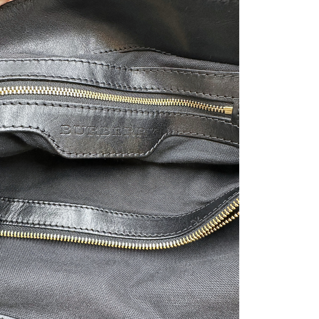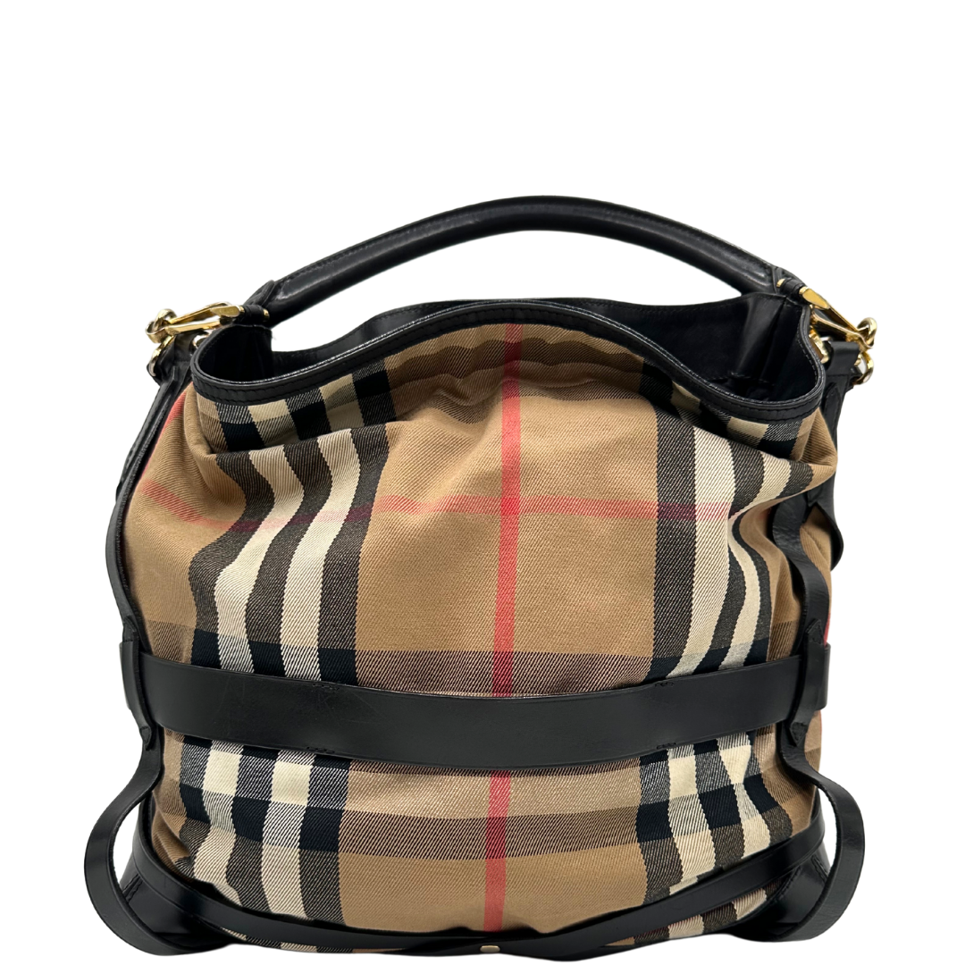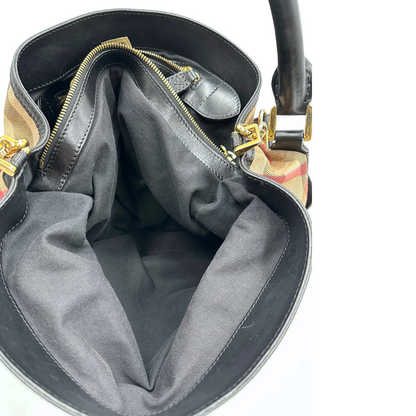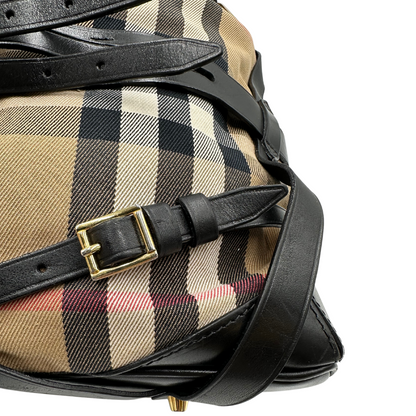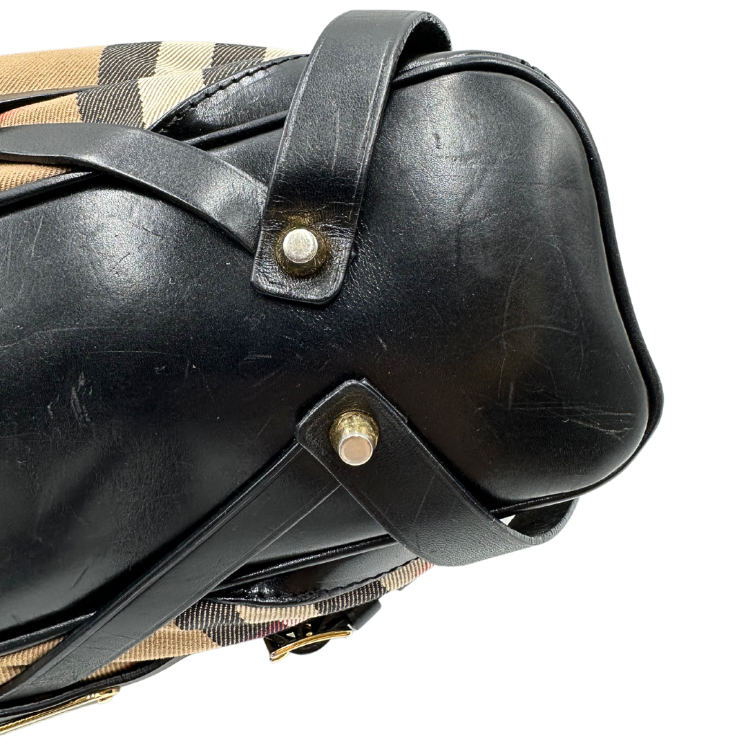 Descrizione: Borsa Burberry in tessuto beige con trama tartan, finiture in pelle nera, fibbie decorative sul front, rifinita con parti metalliche dorate.