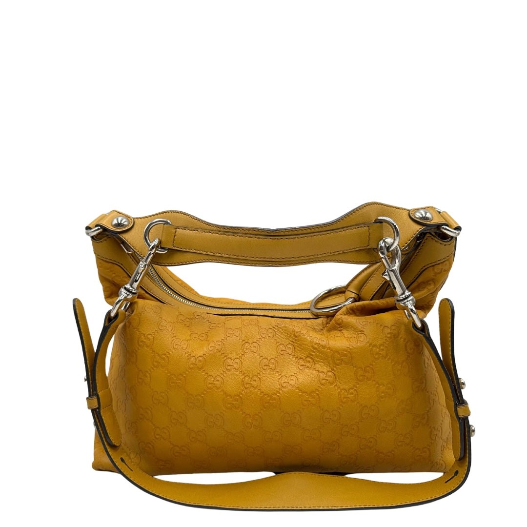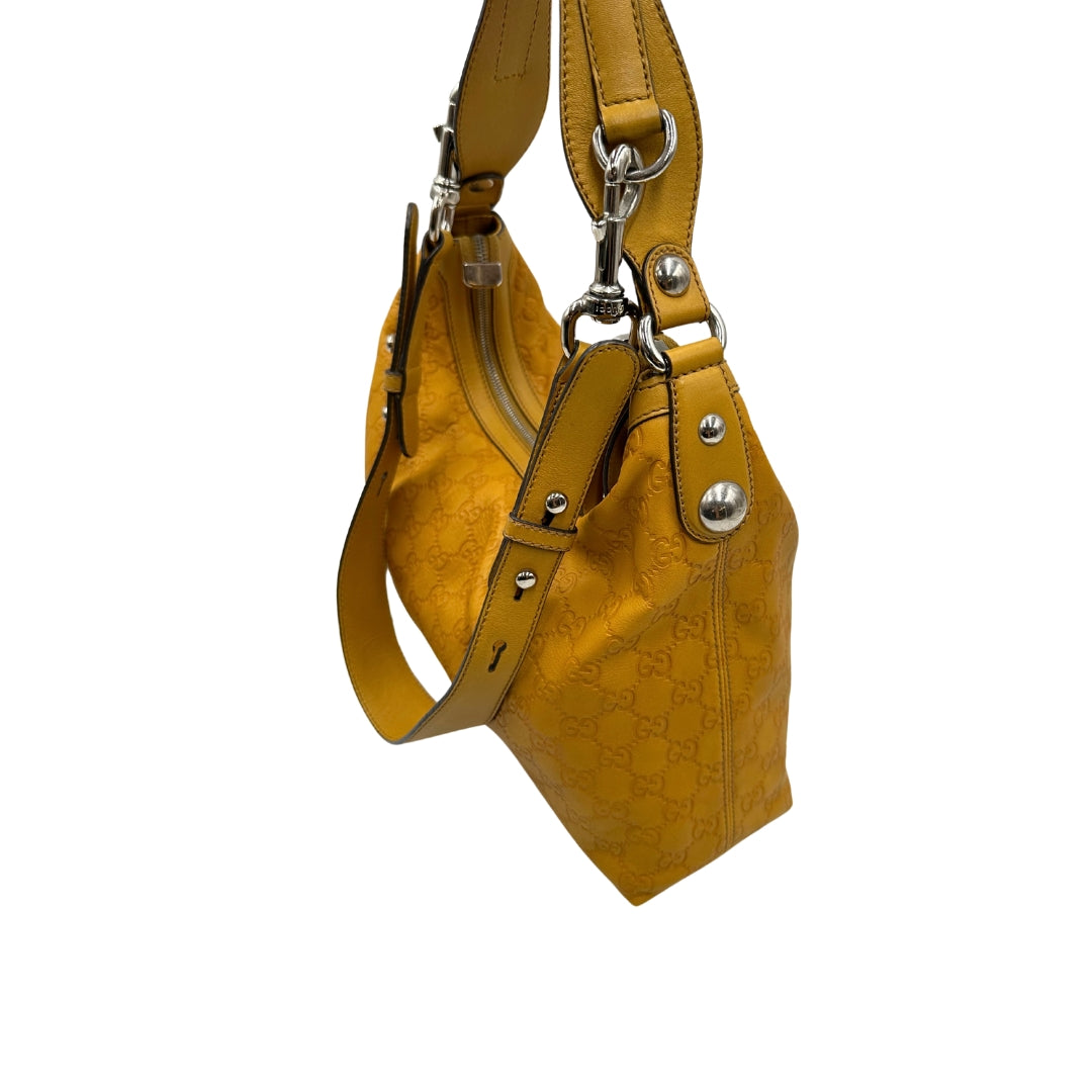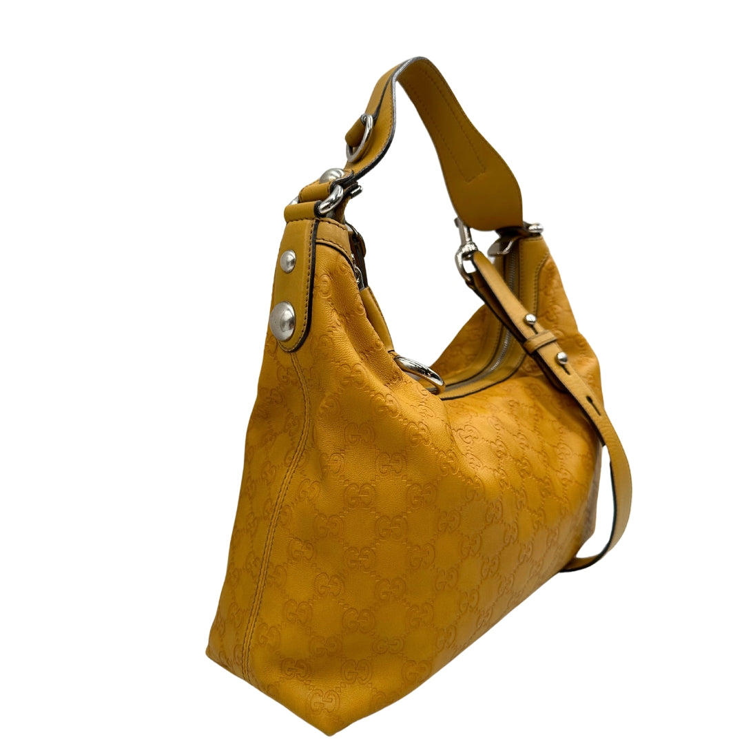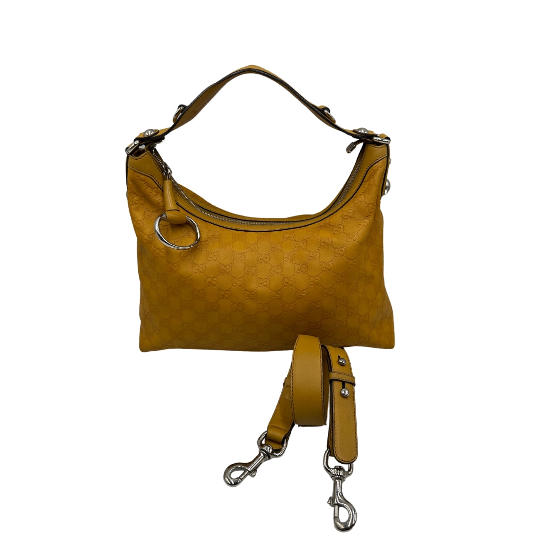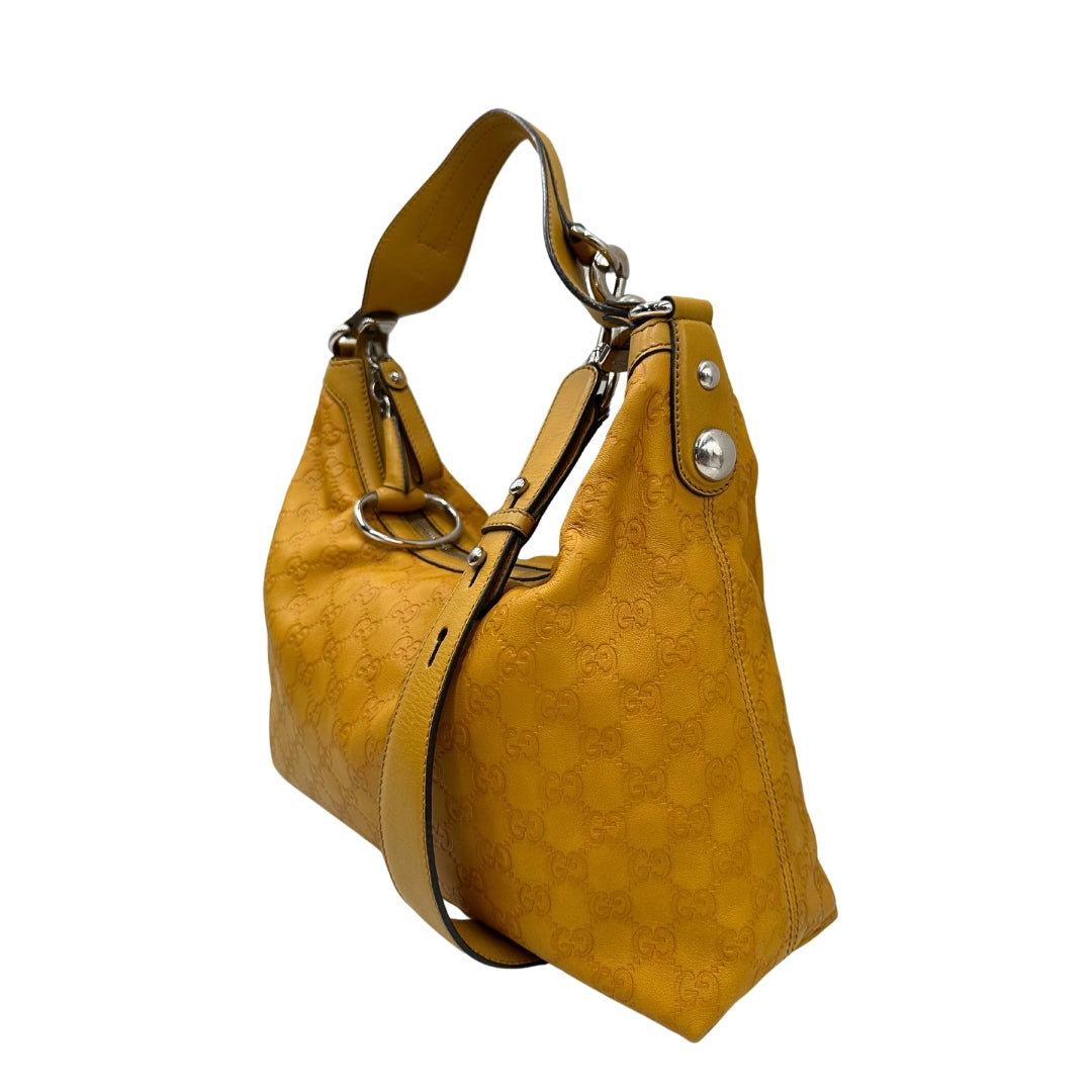 Descrizione: Borsa Hobo Gucci in pelle giallo senape con trama GG e parti metalliche argentate.