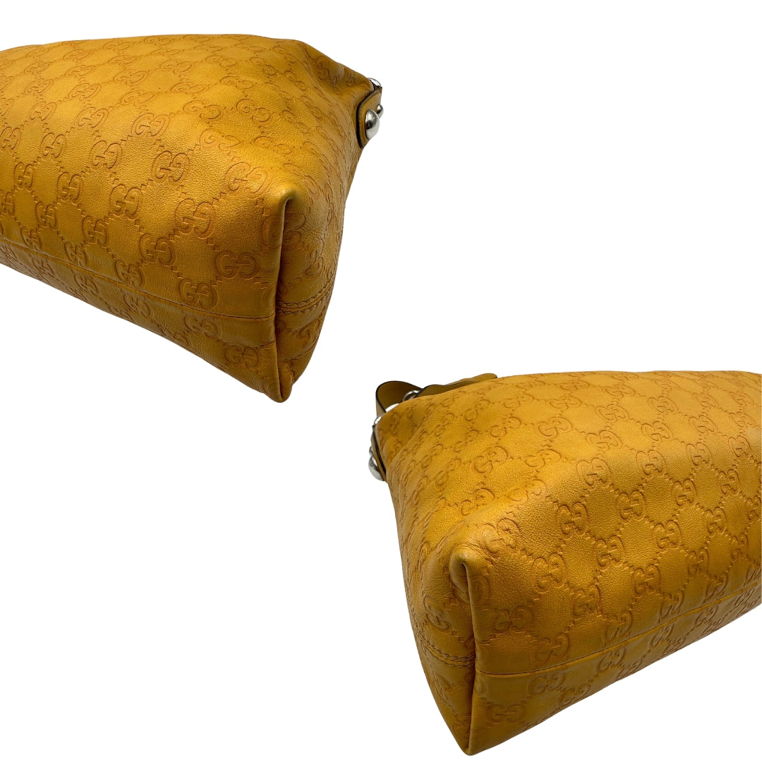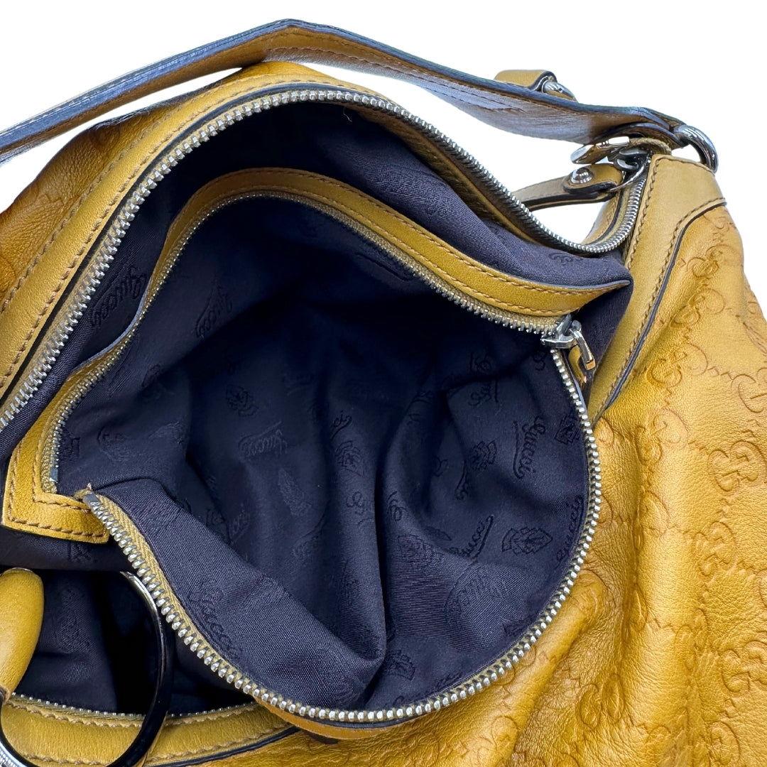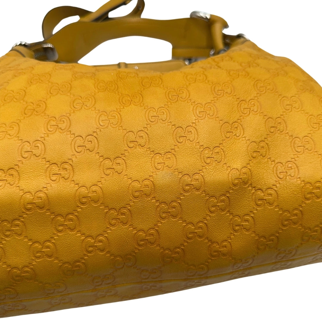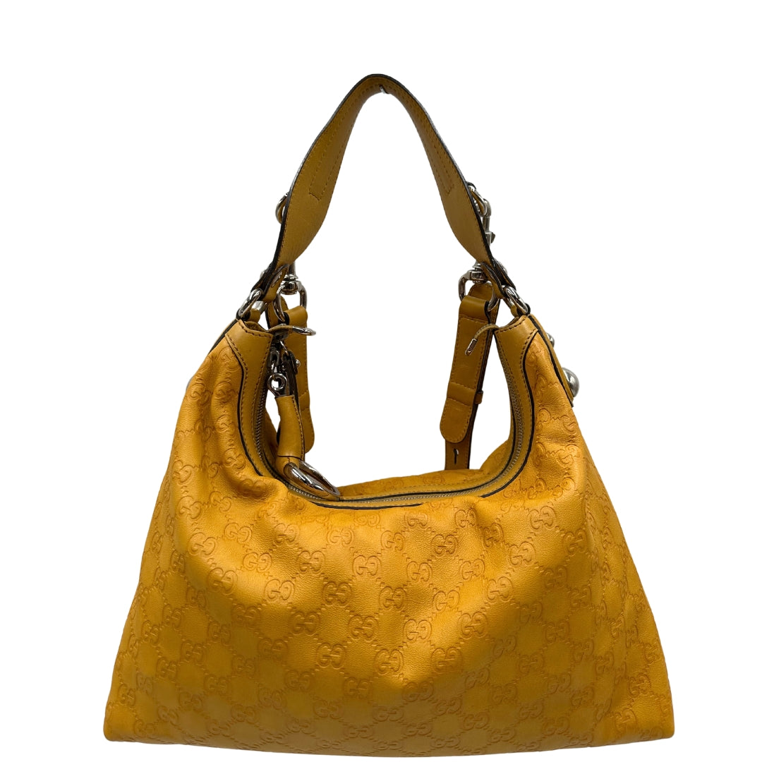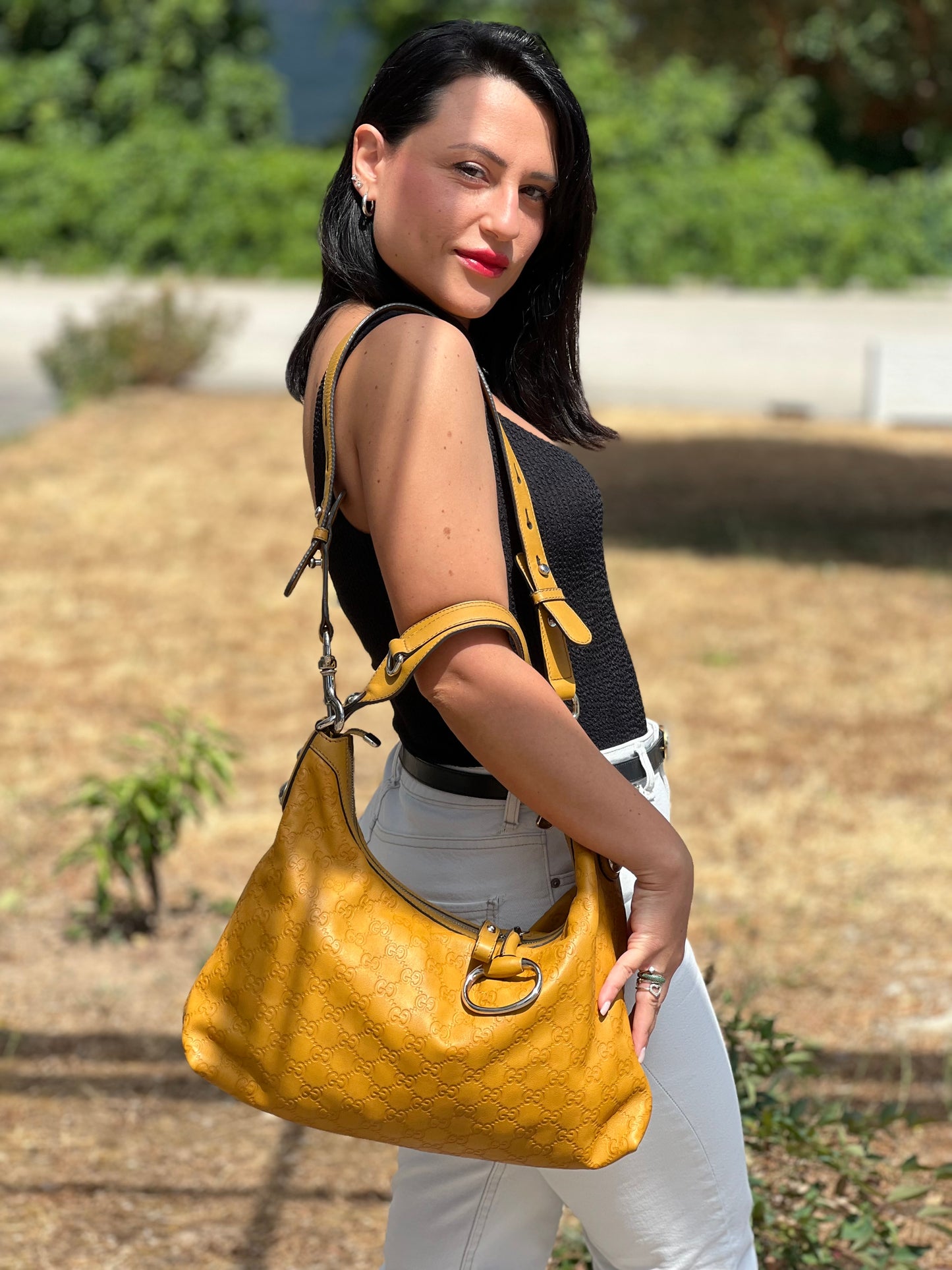 Descrizione: Borsa Hobo Gucci in pelle giallo senape con trama GG e parti metalliche argentate.