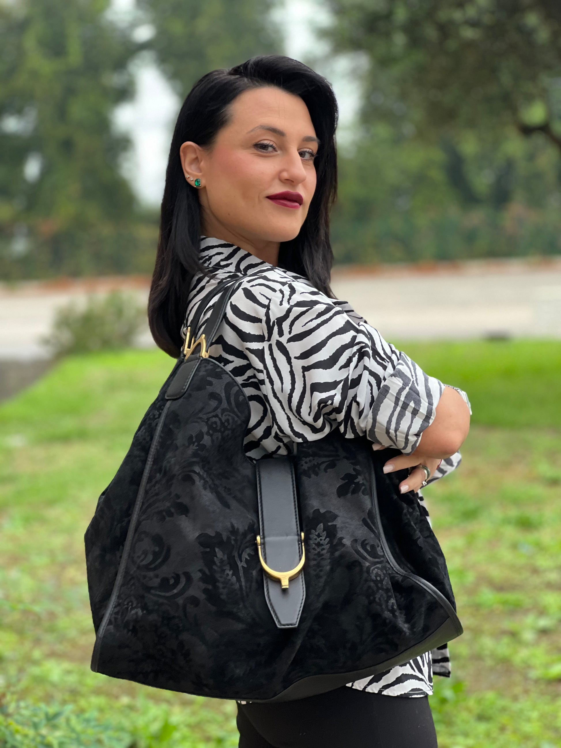 Descrizione: Borsa Hobo in tessuto scamosciato con motivo damasco, finiture in pelle tono su tono e parti metalliche dorate.
