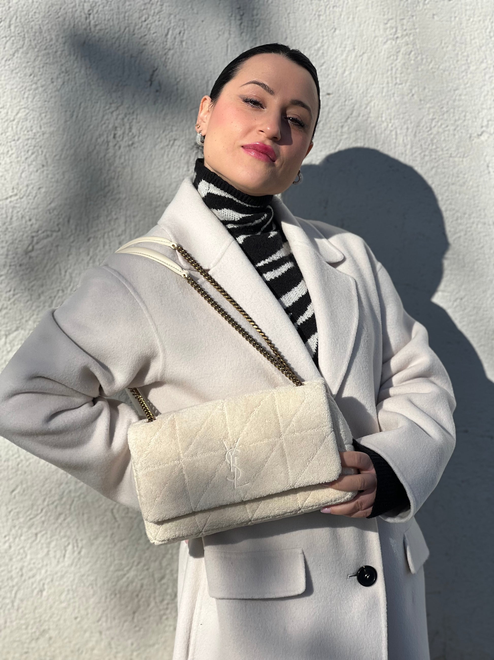 Descrizione: YSL Jamie in tessuto bouclé trapuntato color crema, con logo YSL cucito e tracolla scorrevole in catena dorata con spallacci. Munita di corredo.