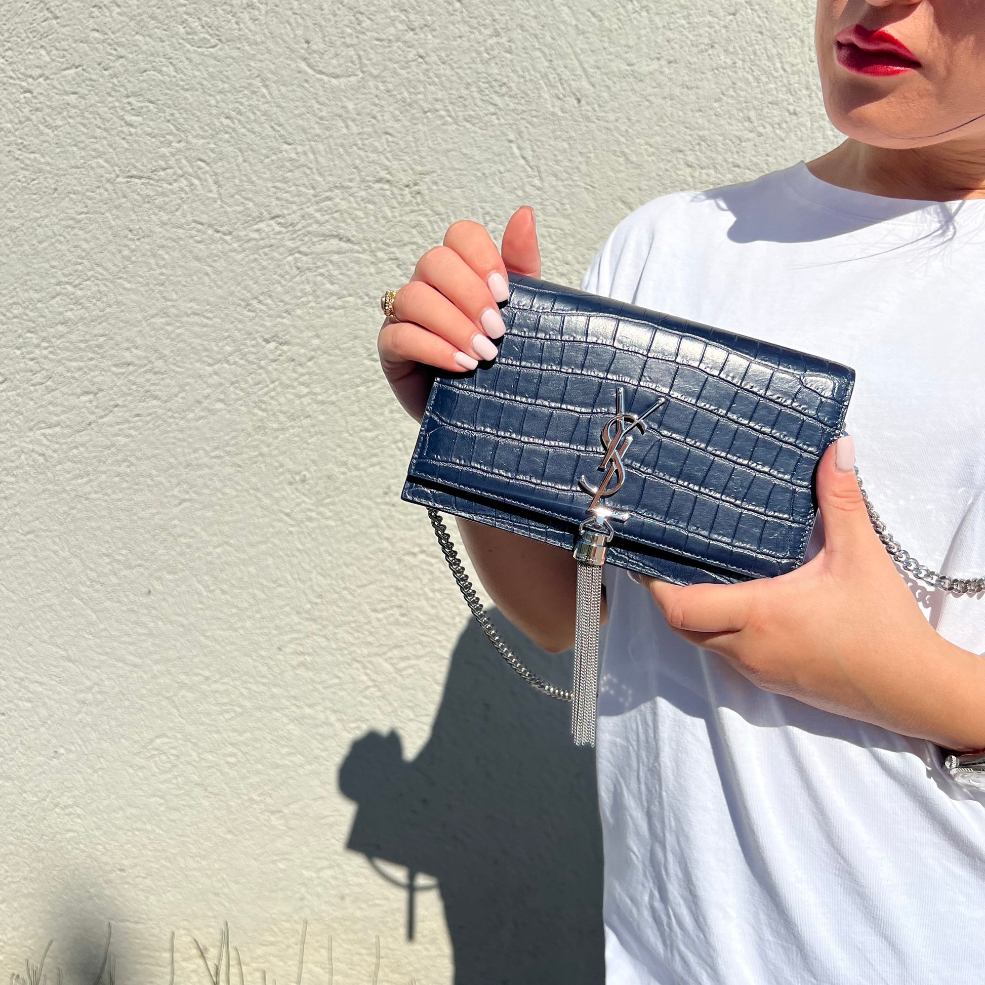 Descrizione: Borsa Kate Small Saint Laurent in pelle blu scuro trama cocco, parti metalliche argentate e nappa decorativa con micro catene. Munita di una tracolla amovibile in catena con spallaccio in pelle. Completa di scatola logata