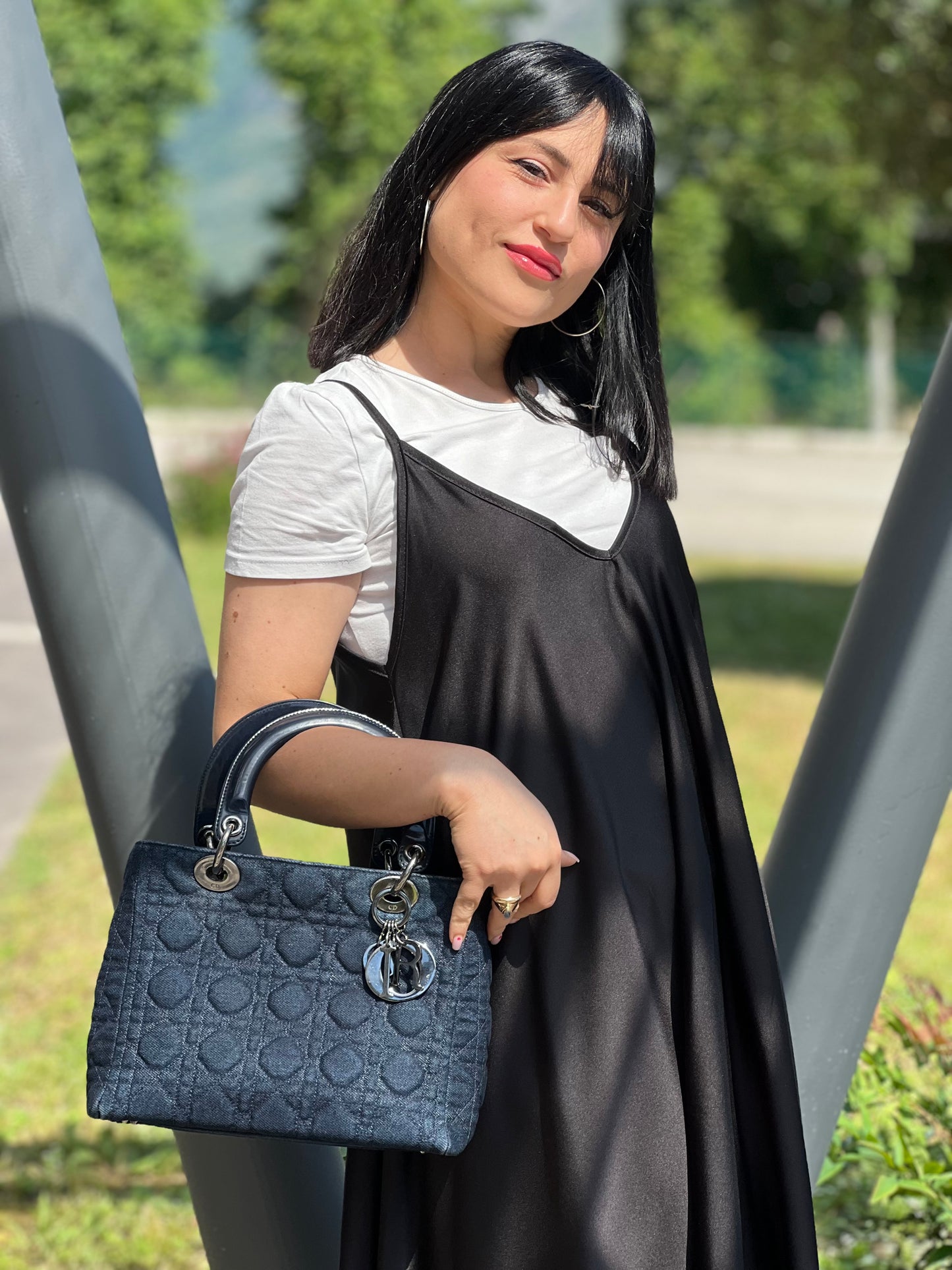Borsa Lady Dior media in denim, un'icona senza tempo reinterpretata in tessuto jeans per un look casual-chic. Impreziosita da charm metallici con logo Dior.