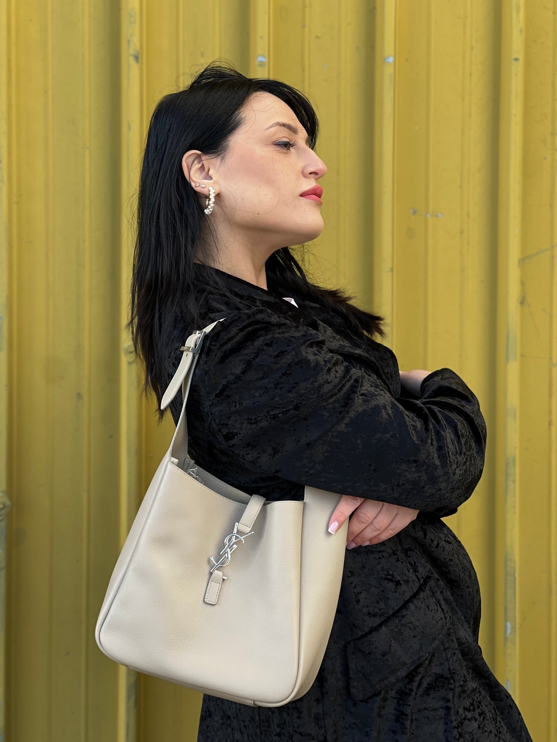 Descrizione: Borsa Saint Laurent LE 5 À 7 Piccola in pelle martellata beige dotata di manico regolabile con fibbia e rifinita con parti metalliche argentate e iconico logo Cassandre sulla chiusura. Completa di corredo