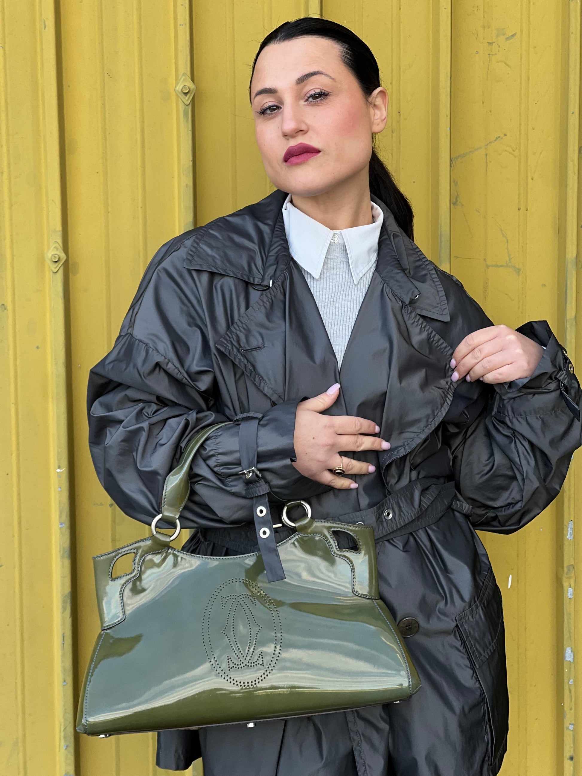 Descrizione: Borsa Cartier Marcello in pelle verniciata verde oliva con parti metalliche argento opaco. Munita di doppi manici e rifinita con logo forato sul front. Completa di dustbag