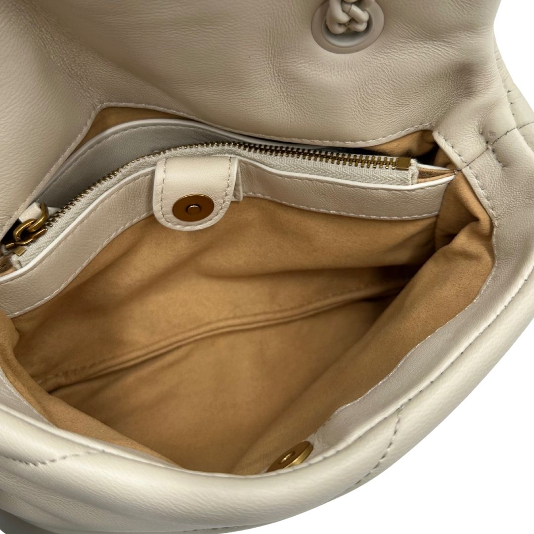 Descrizione: Borsa Pinko in pelle matelassè bianco panna con parti metalliche tono su tono; munita di una tracolla in catena scorrevole con spallaccio in pelle. Completa di dustbag e cartellini.