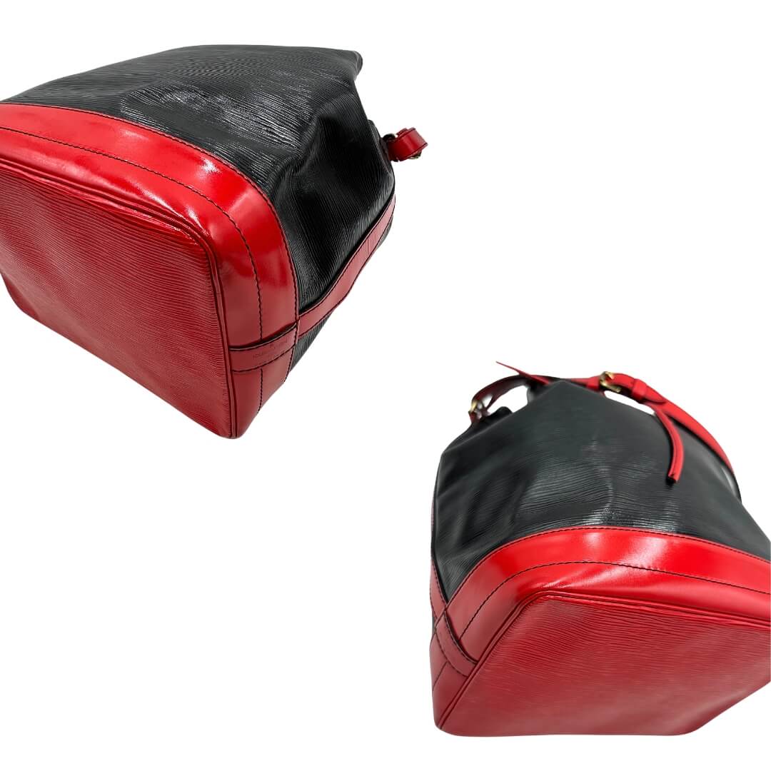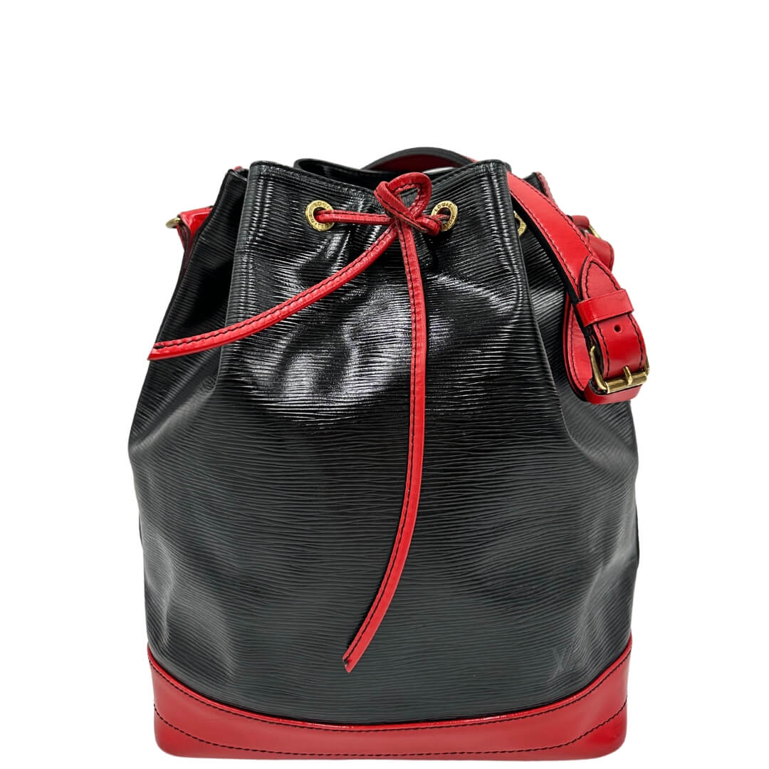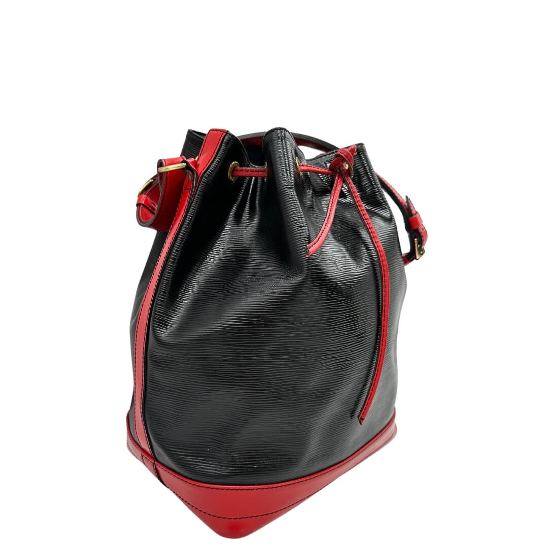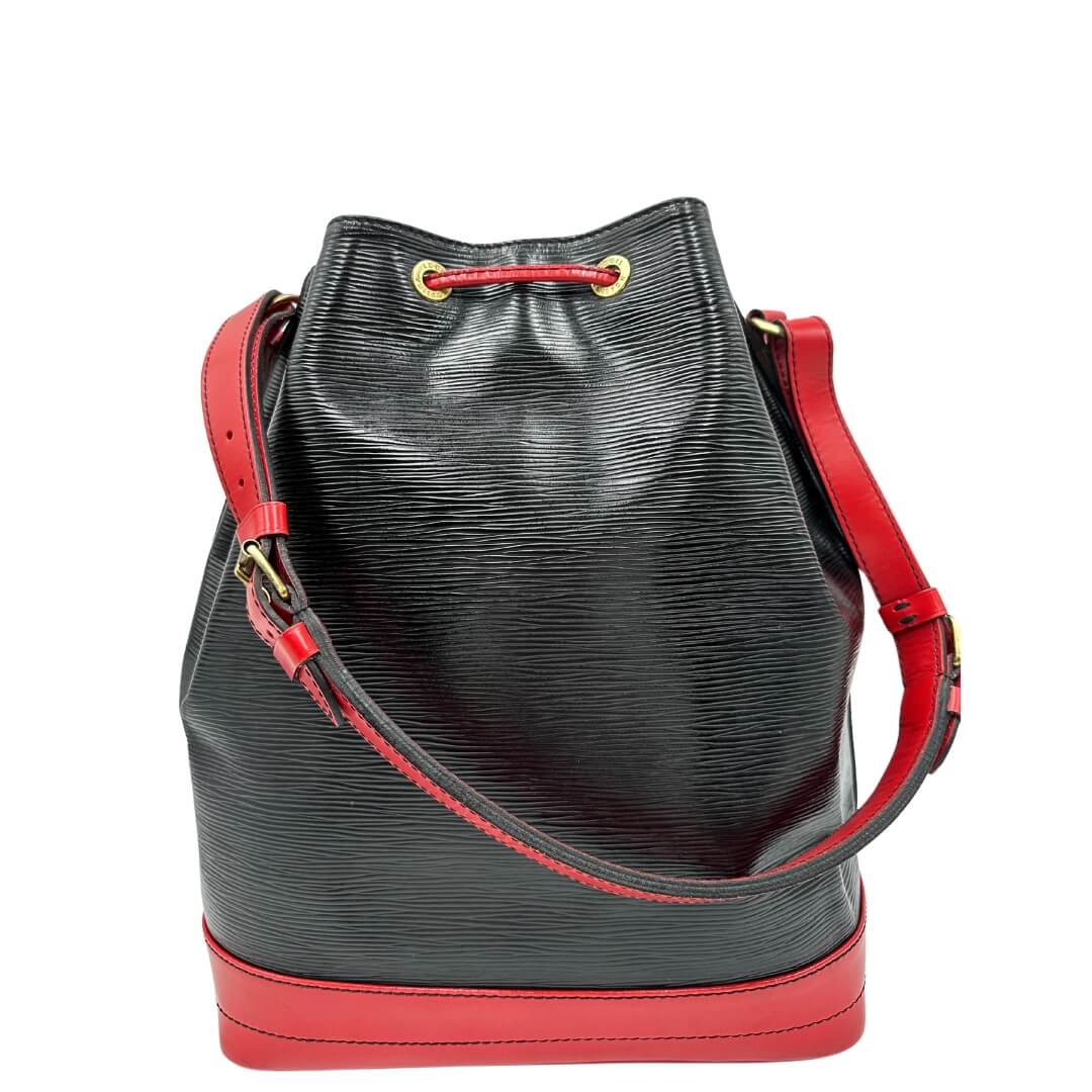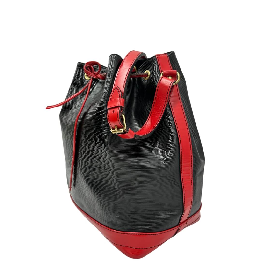 Descrizione: Secchiello Noé LV in pelle Epi nera con finiture in pelle liscia rossa e parti metalliche dorate.