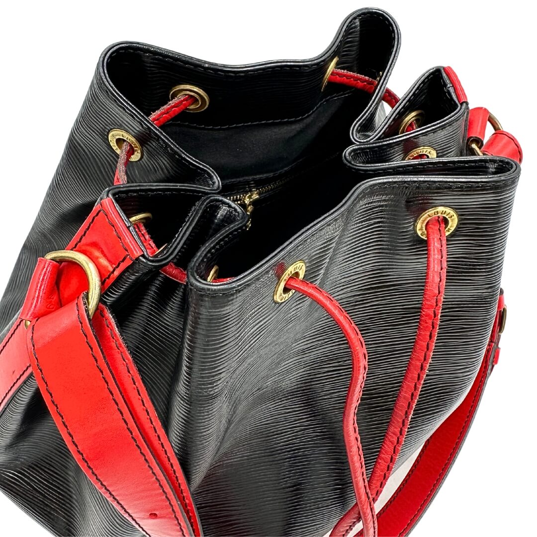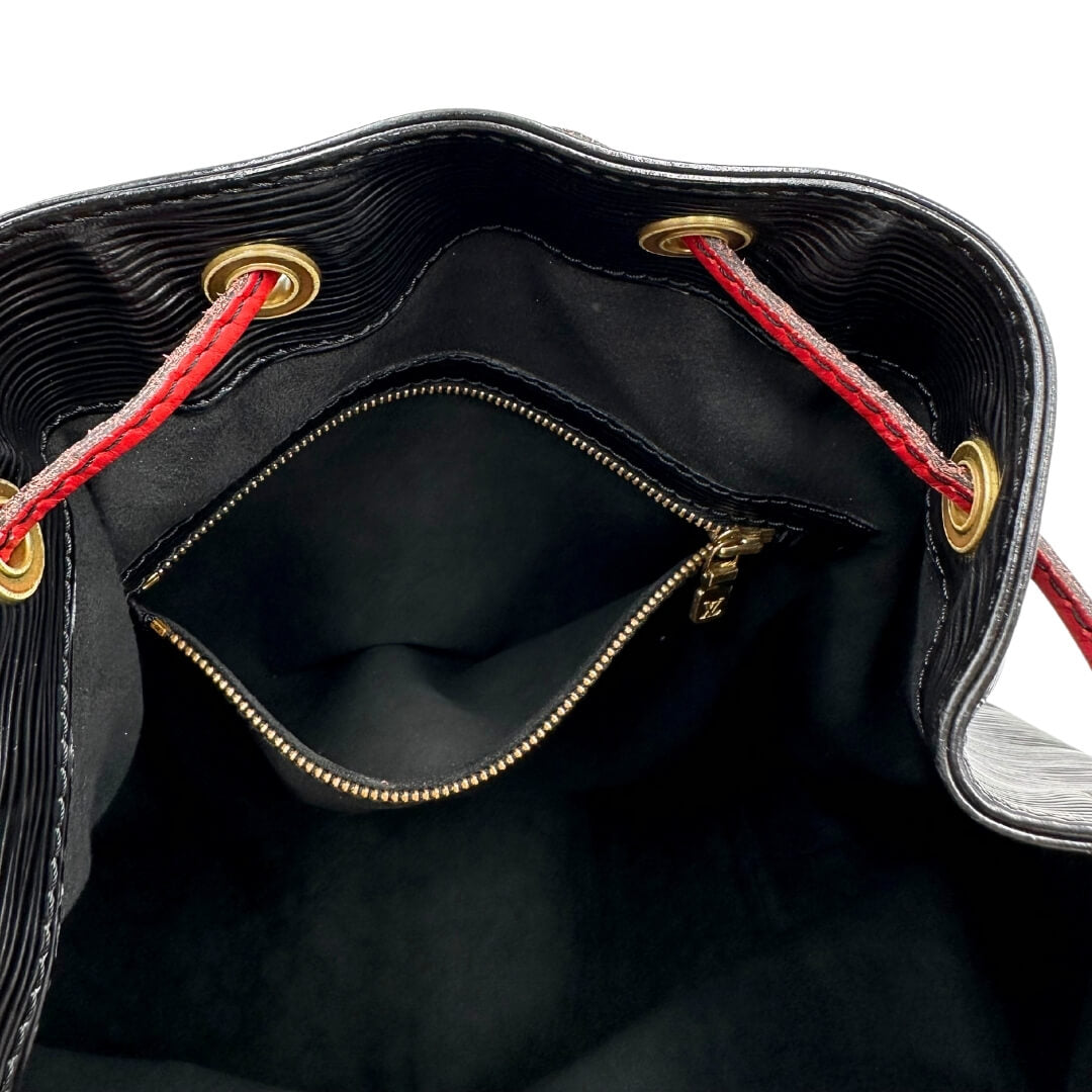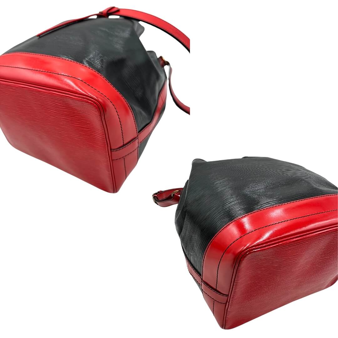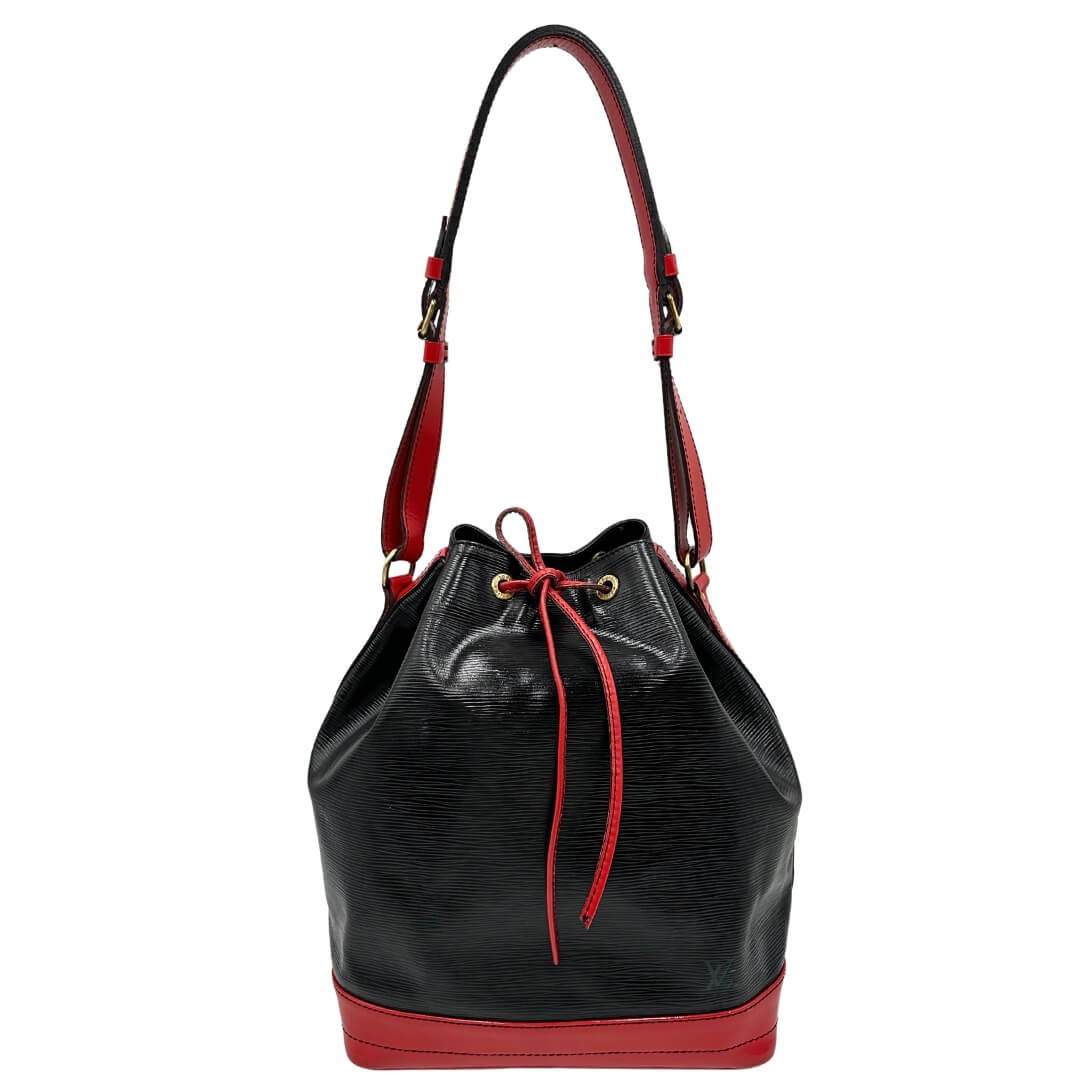 Descrizione: Secchiello Noé LV in pelle Epi nera con finiture in pelle liscia rossa e parti metalliche dorate.