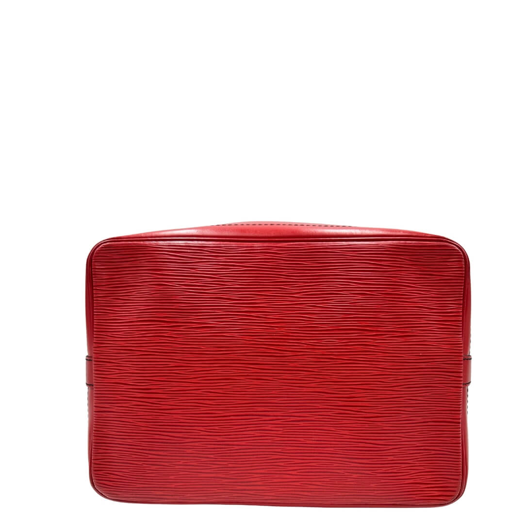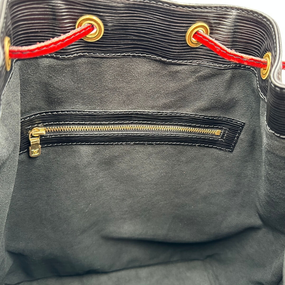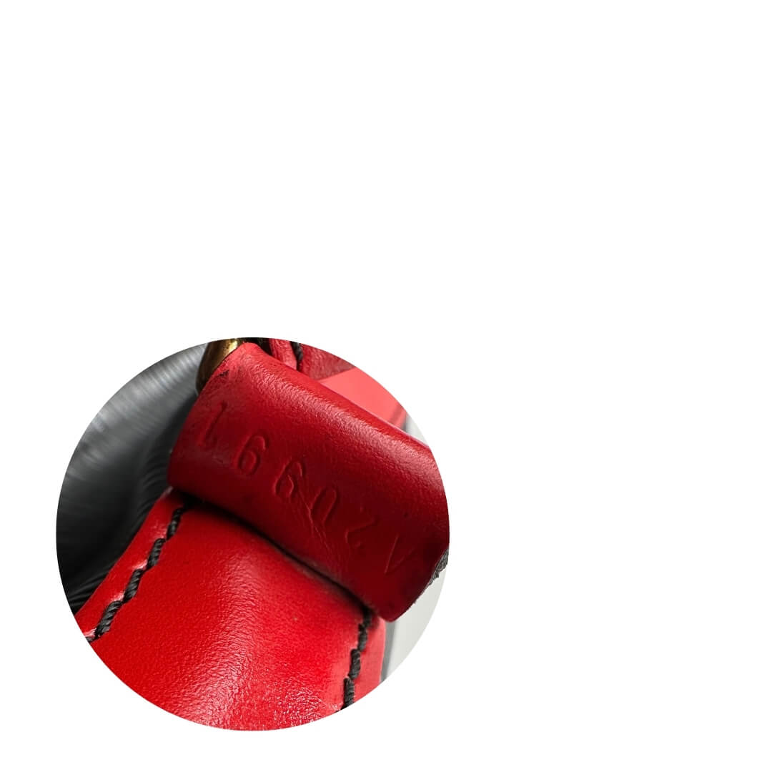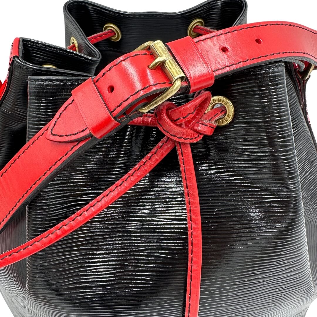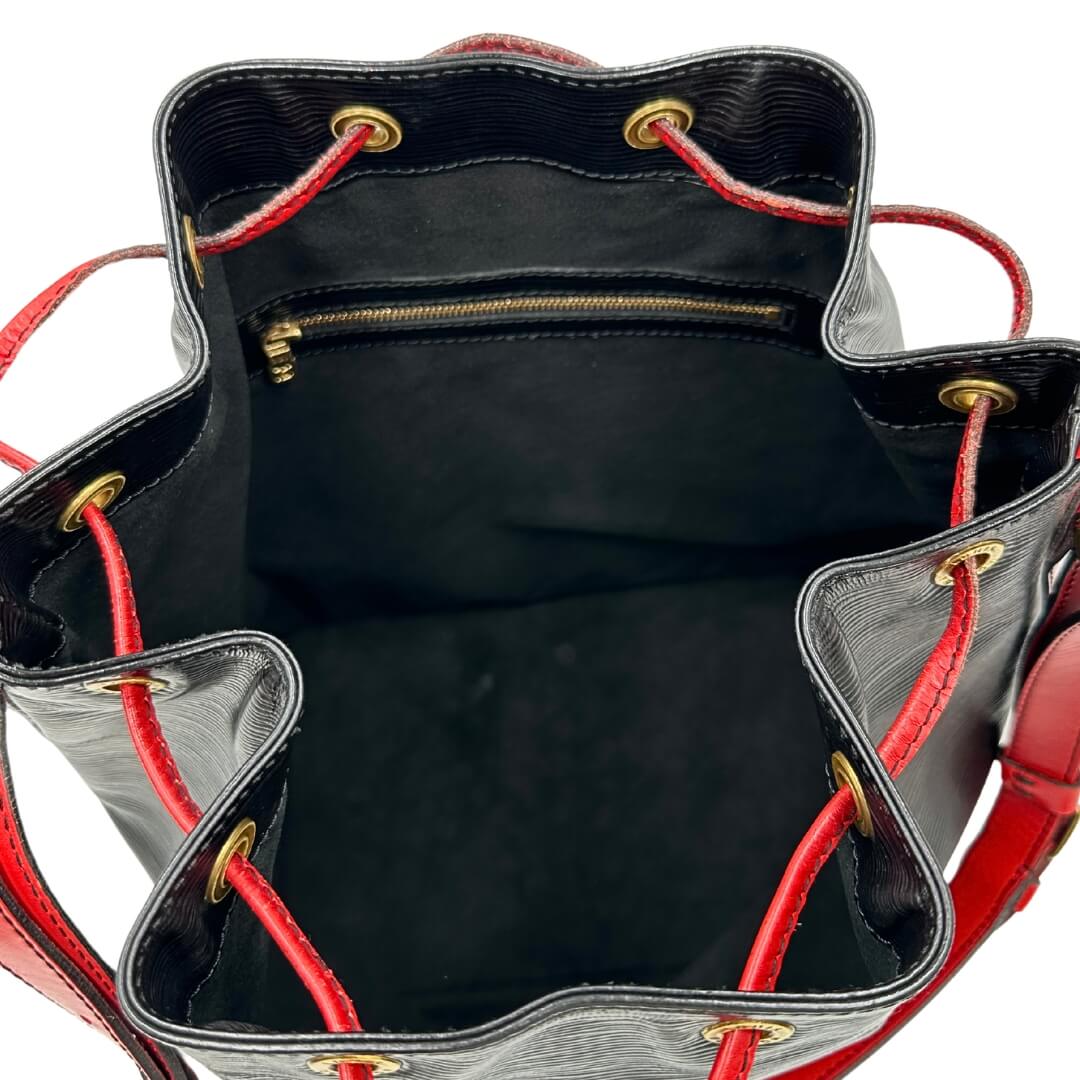 Descrizione: Secchiello Noé LV in pelle Epi nera con finiture in pelle liscia rossa e parti metalliche dorate.