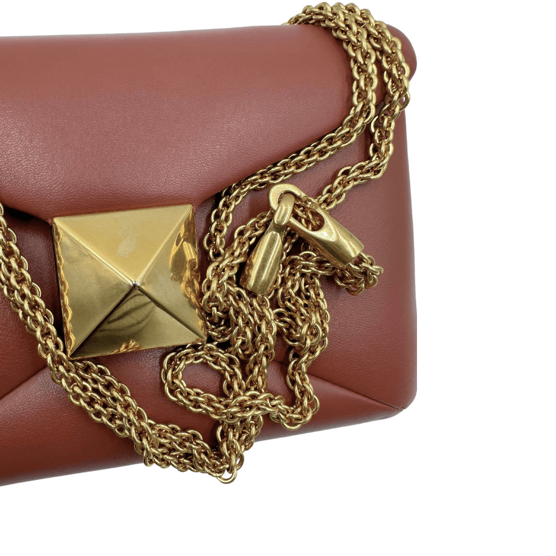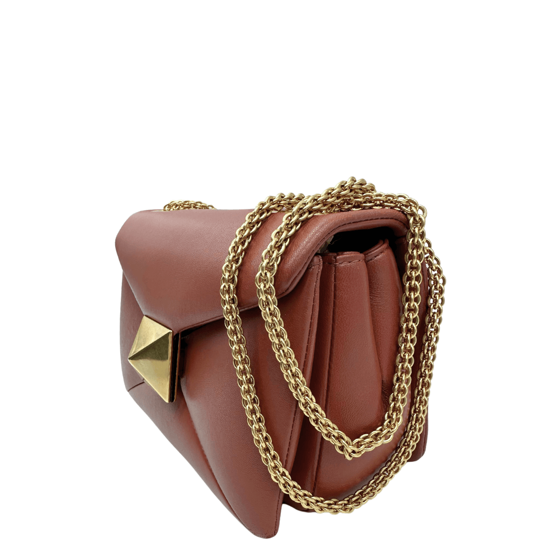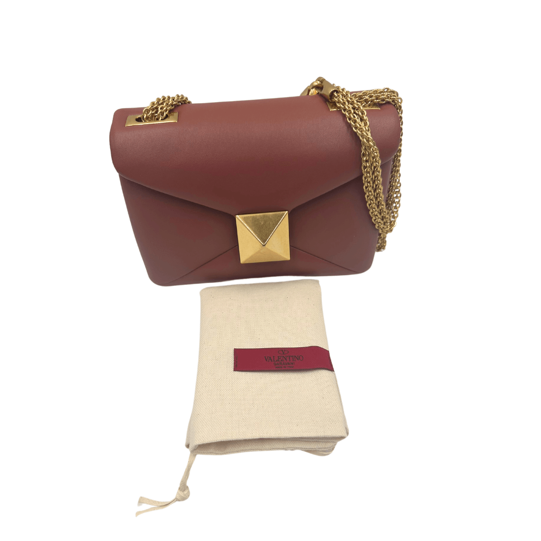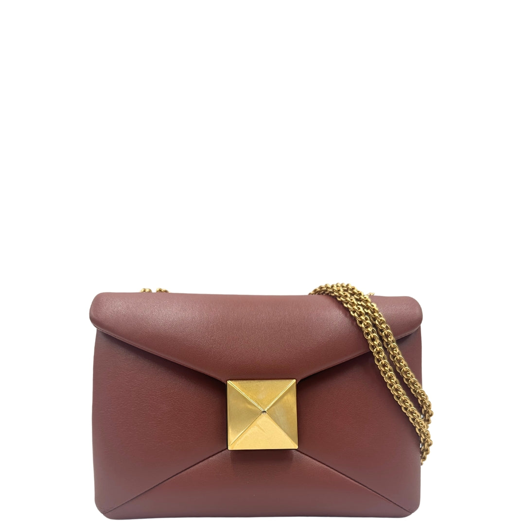 Descrizione: Borsa One Stud Valentino Garavani in pelle color marsala con tracolla in catena scorrevole e iconica chiusura con maxi borchia piramidale. Completa di dustbag.
