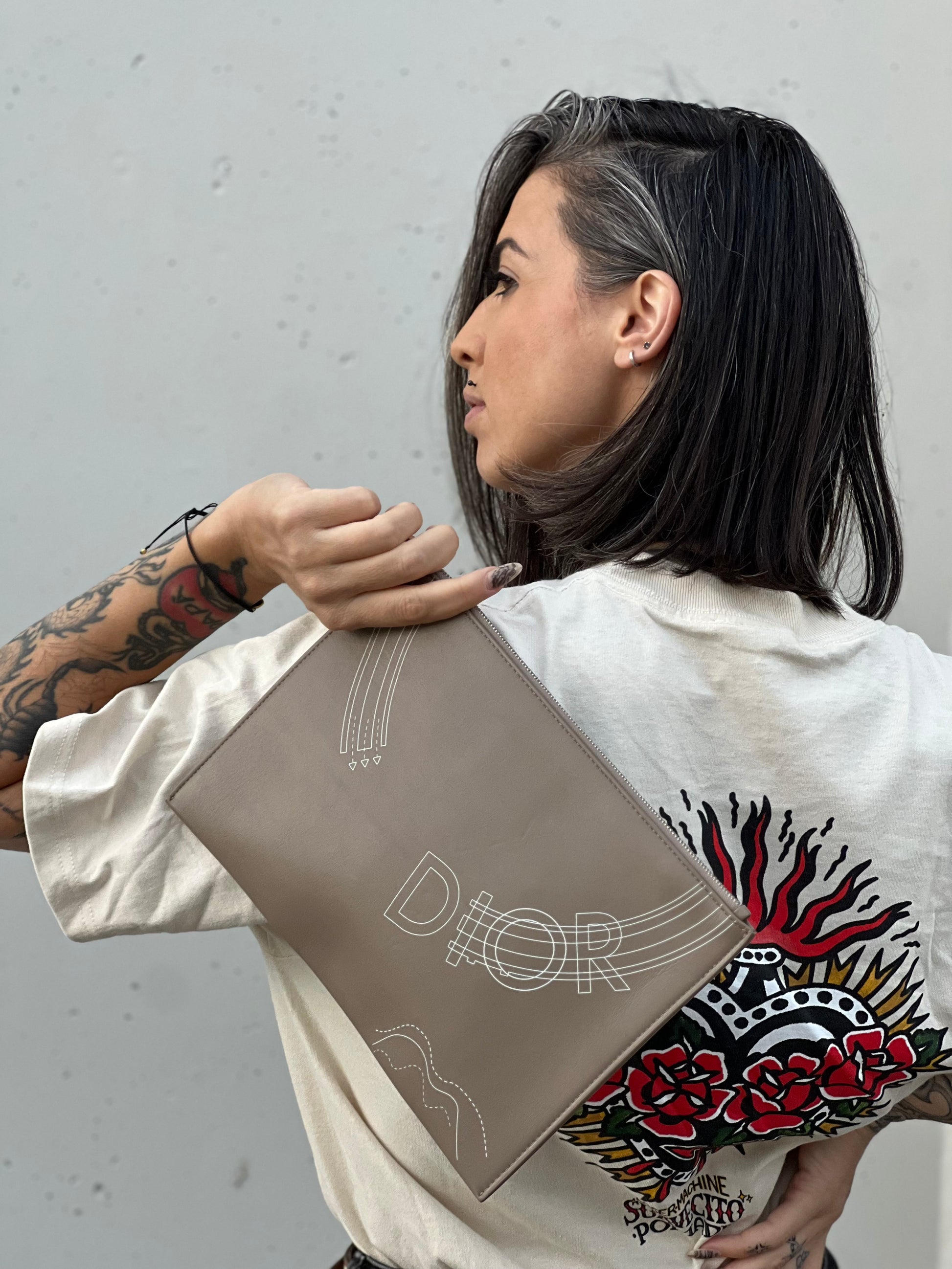 Descrizione: Pochette in pelle color fango con parti metalliche argentate; da portare a mano.