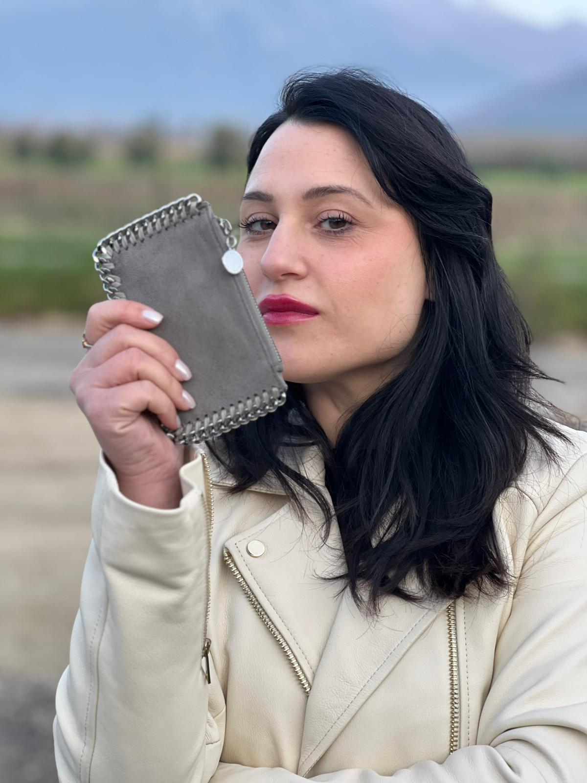 Descrizione: Portacarte Stella McCartney in tessuto vegano grigio con parti metalliche argentate.