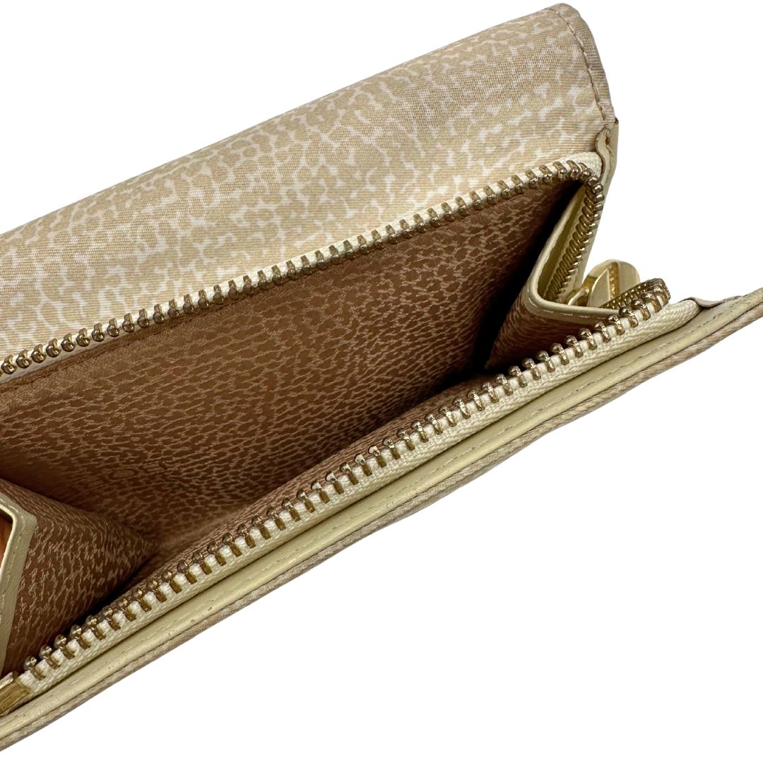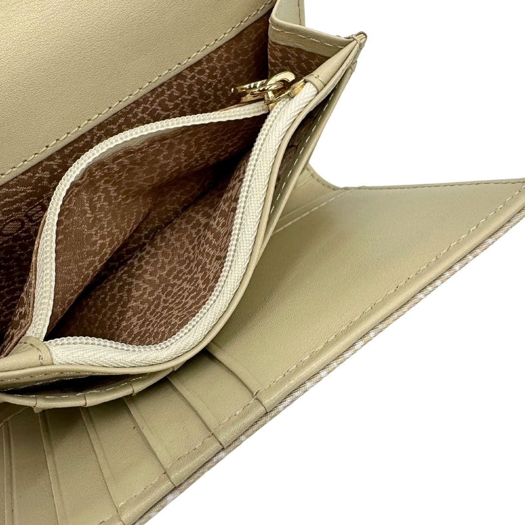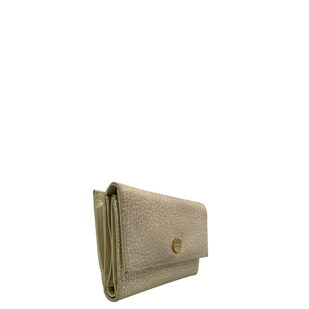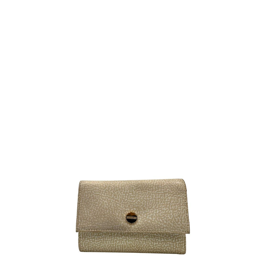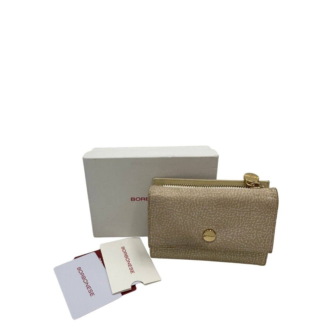 Descrizione: Portafoglio Borbonese in nylon beige con trama occhio di pernice e parti metalliche dorate. Interno in pelle tono su tono munito di scomparti per monete e carte. Completo di scatola