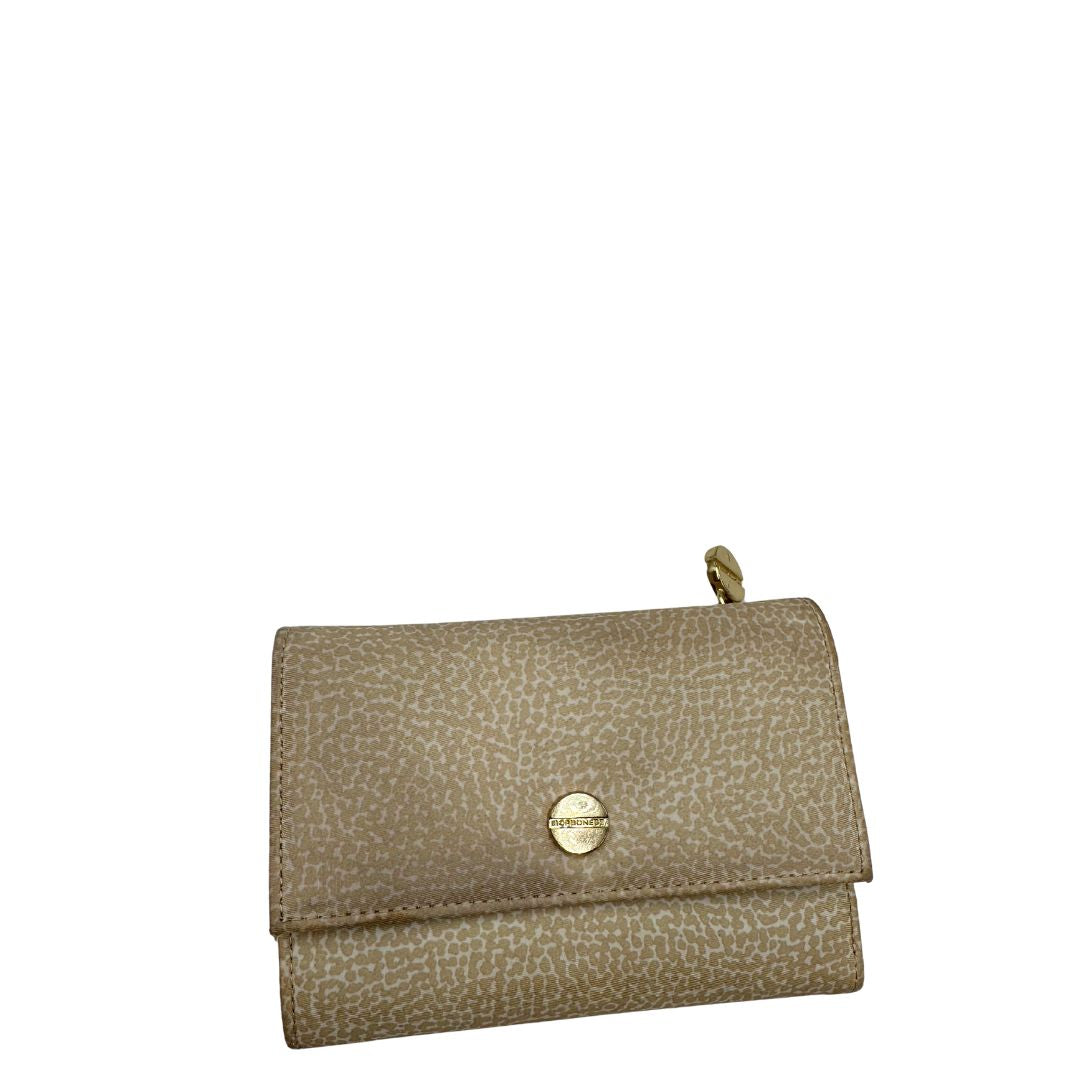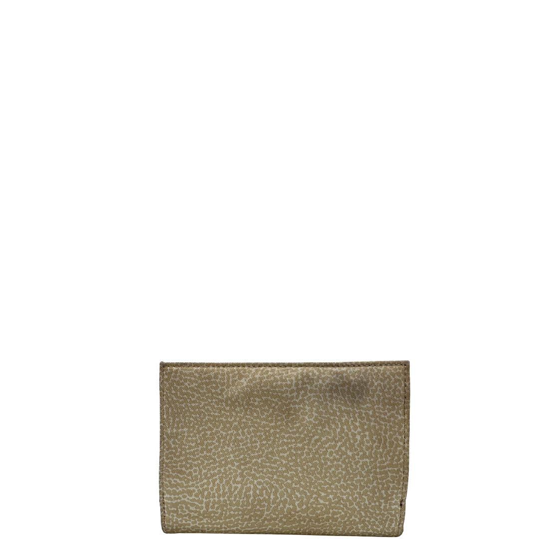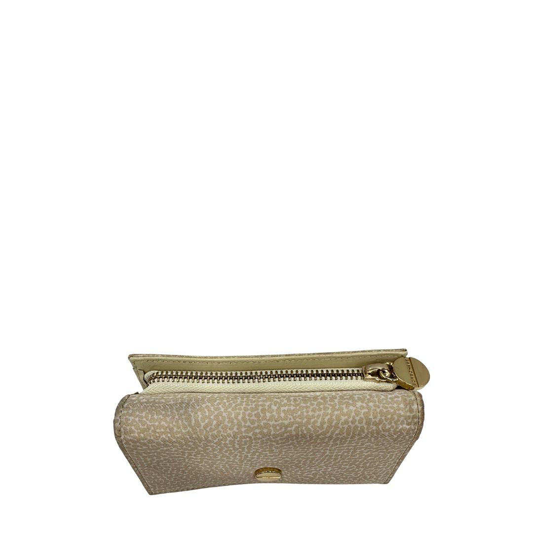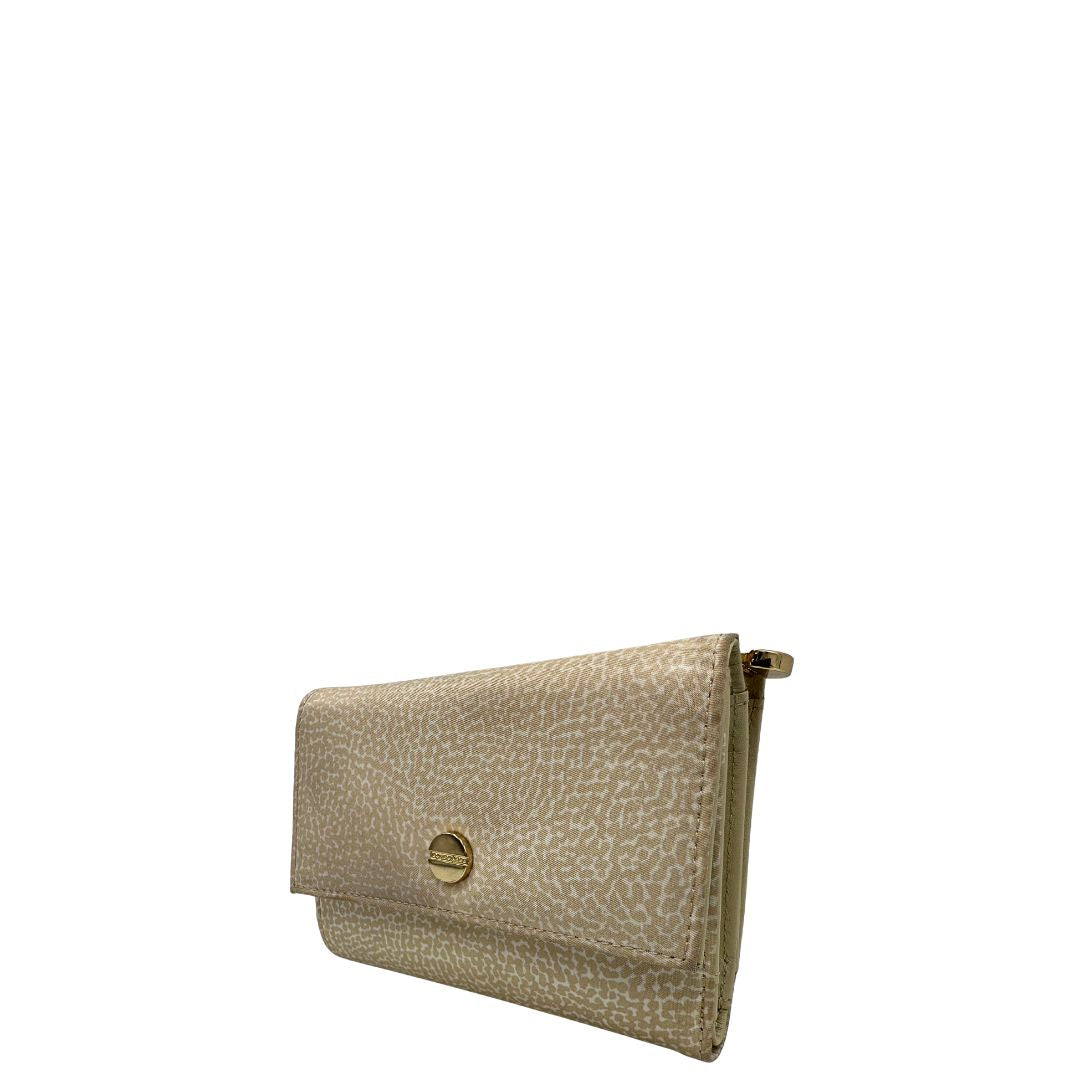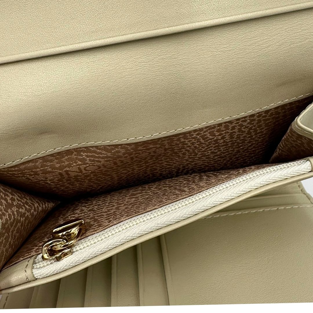 Descrizione: Portafoglio Borbonese in nylon beige con trama occhio di pernice e parti metalliche dorate. Interno in pelle tono su tono munito di scomparti per monete e carte. Completo di scatola