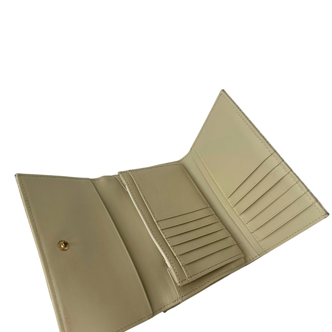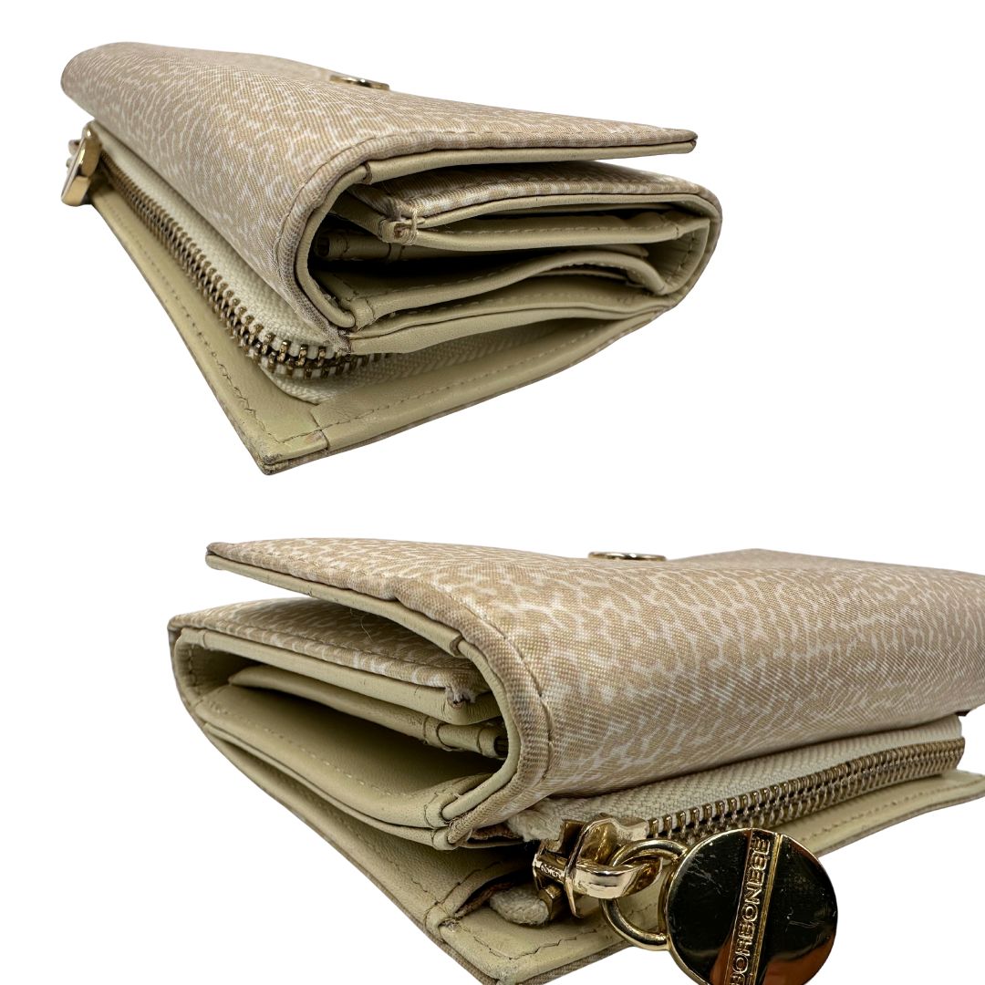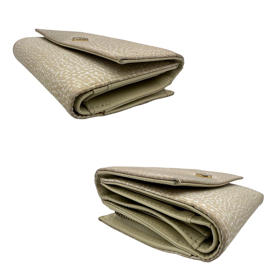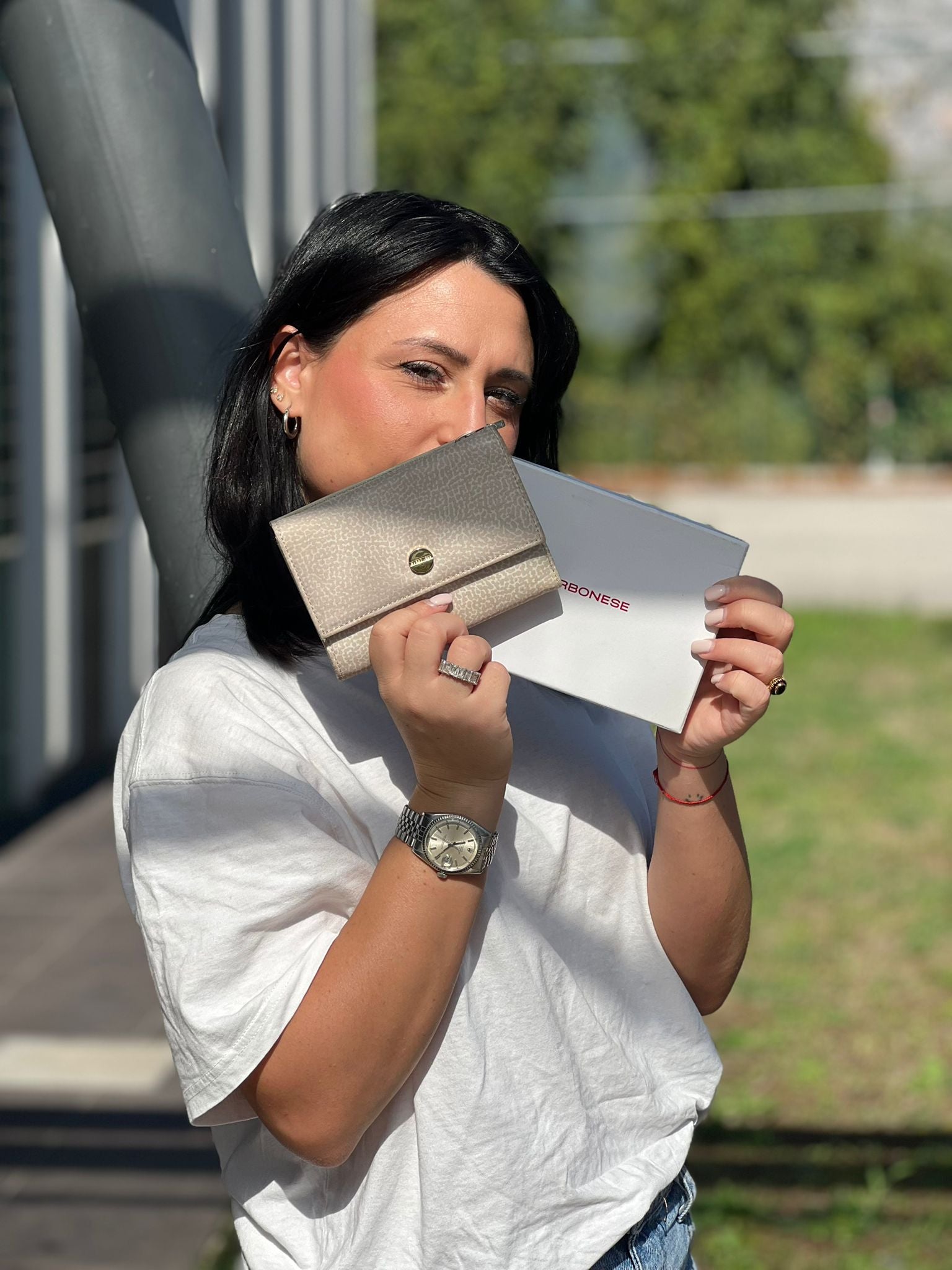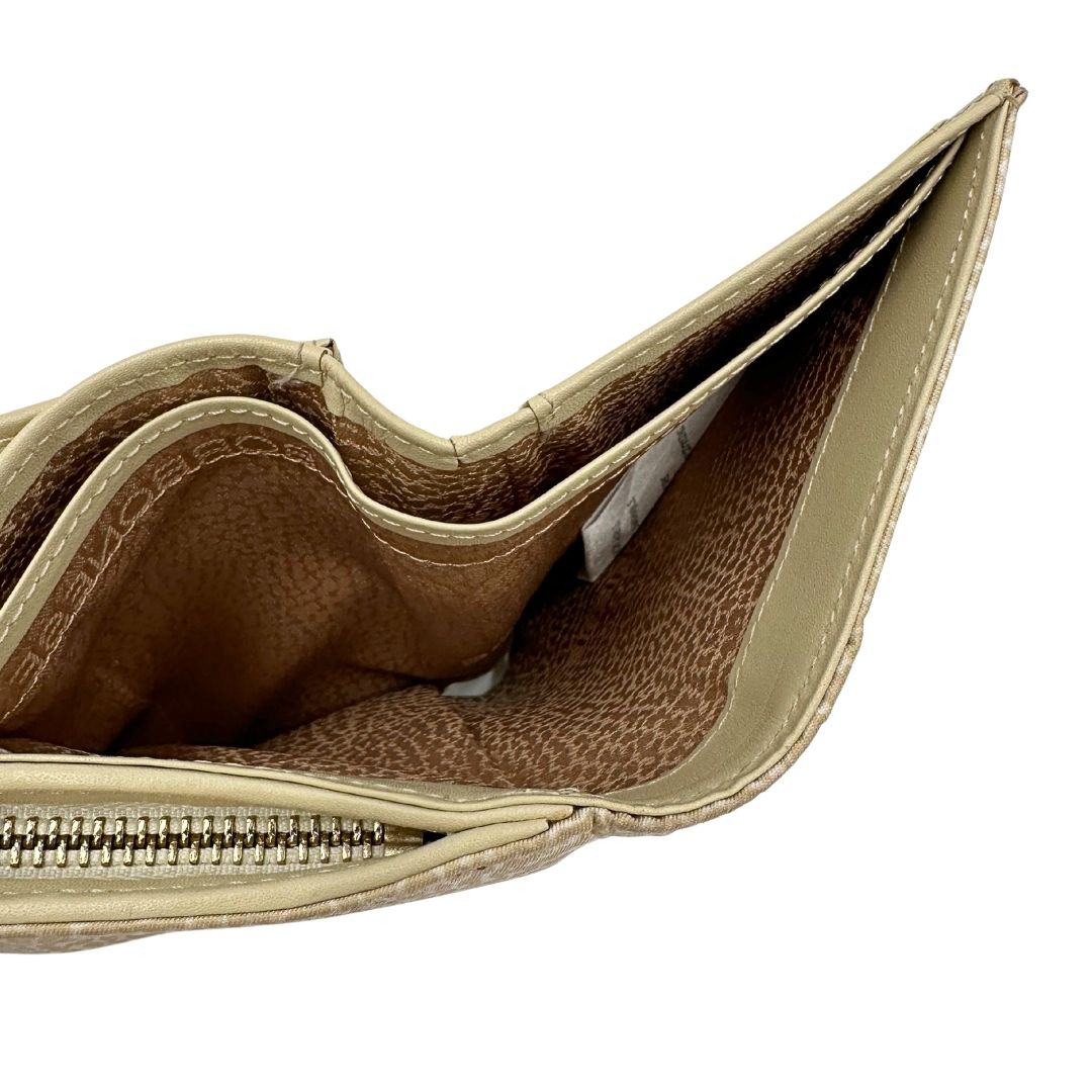 Descrizione: Portafoglio Borbonese in nylon beige con trama occhio di pernice e parti metalliche dorate. Interno in pelle tono su tono munito di scomparti per monete e carte. Completo di scatola
