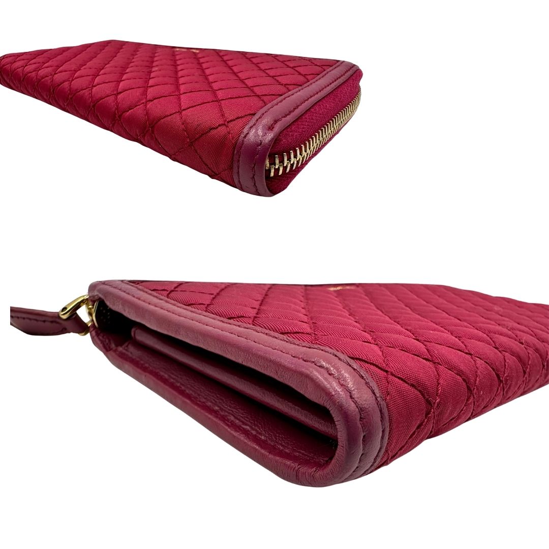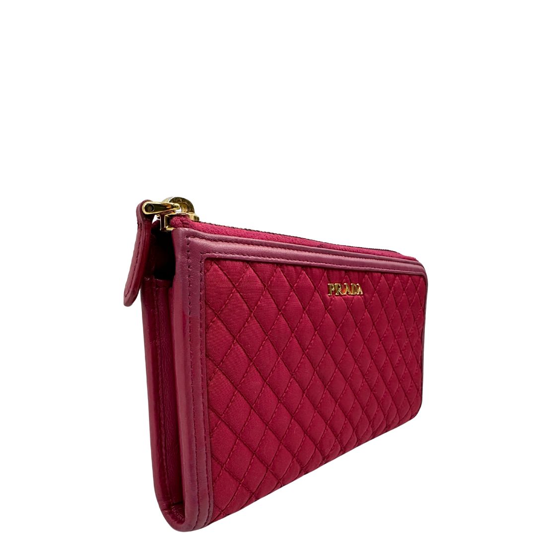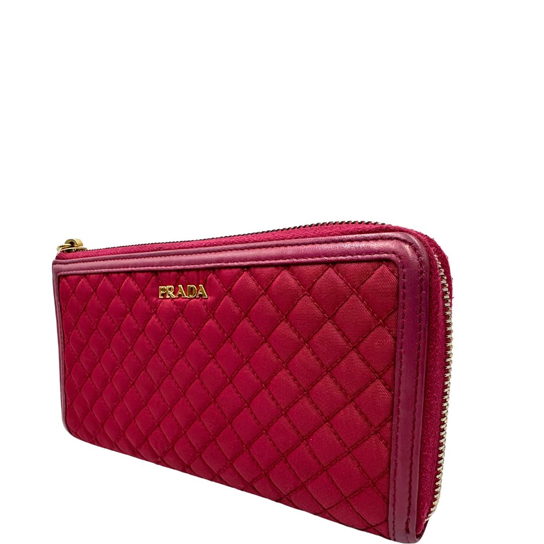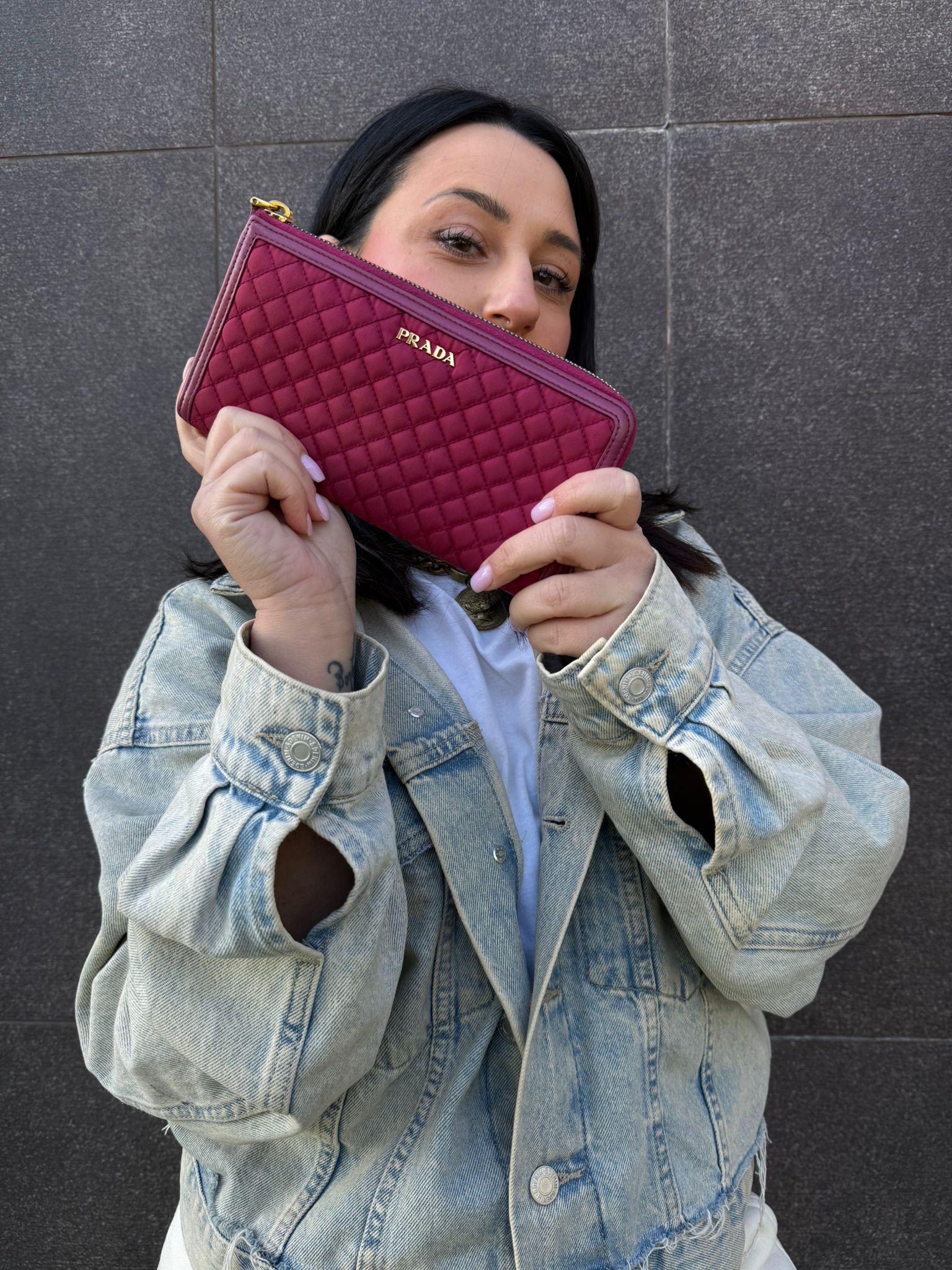 Descrizione: Portafoglio Prada in nylon trapuntato color amaranto con parti metalliche dorate e finiture in pelle tono su tono.
