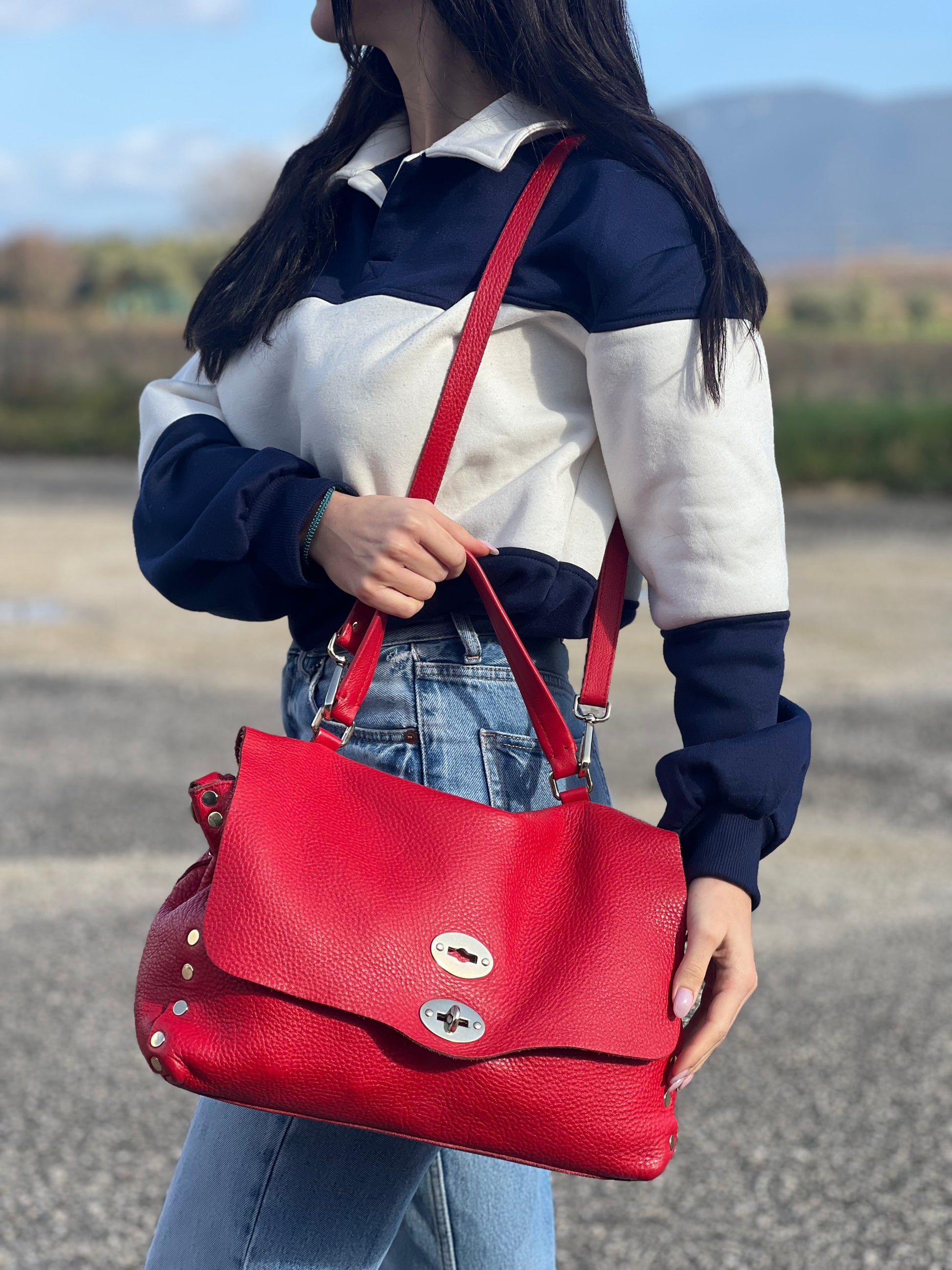 Descrizione: Borsa Zanellato in pelle martellata rossa con parti metalliche dorate; munita di un manico singolo e una tracolla amovibile e regolabile. Completa di dustbag.