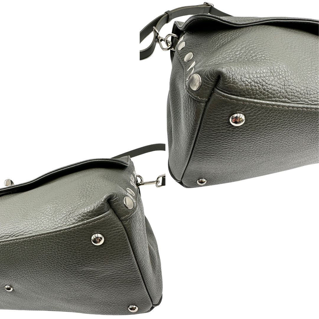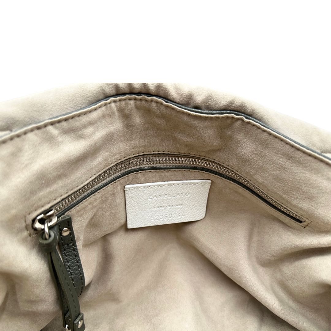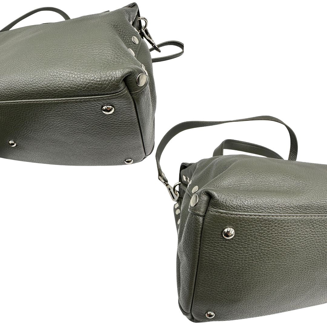 Descrizione: Borsa Zanellato in pelle martellata color verde fango con parti metalliche argentate; munita di un manico singolo e una tracolla amovibile e regolabile. Completa di dustbag.