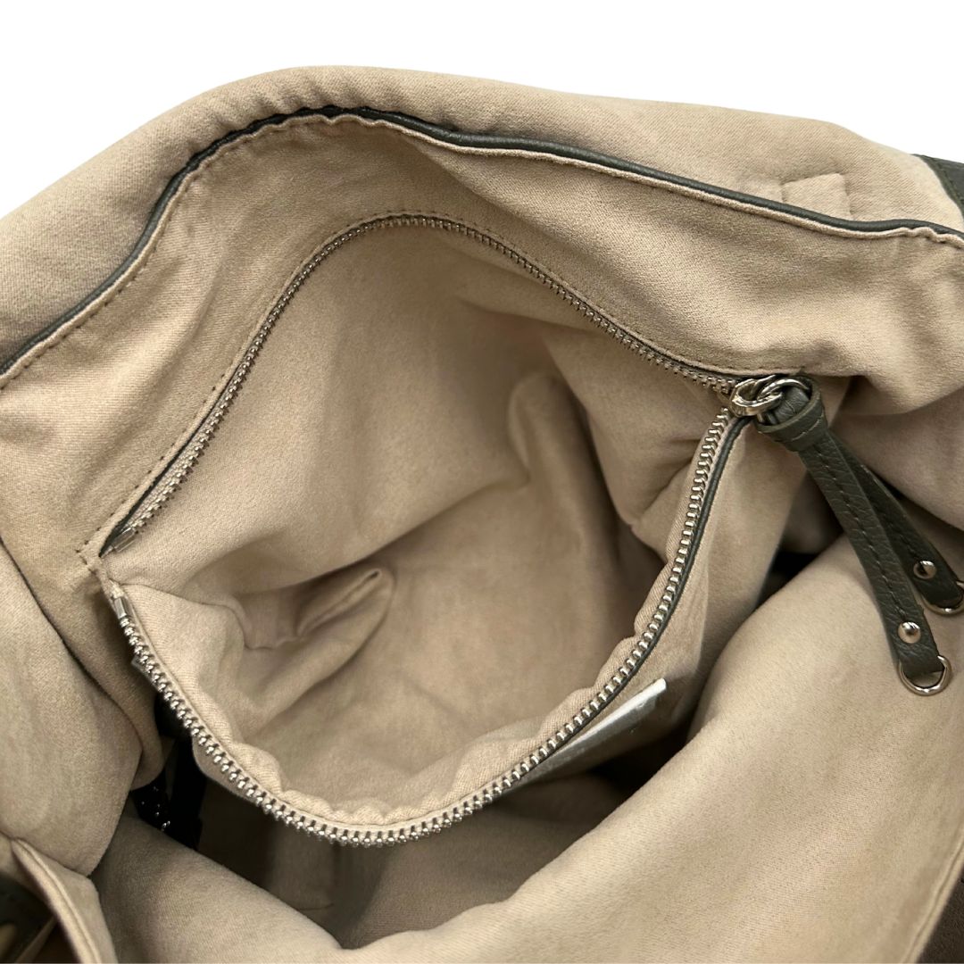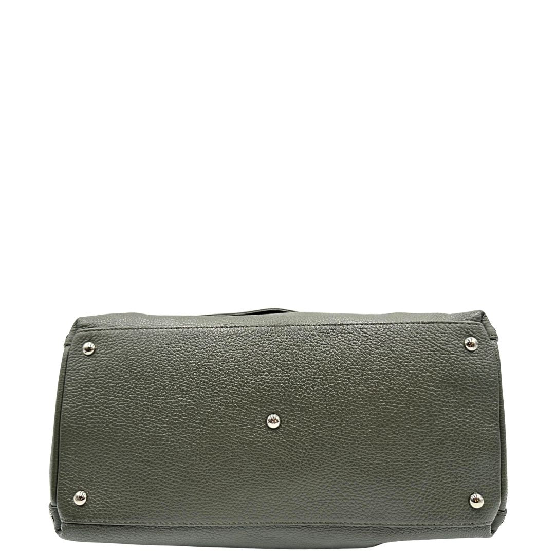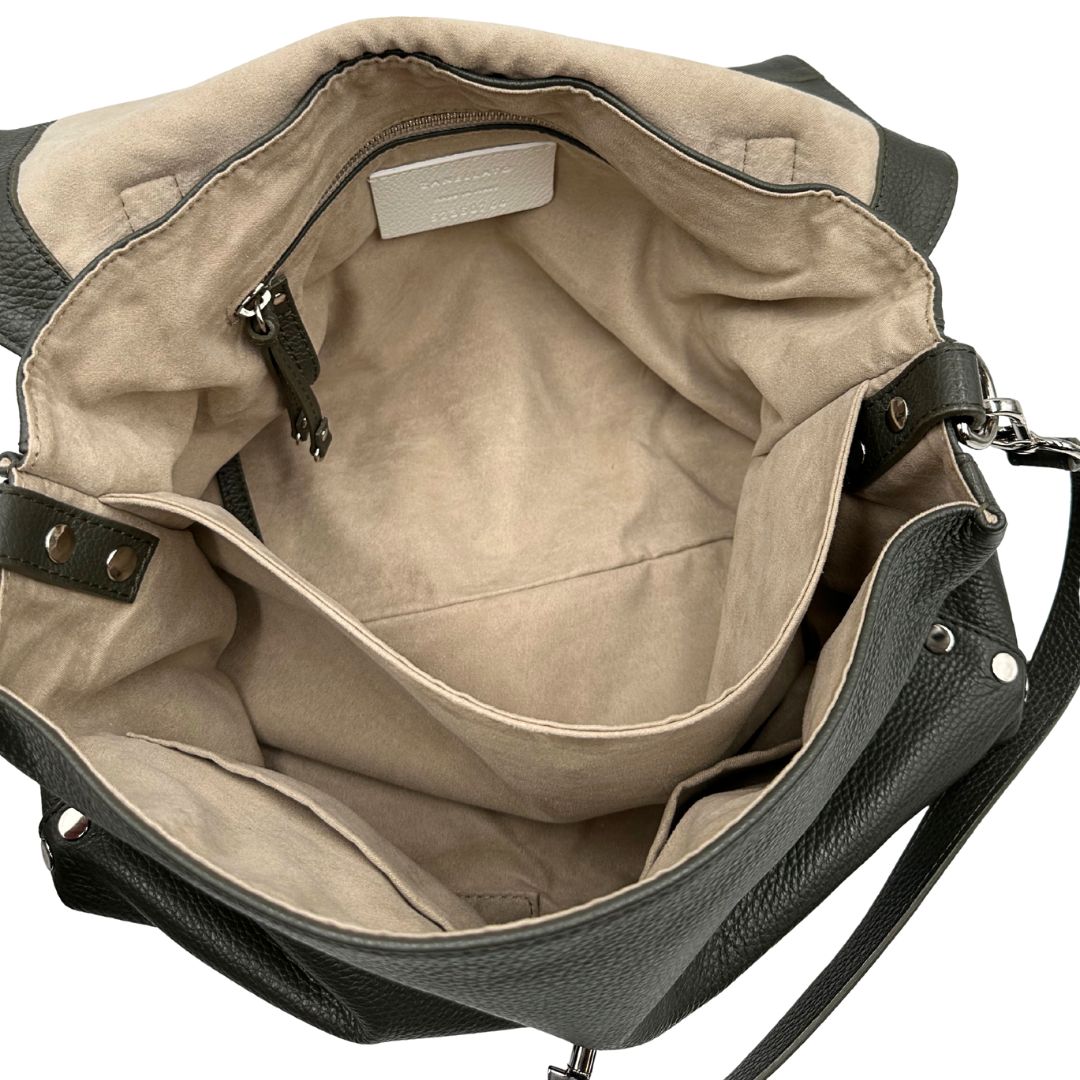 Descrizione: Borsa Zanellato in pelle martellata color verde fango con parti metalliche argentate; munita di un manico singolo e una tracolla amovibile e regolabile. Completa di dustbag.