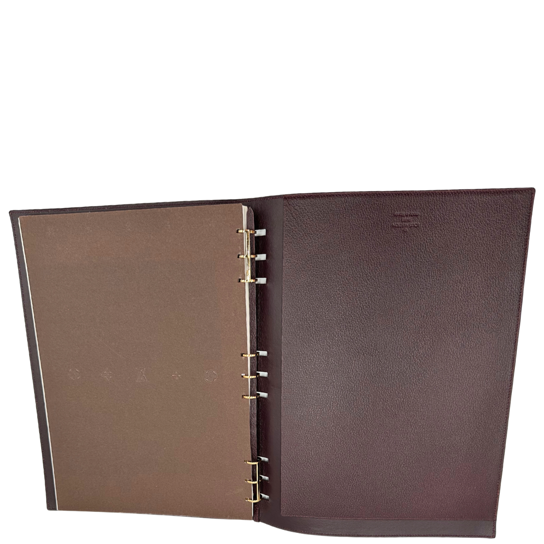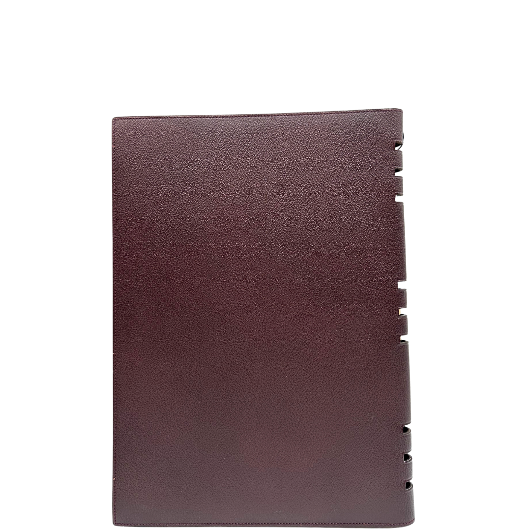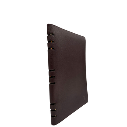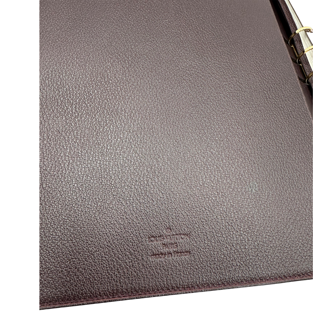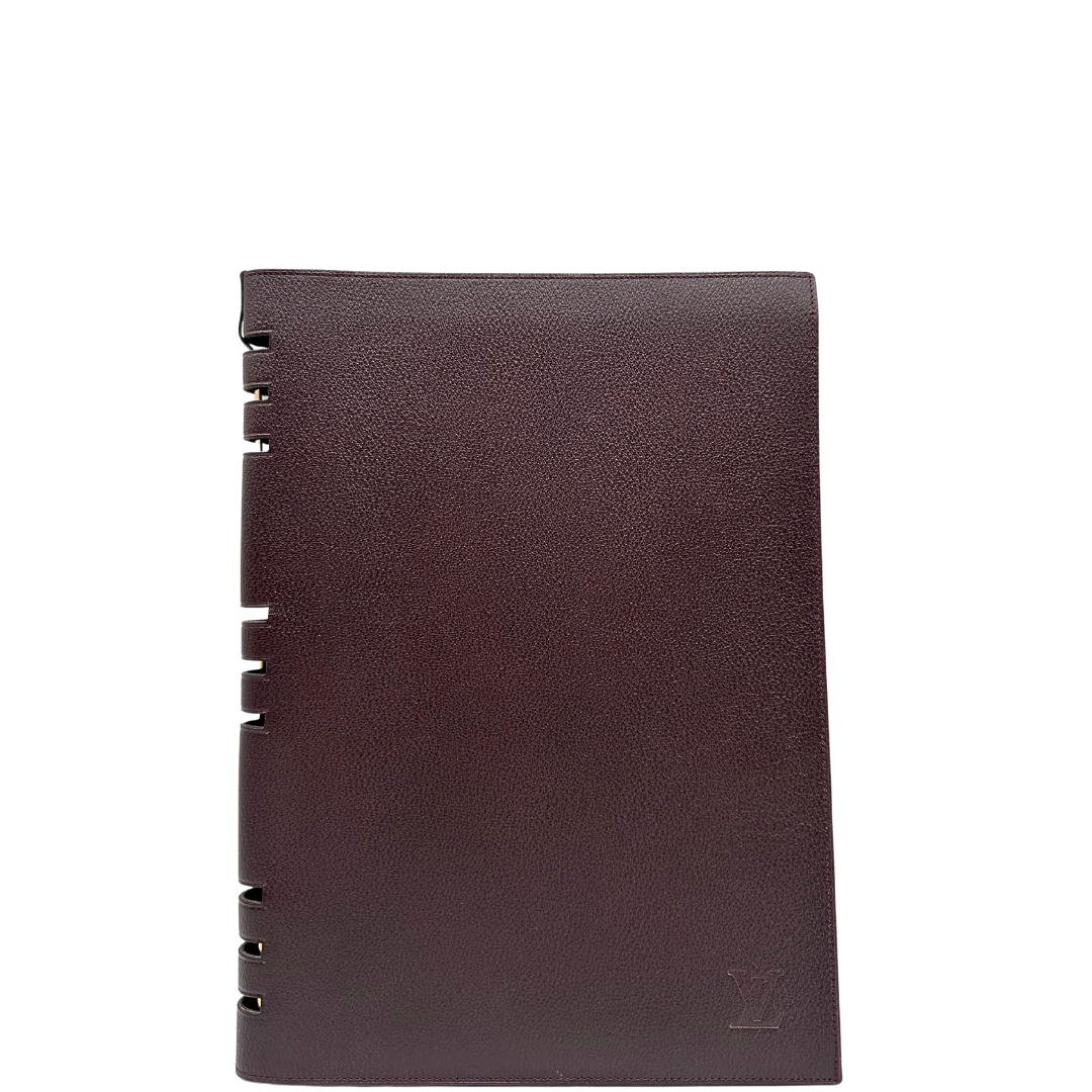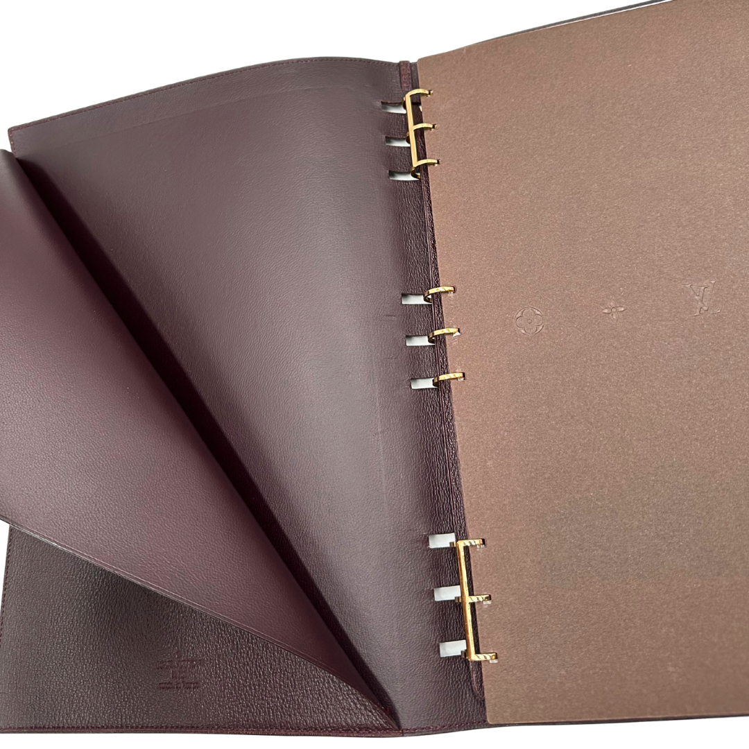 Elegante quaderno Louis Vuitton con copertina in pelle color bordeaux scuro e rilegatura ad anelli in metallo dorato. Può contenere fogli formato A4 slim o personalizzati.