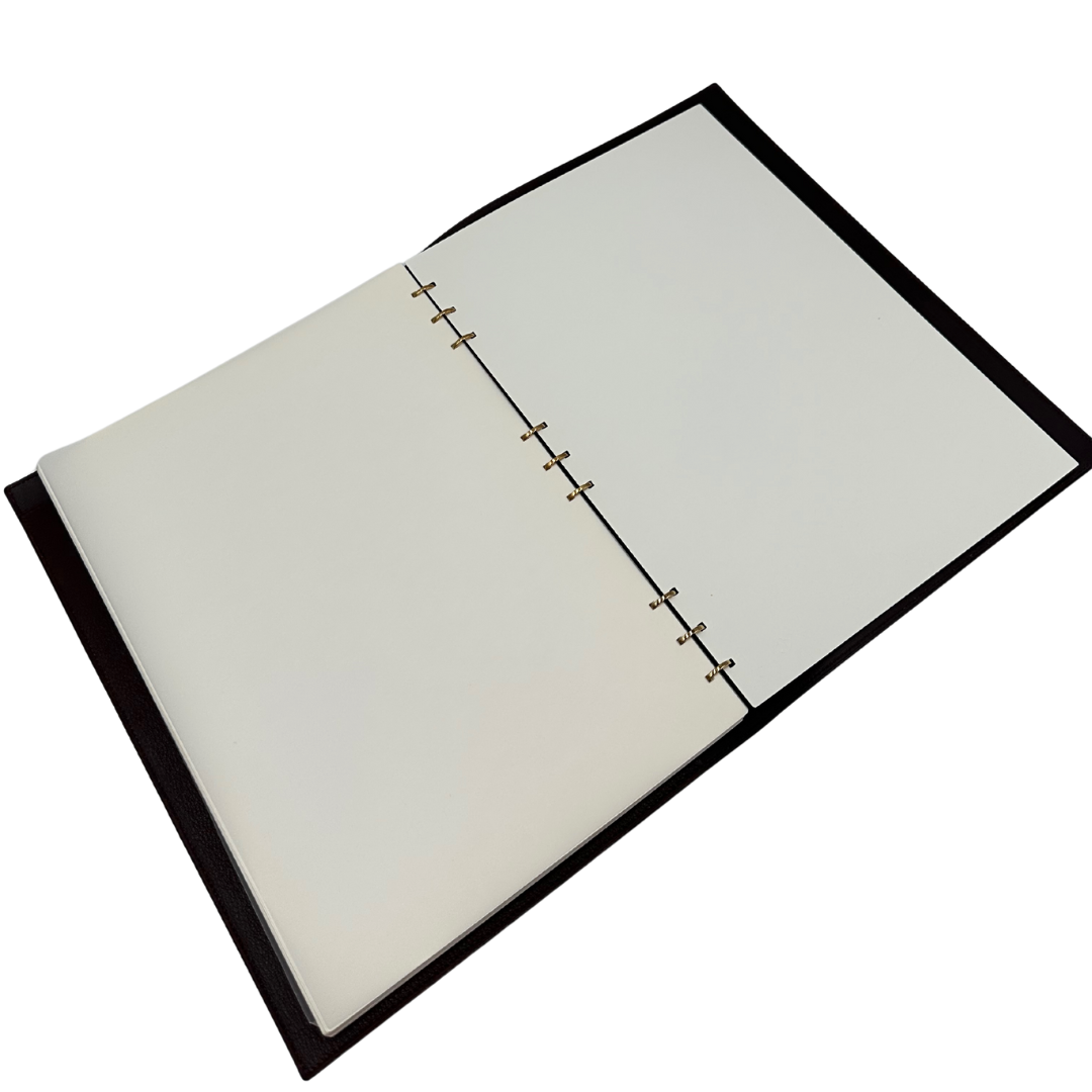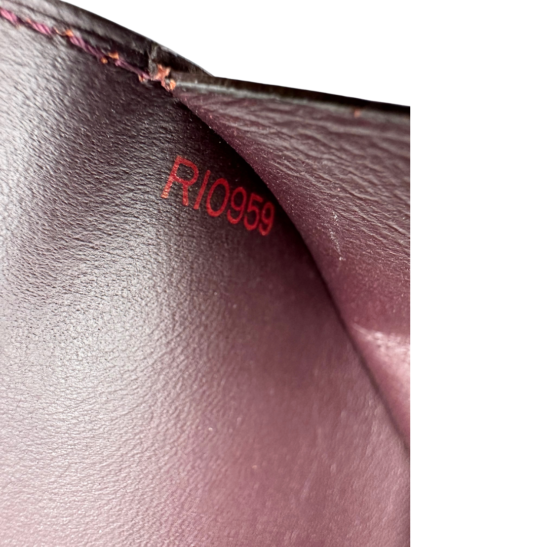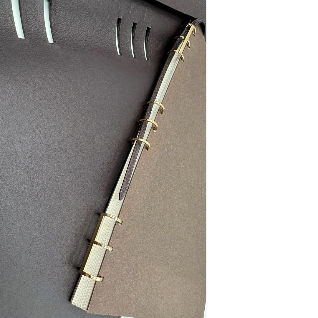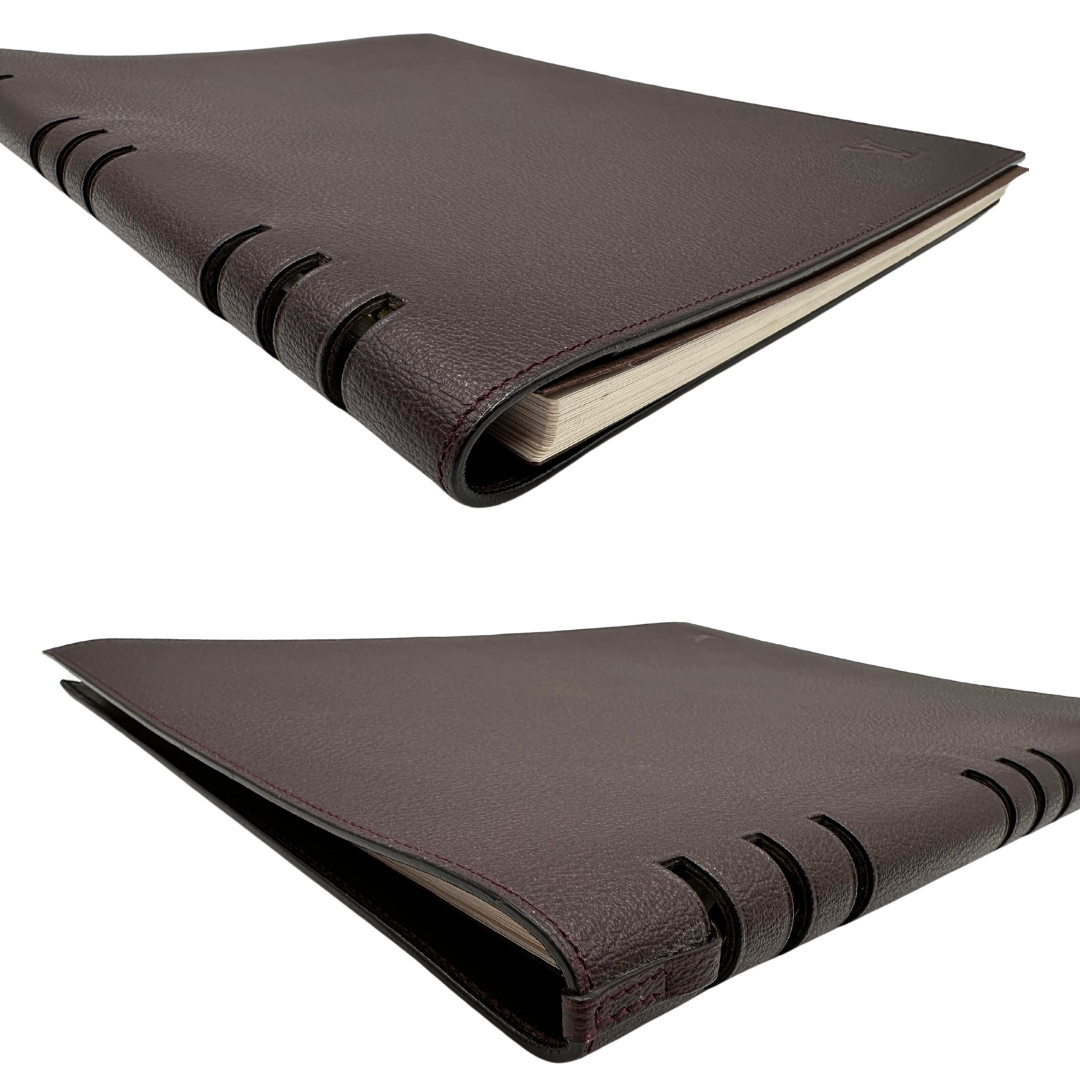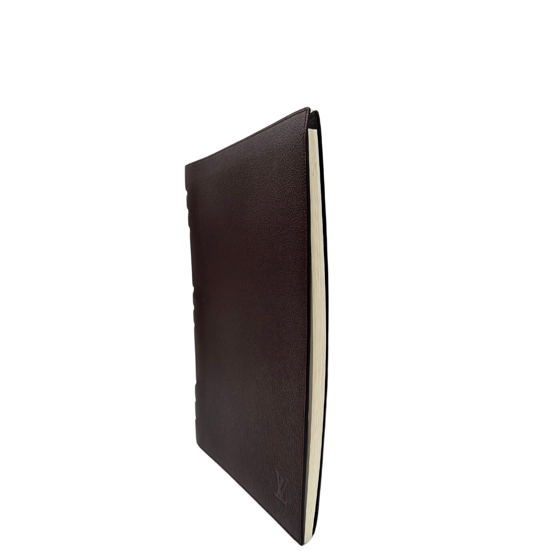Elegante quaderno Louis Vuitton con copertina in pelle color bordeaux scuro e rilegatura ad anelli in metallo dorato. Può contenere fogli formato A4 slim o personalizzati.