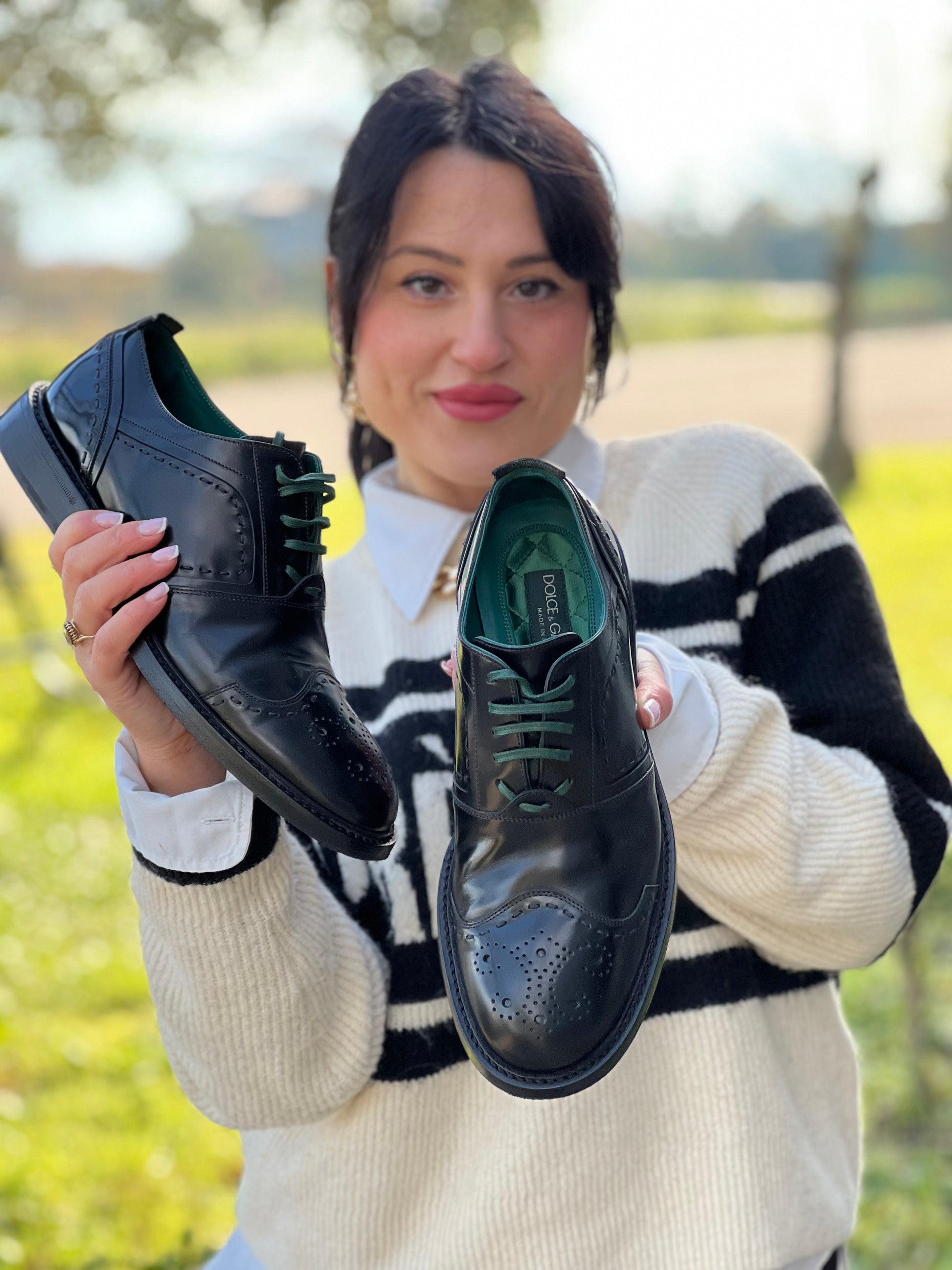 Descrizione: Scarpe D&G in pelle nera lucida; Presentano punzonatura decorativa sulla punta e lacci color verde petrolio. Complete di corredo