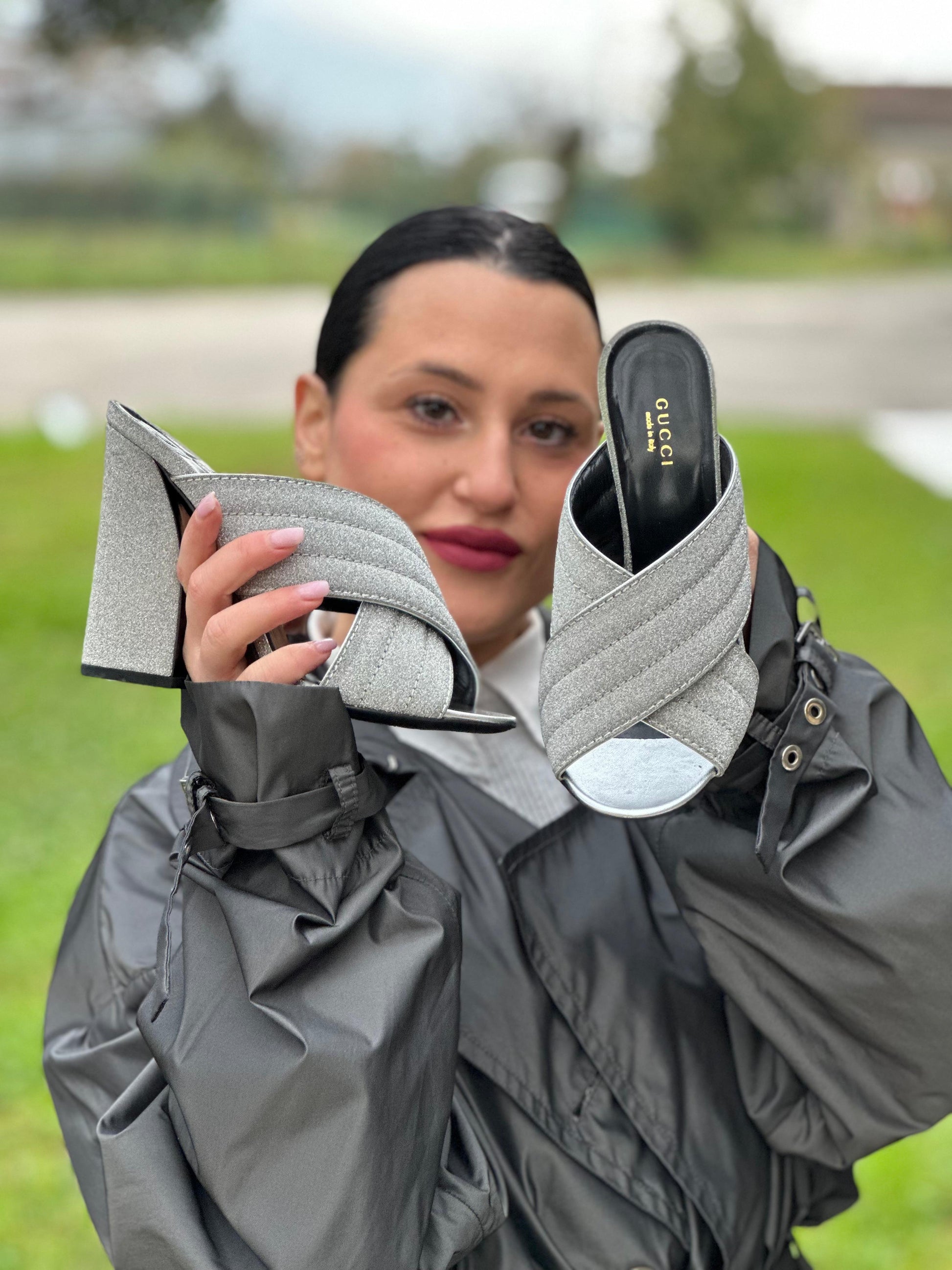 Descrizione: Sandali Gucci in pelle rivestito in lurex argento. Complete di corredo.