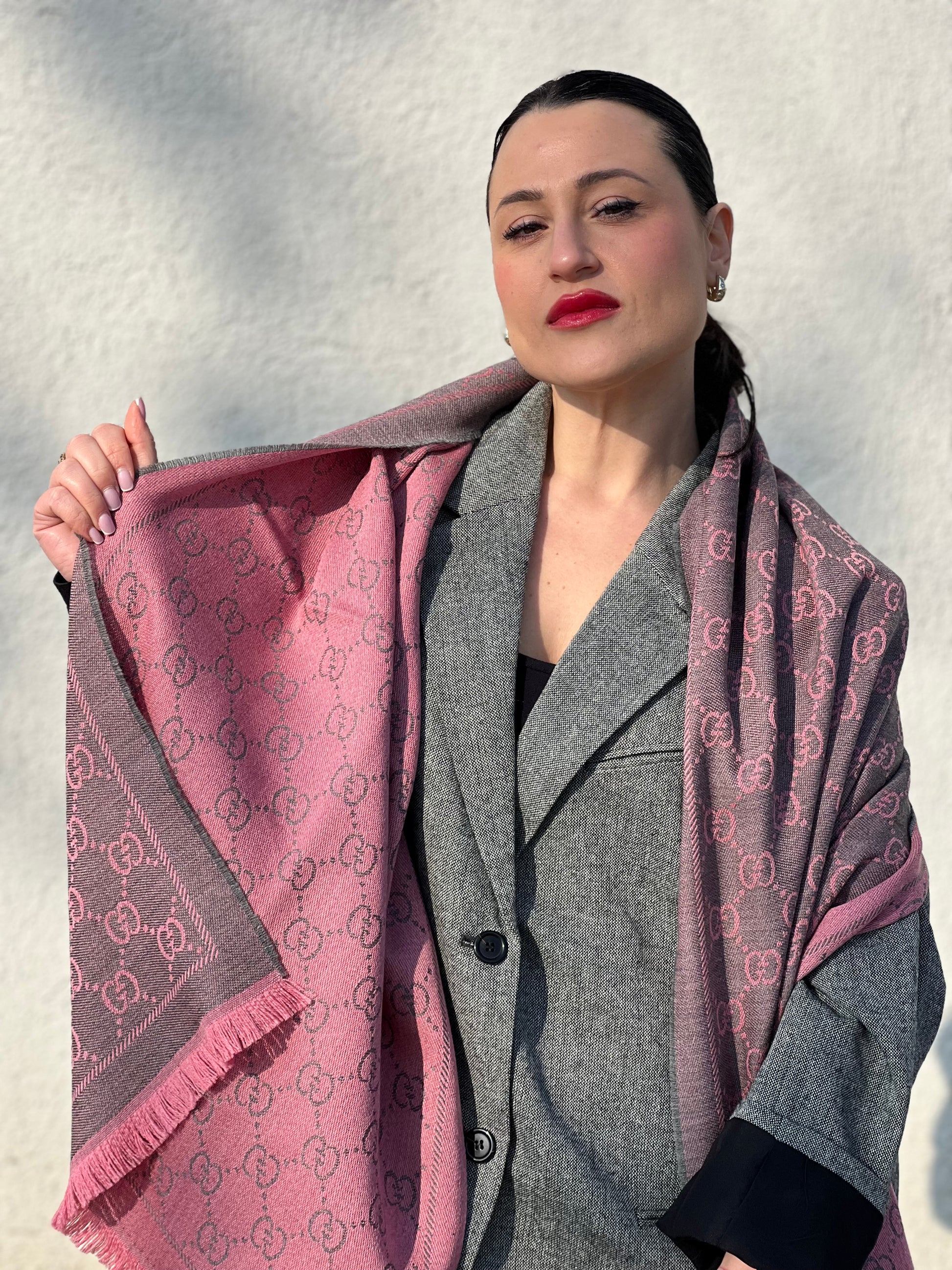 Descrizione: Sciarpa Gucci reversibile in 100% lana rosa e grigia, con trama GG e sfrangiature sui bordi. Munita di cartellino.