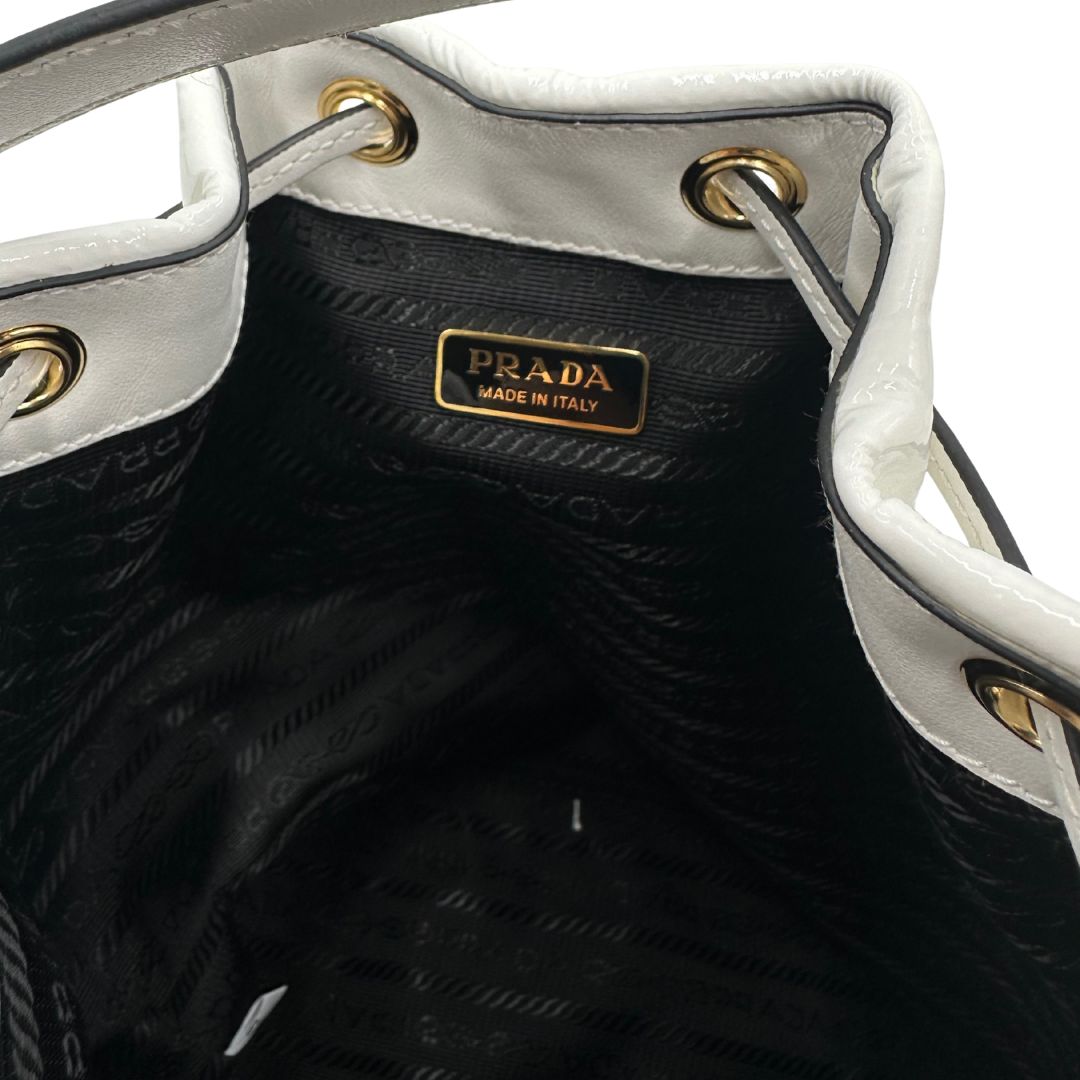 Descrizione: Secchiello Prada in pelle verniciata bianca con parti metalliche dorate; munito di un manico singolo e una tracolla amovibile e regolabile.