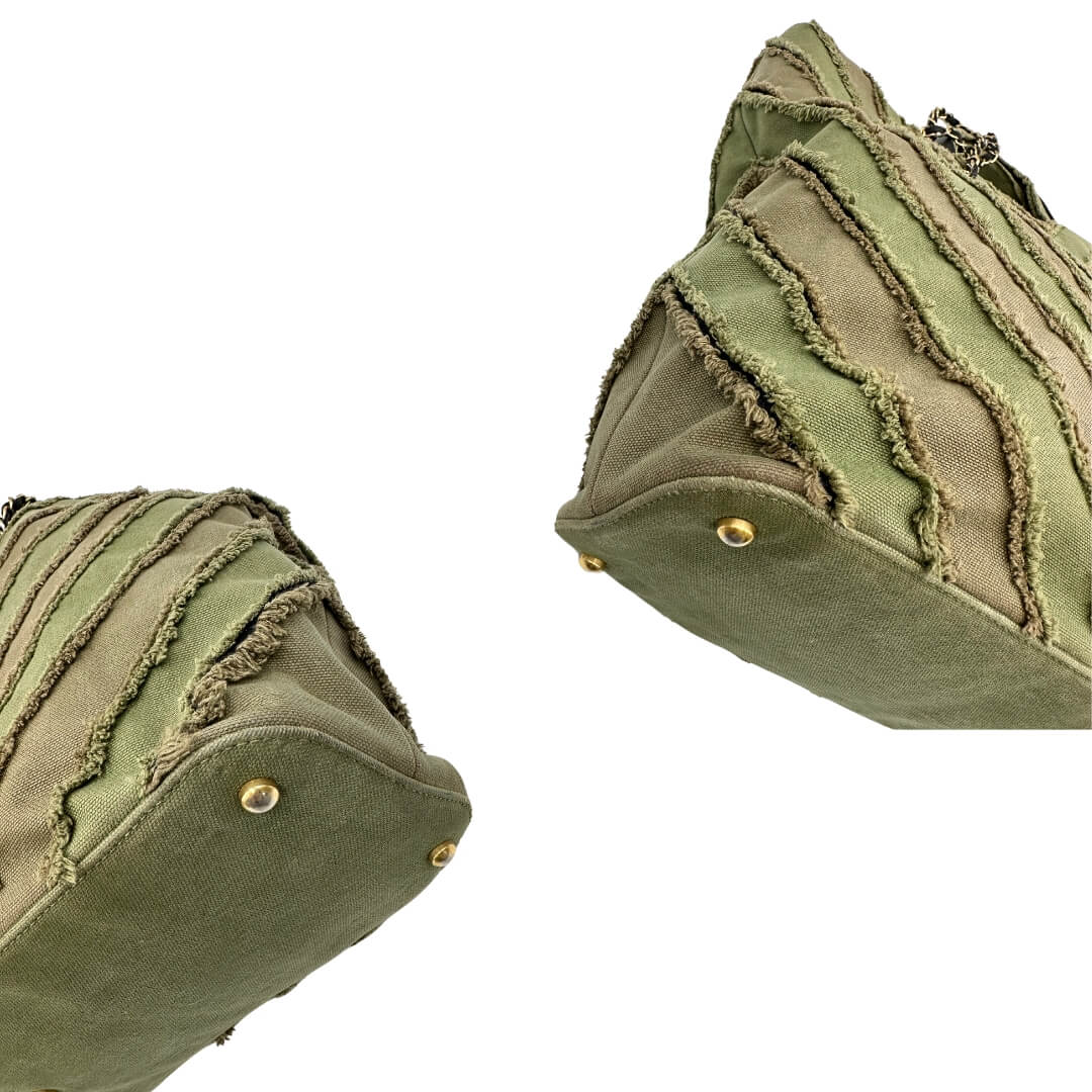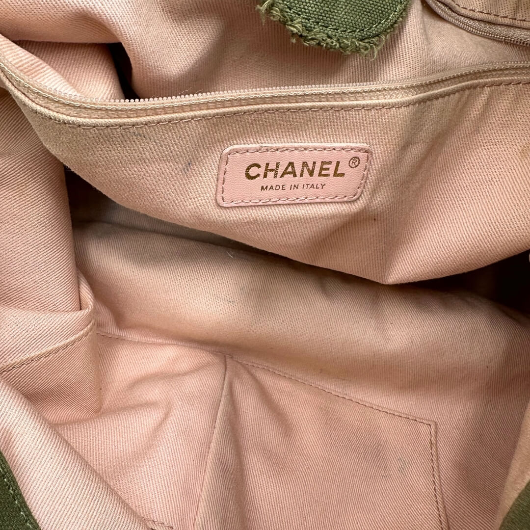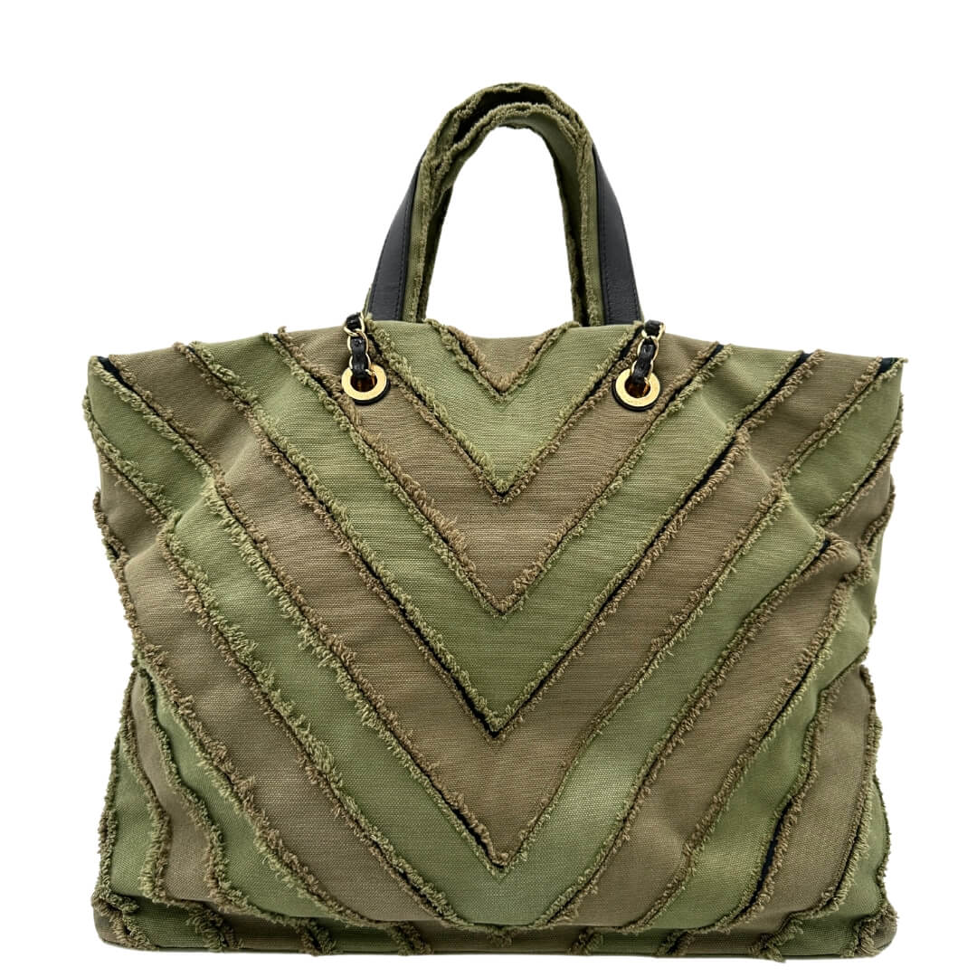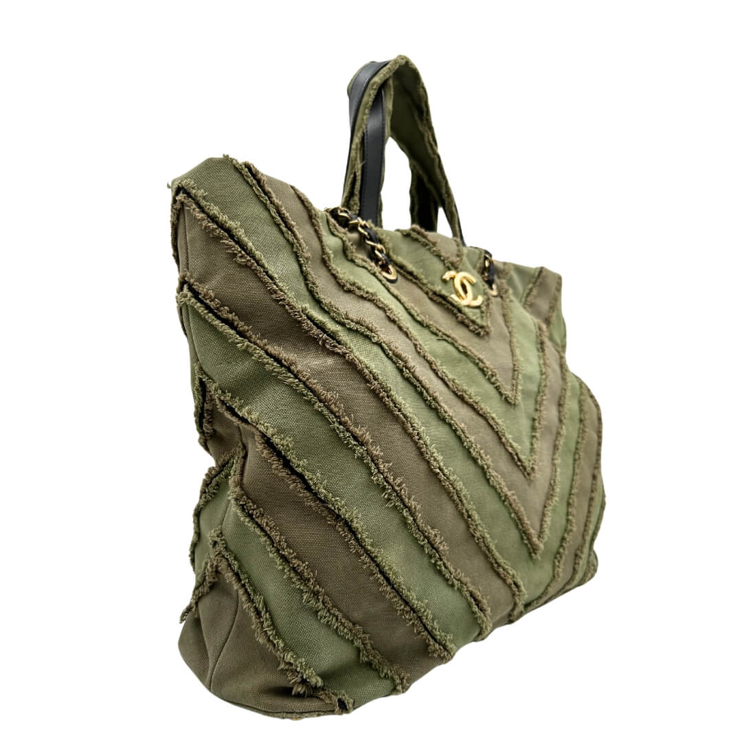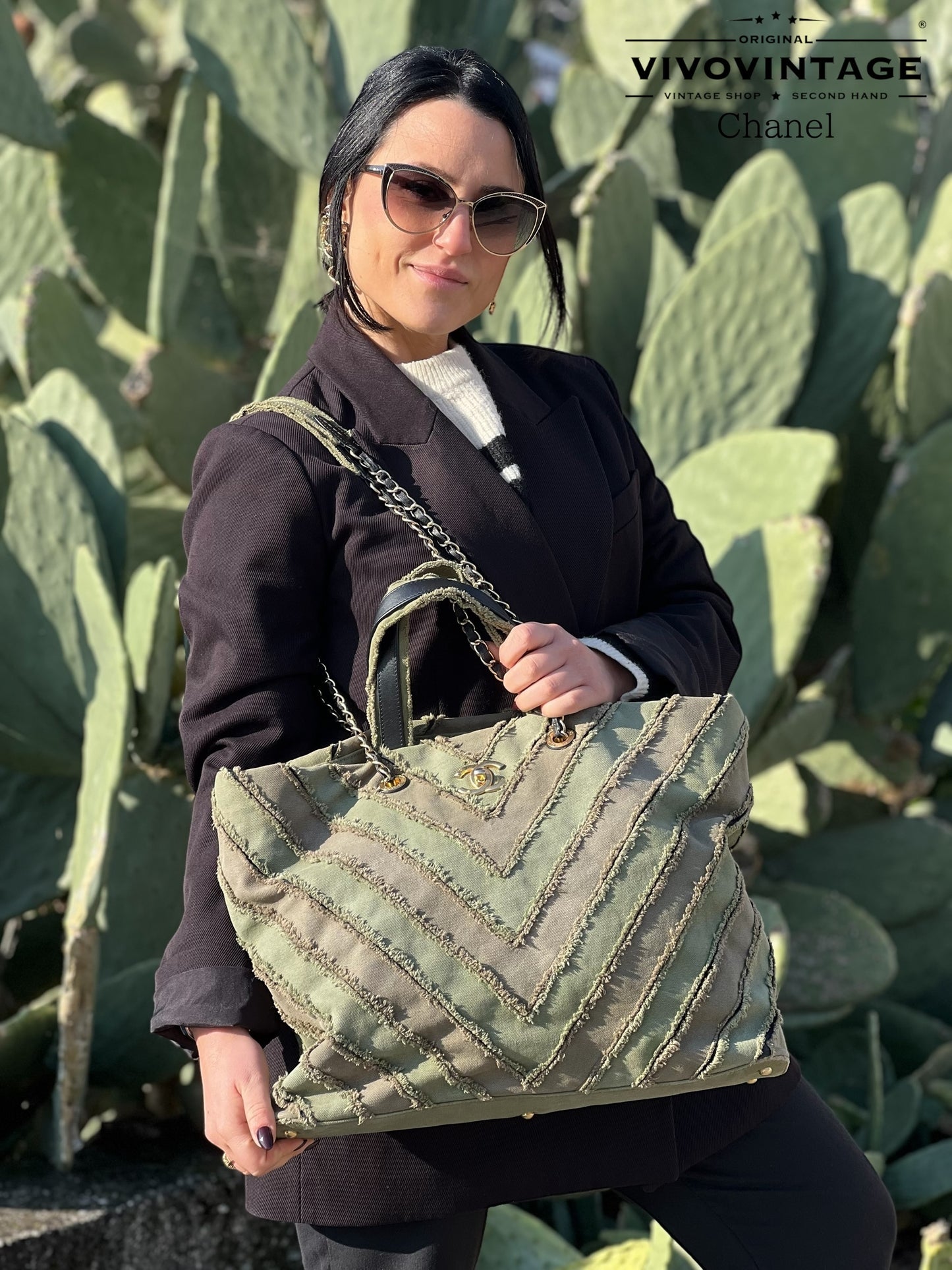 Descrizione: Borsa Chanel in tessuto verde kaki, con finiture in pelle nera e metalleria dorata. Da indossare a spalla oppure a mano.