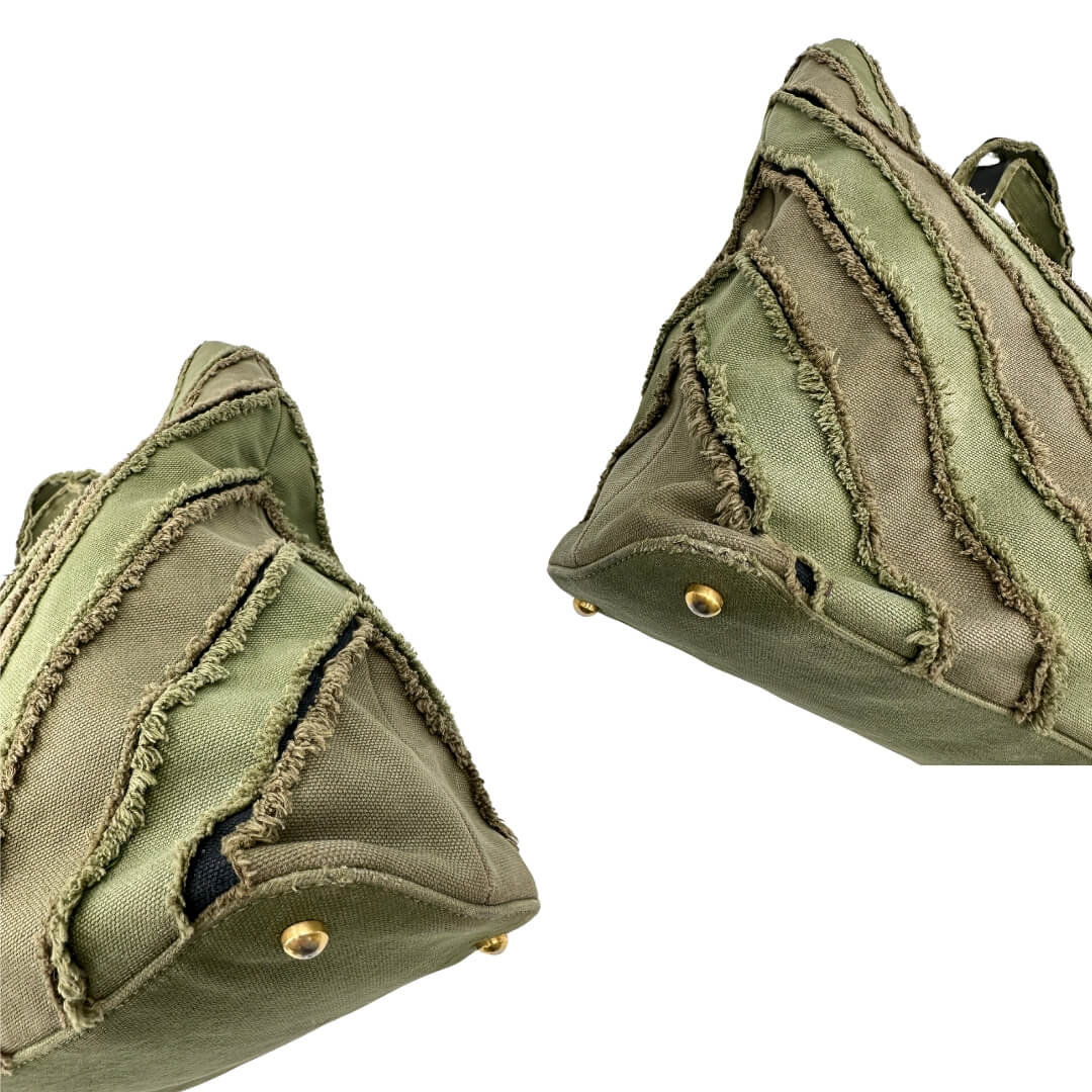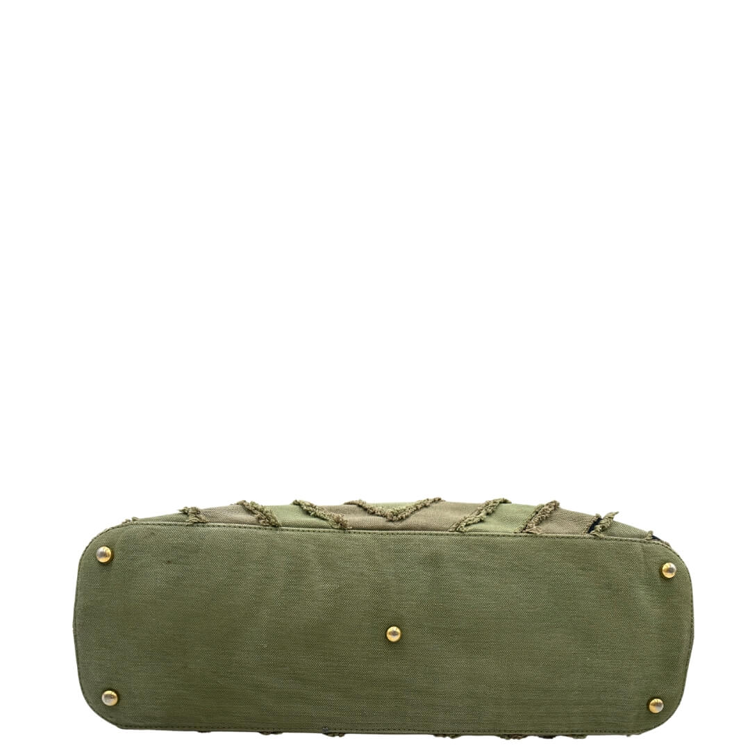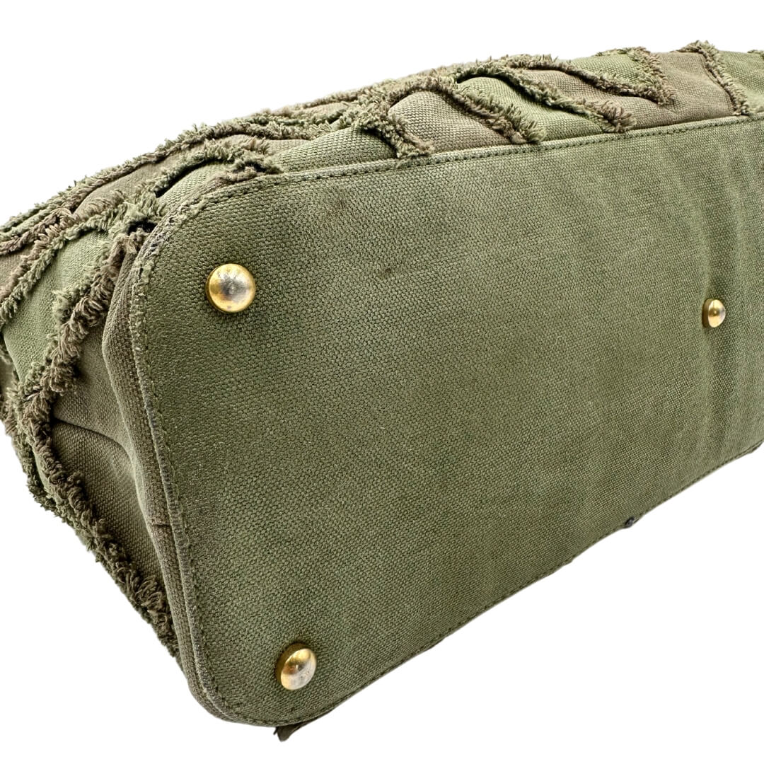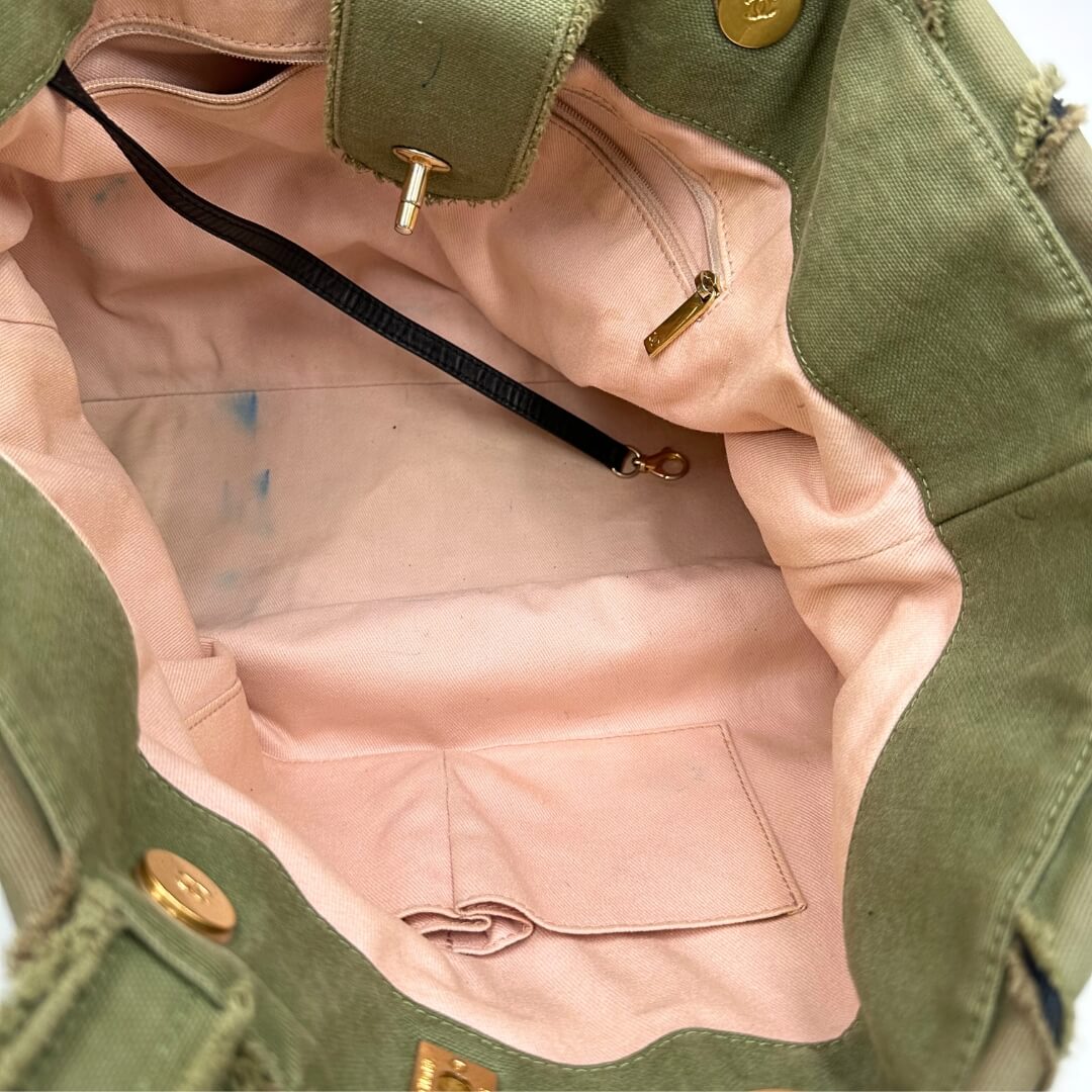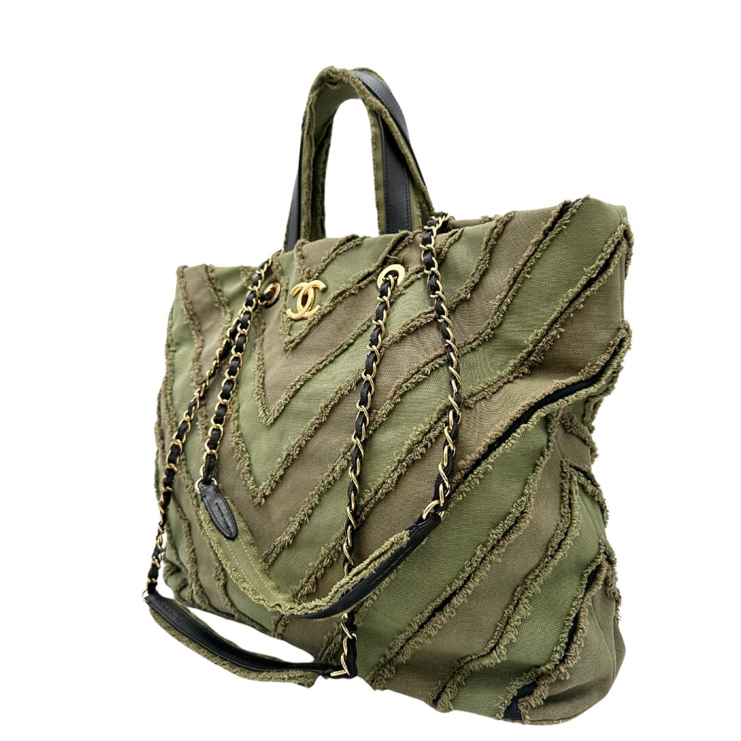 Descrizione: Borsa Chanel in tessuto verde kaki, con finiture in pelle nera e metalleria dorata. Da indossare a spalla oppure a mano.