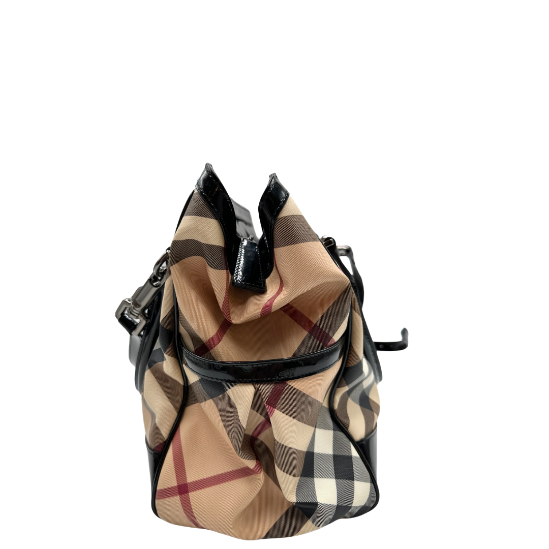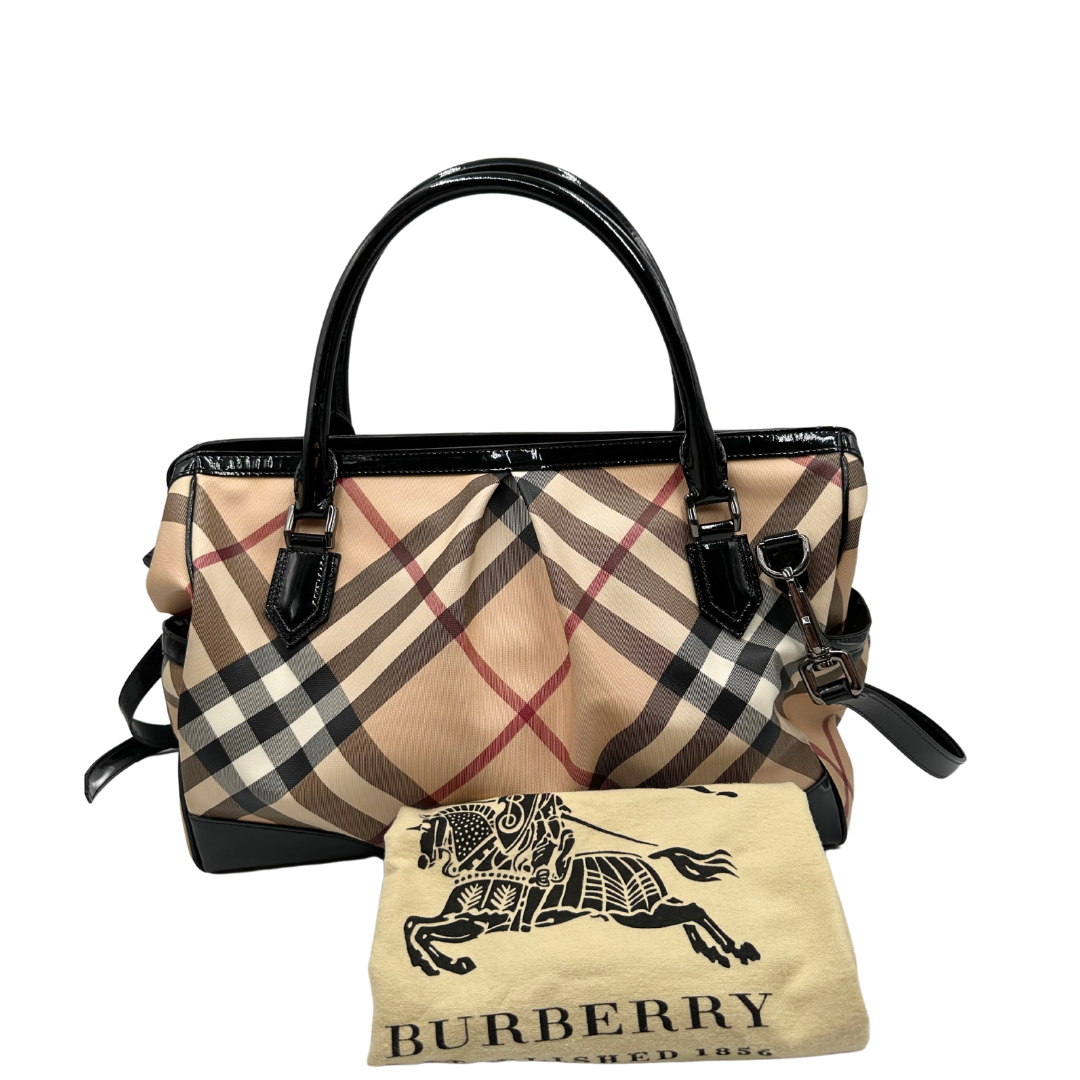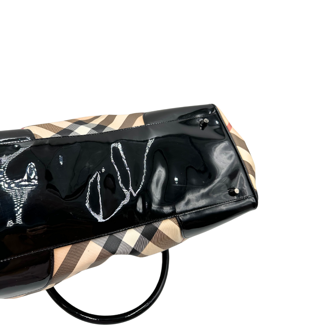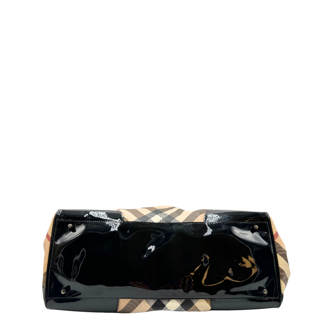 Descrizione: Shopper Burberry in canvas trama Tartan con dettagli in vernice nera lucida. Munita di doppi manici stondati e tracolla amovibile e regolabile; dettagli in metalleria effetto renio. Completa di dustbag.