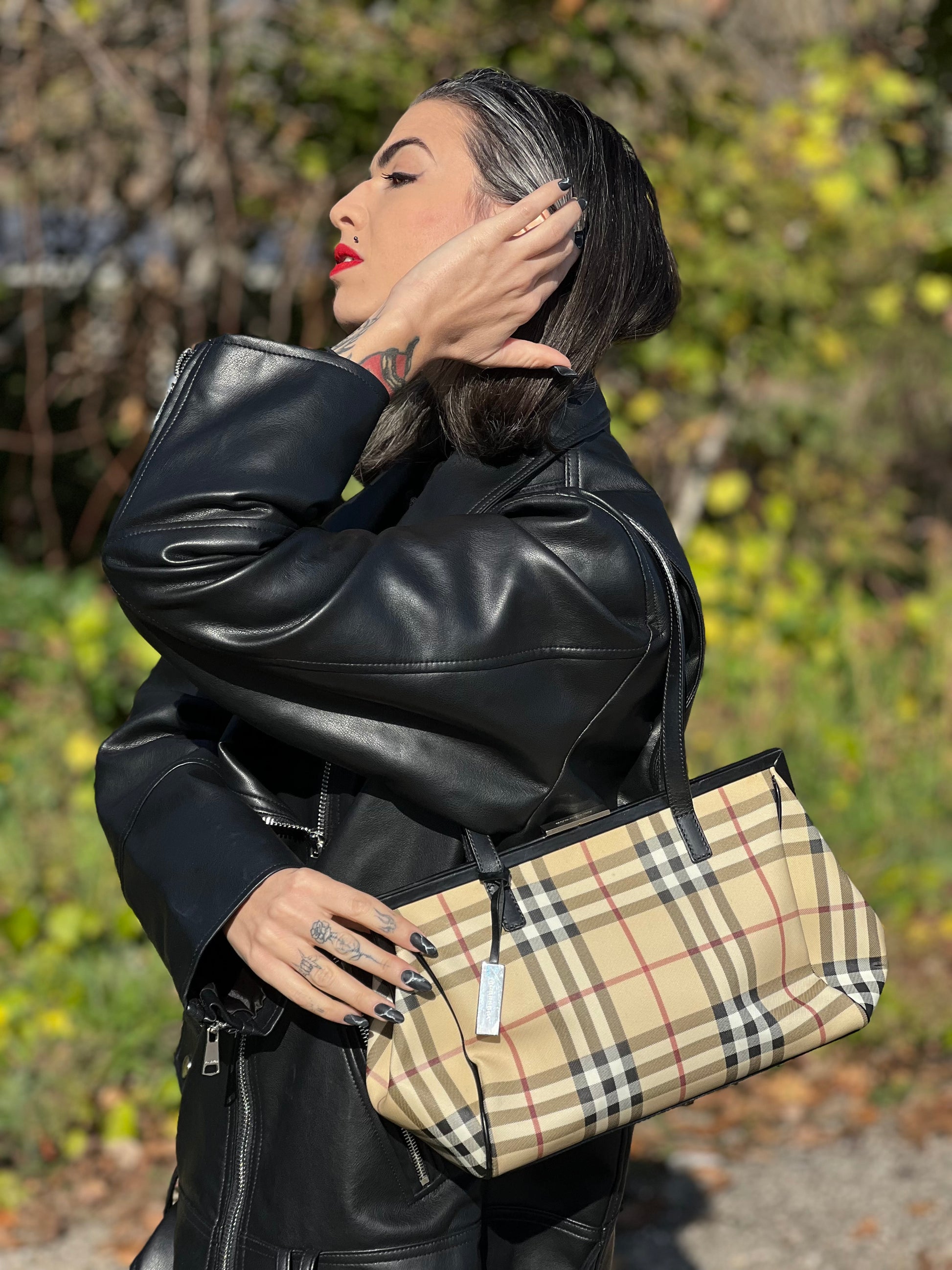 Descrizione: Borsa Burberry in canvas trama tartan sui toni del beige con finiture in pelle nere e parti metalliche argentate; munita di doppi manici, indossabile a spalla. Munita di cartellino