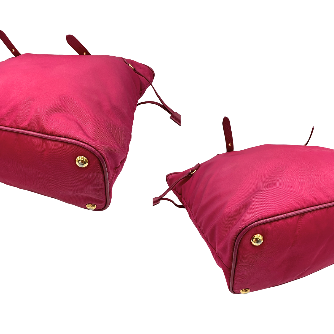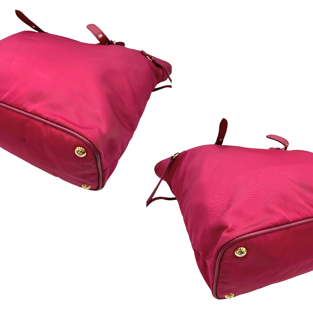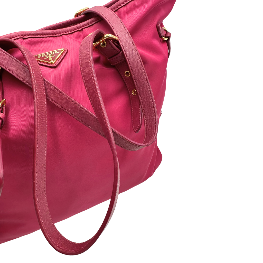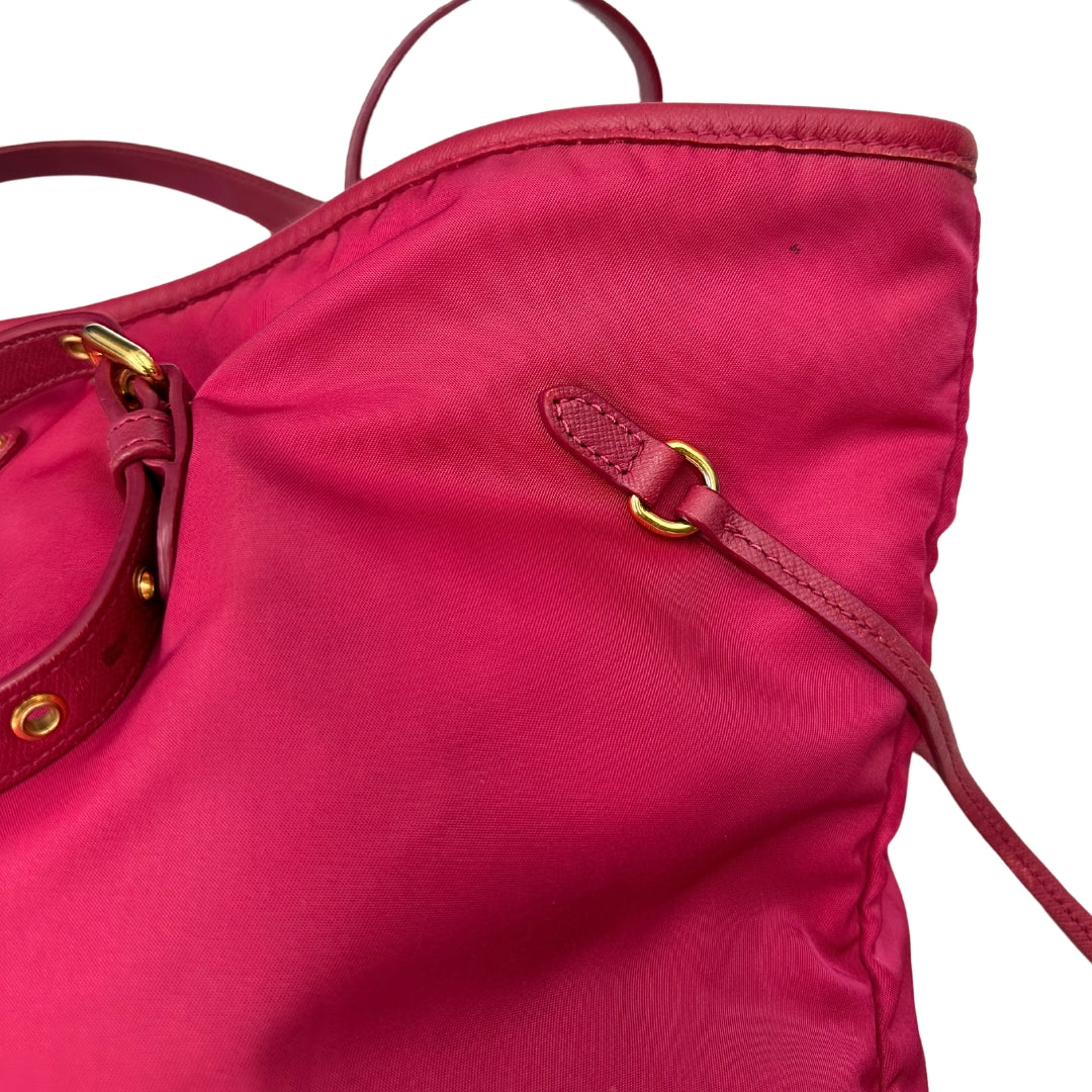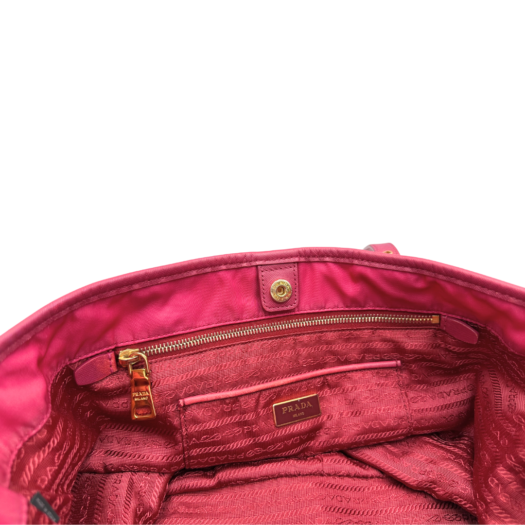 Descrizione: Shopper Prada in nylon fucsia con finiture in pelle saffiano tono su tono e parti metalliche dorate; da indossare a spalla. Completa di dustbag