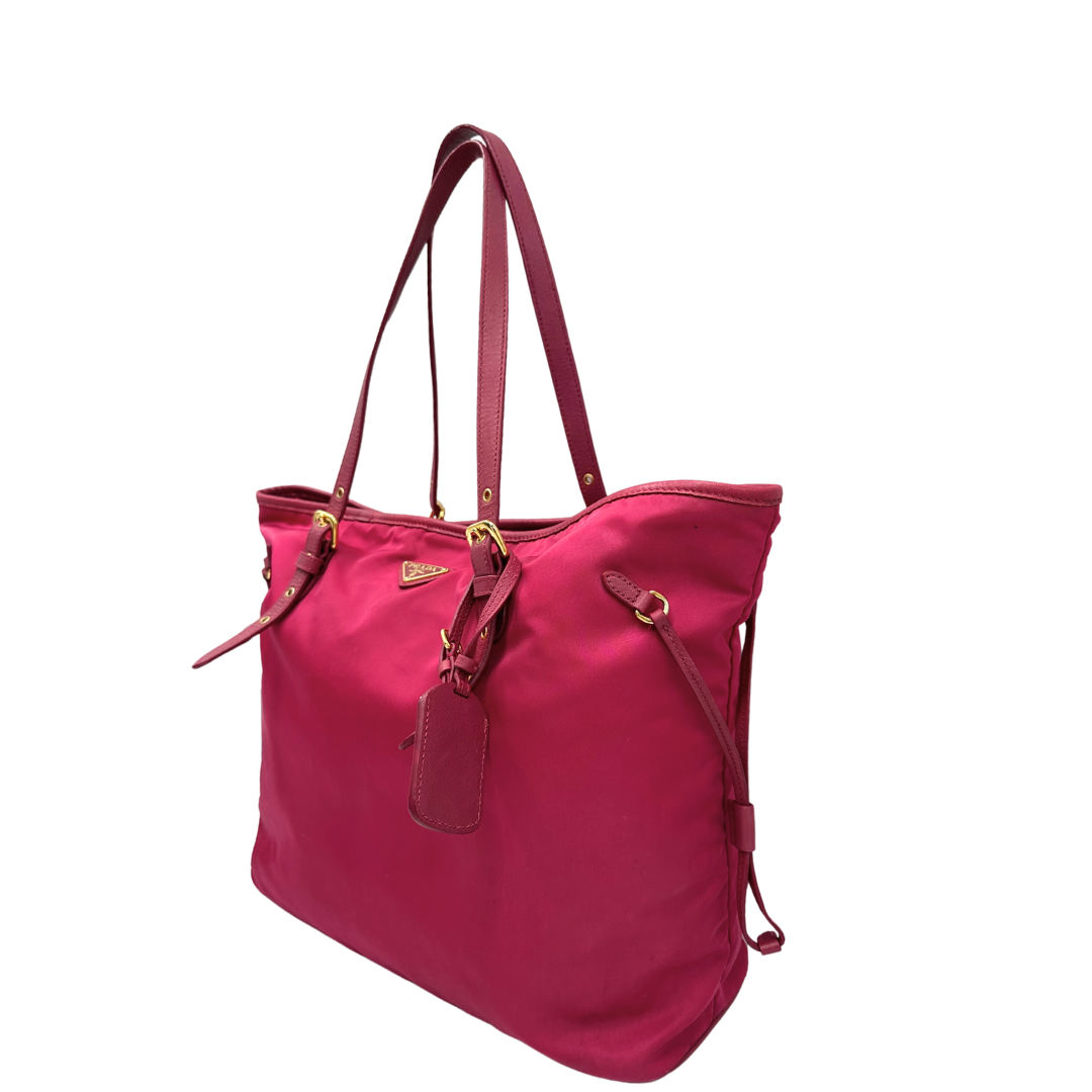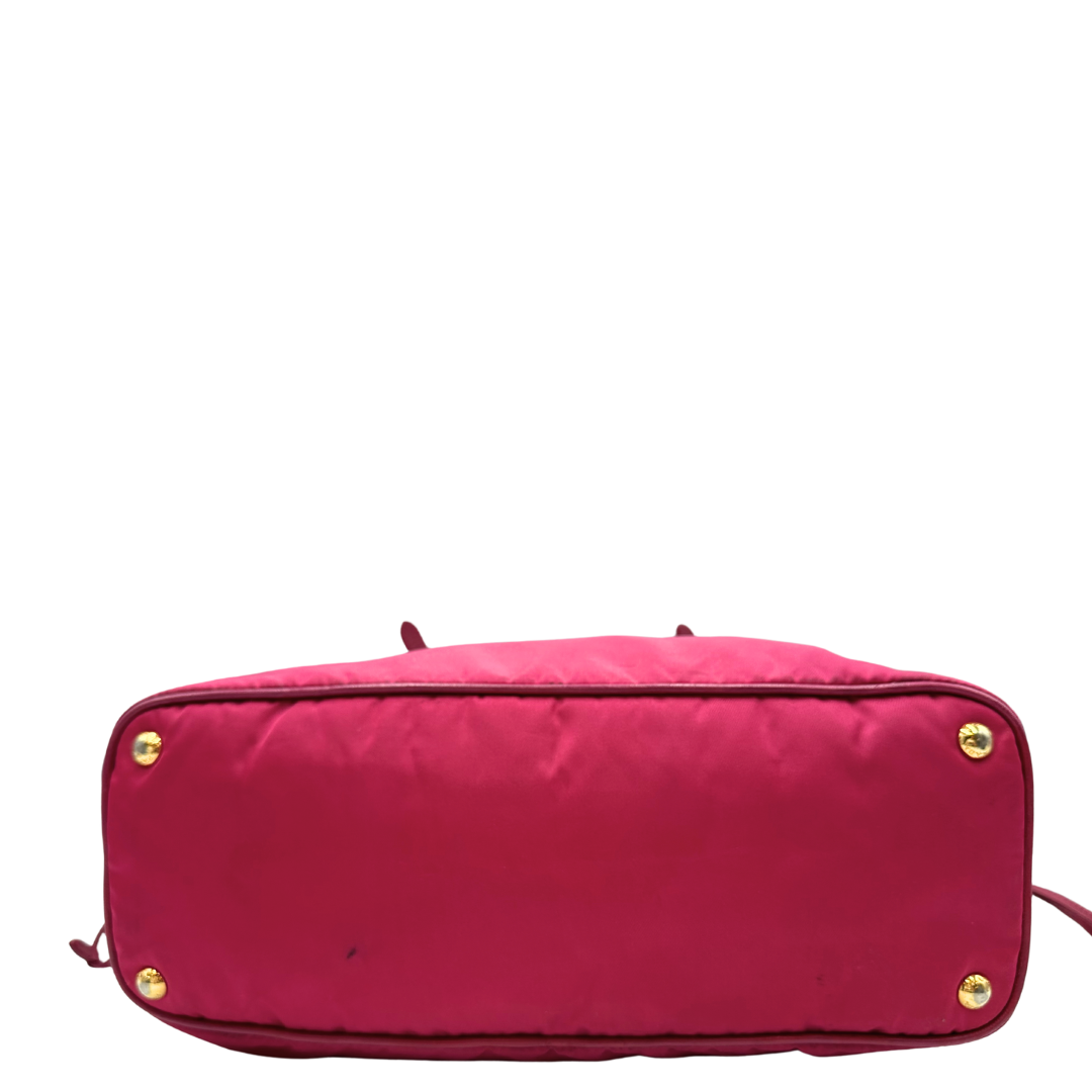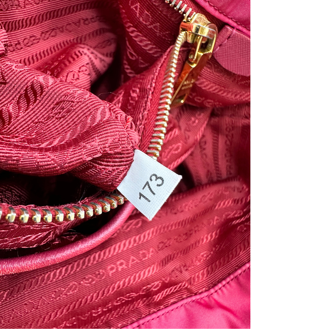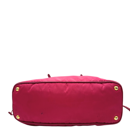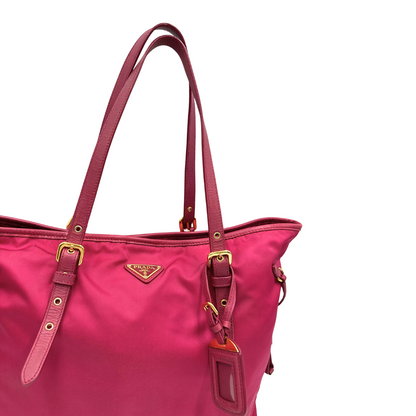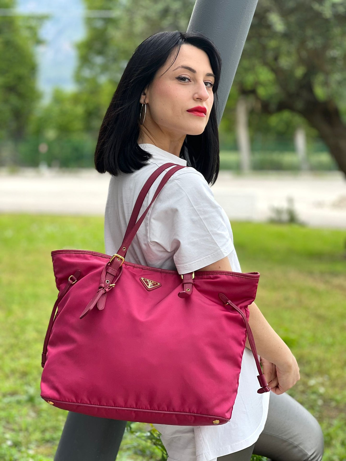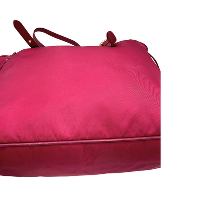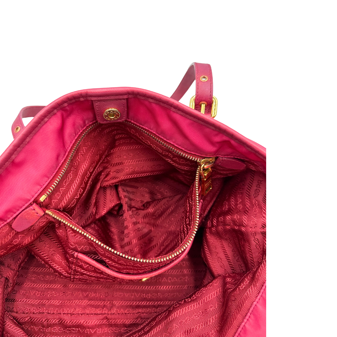 Descrizione: Shopper Prada in nylon fucsia con finiture in pelle saffiano tono su tono e parti metalliche dorate; da indossare a spalla. Completa di dustbag